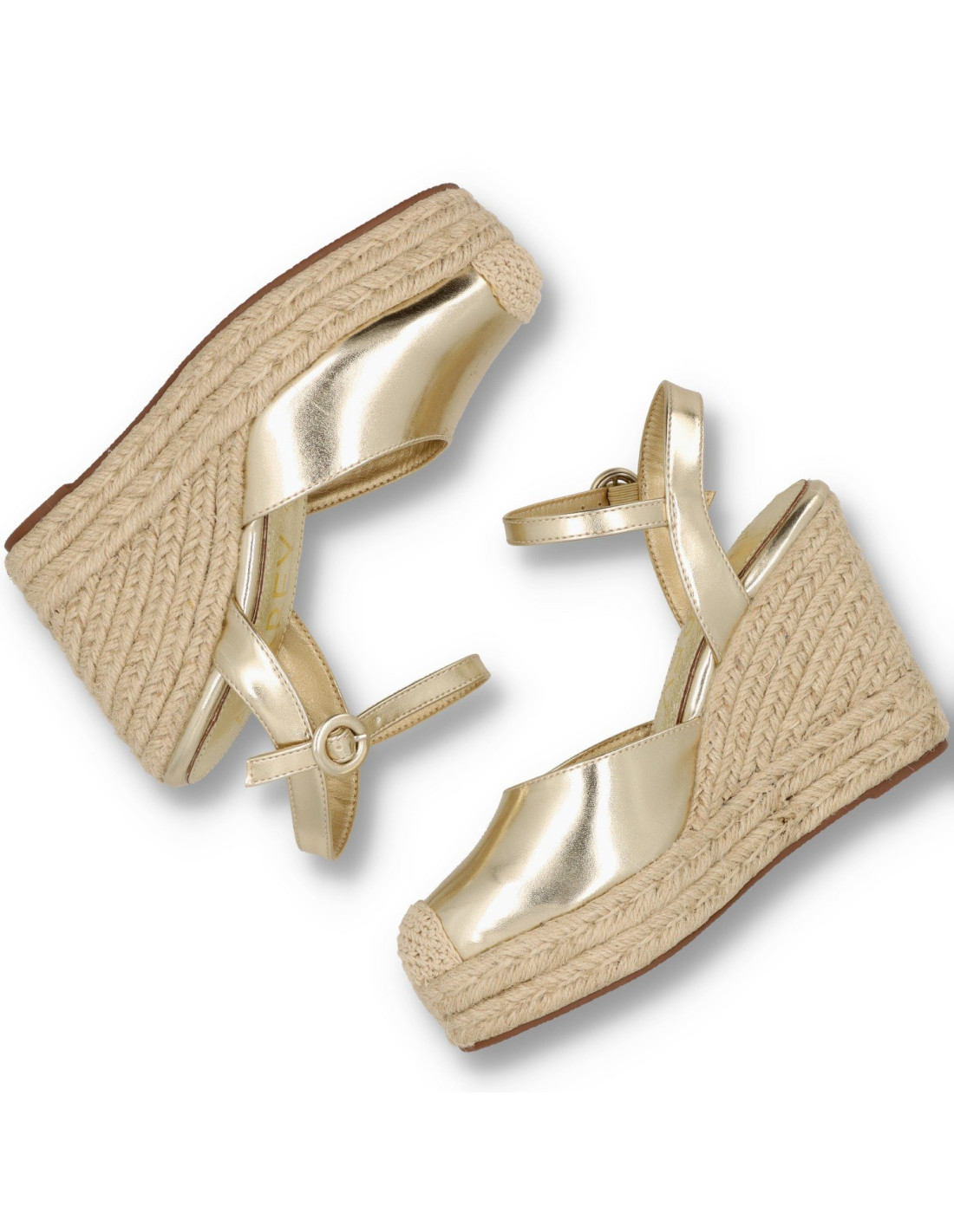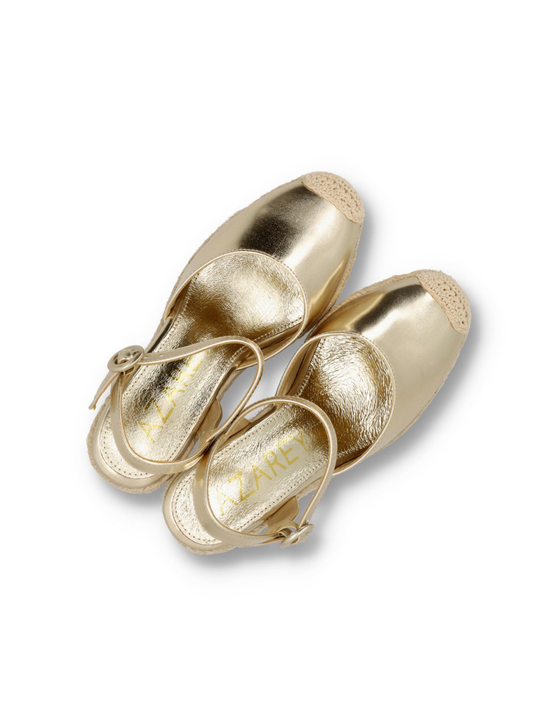 Alpargatas de cuña para MUjer 494J475 de Azarey. De PU LEATHER acabado metalizado y planta de piel acolchada, para una pisada comoda y confortable. Cuña de unos 10cm de altura en yute natural y plataforma delantera de unos 3cm. Talón pulsera concierre de hebilla ajustable.