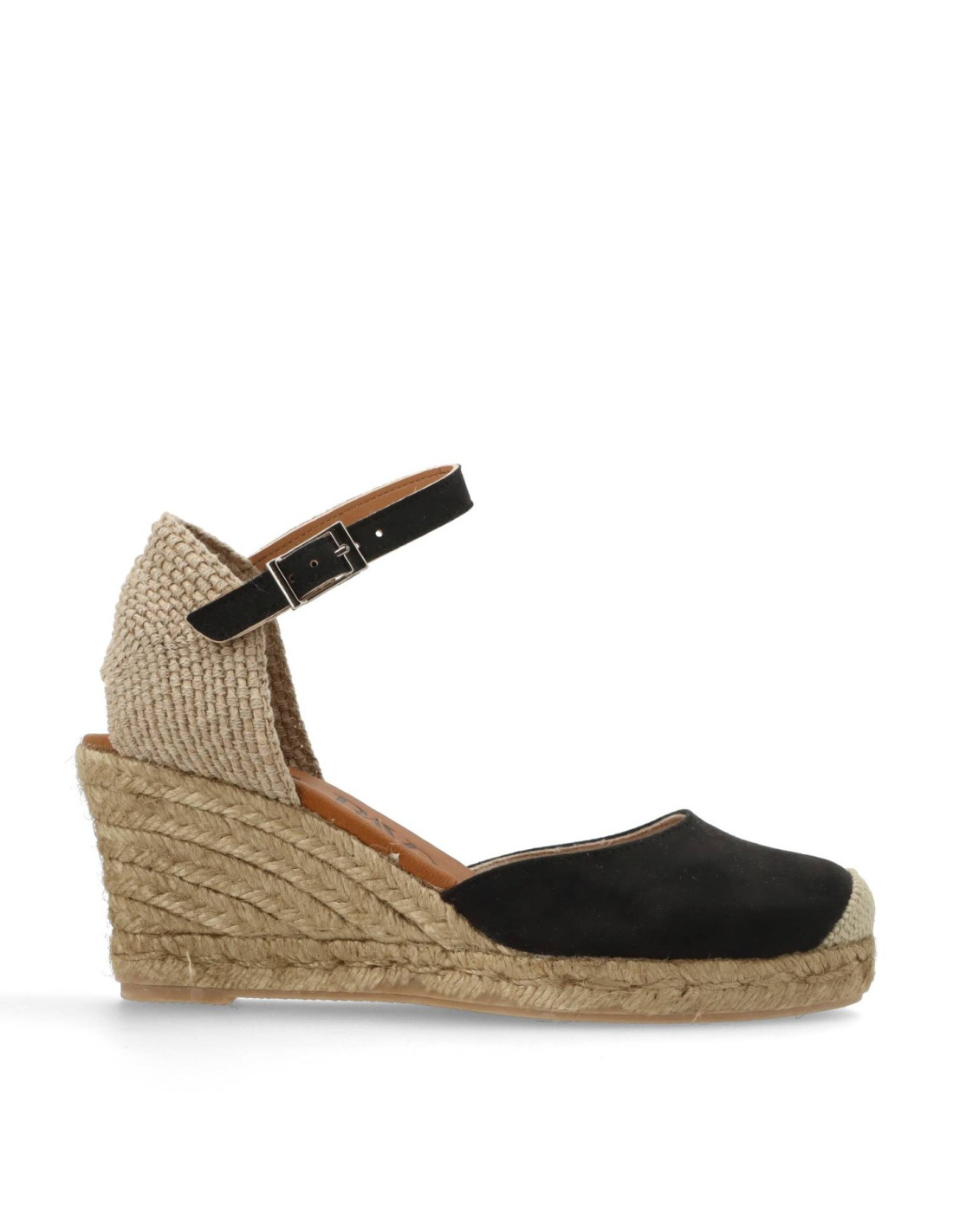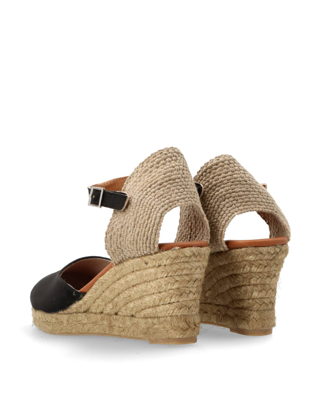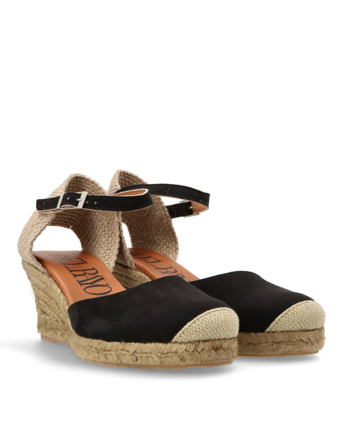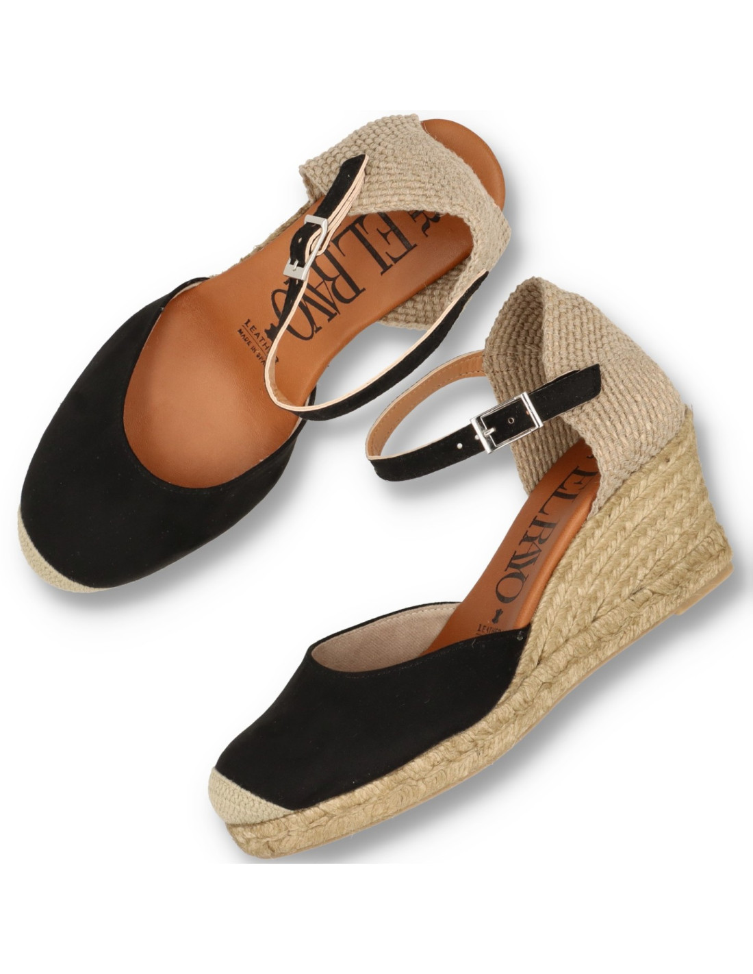 Alpargatas de cuña 4004-A de RAYO NATURE. Cuñas de esparto natural para mujer de unos 6 cm de altura. Fabricadas en simil ante color Negro, detalle cosido en la puntera. En el interior tiene la planta de gel forrada de piel para una comodidad total de cara a la temporada de verano.Talón de pulsera tira piel con hebilla.FABRICADOS EN ESPAÑA.