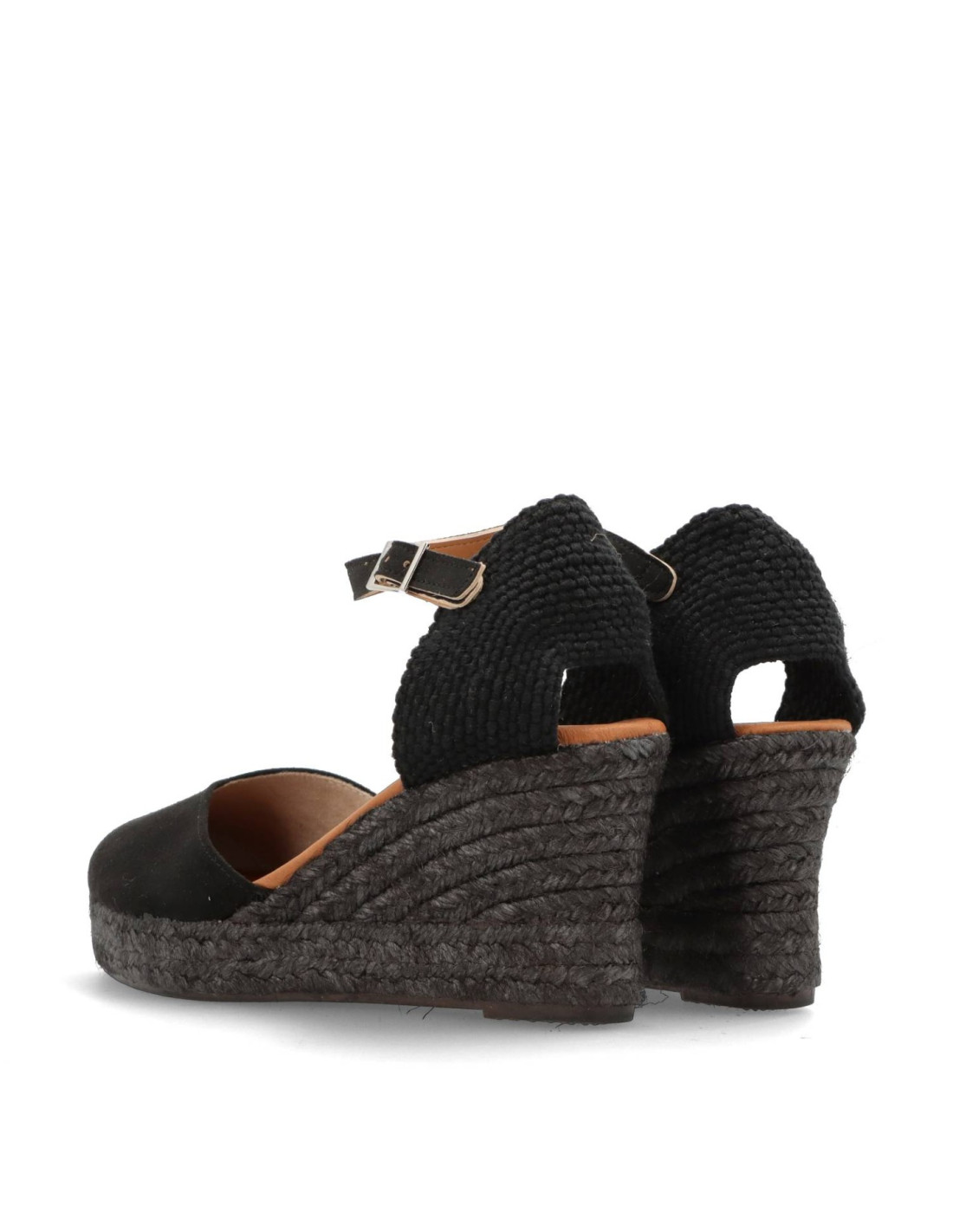 Alpargatas de mujer modelo 6003-A de RAYO NATURE. Alpargata con talón de pulsera, de ante sintético en color Negro. La cuña es alta sobre 8cm, pero lleva plataforma y la planta es de piel y acolchada de gel, con lo que le confiere un extra de comodidad. Son ideales para cualquier look de verano aportadon un aire chic. FABRICADO EN ESPAÑA.