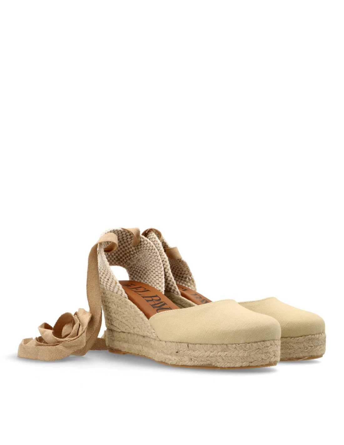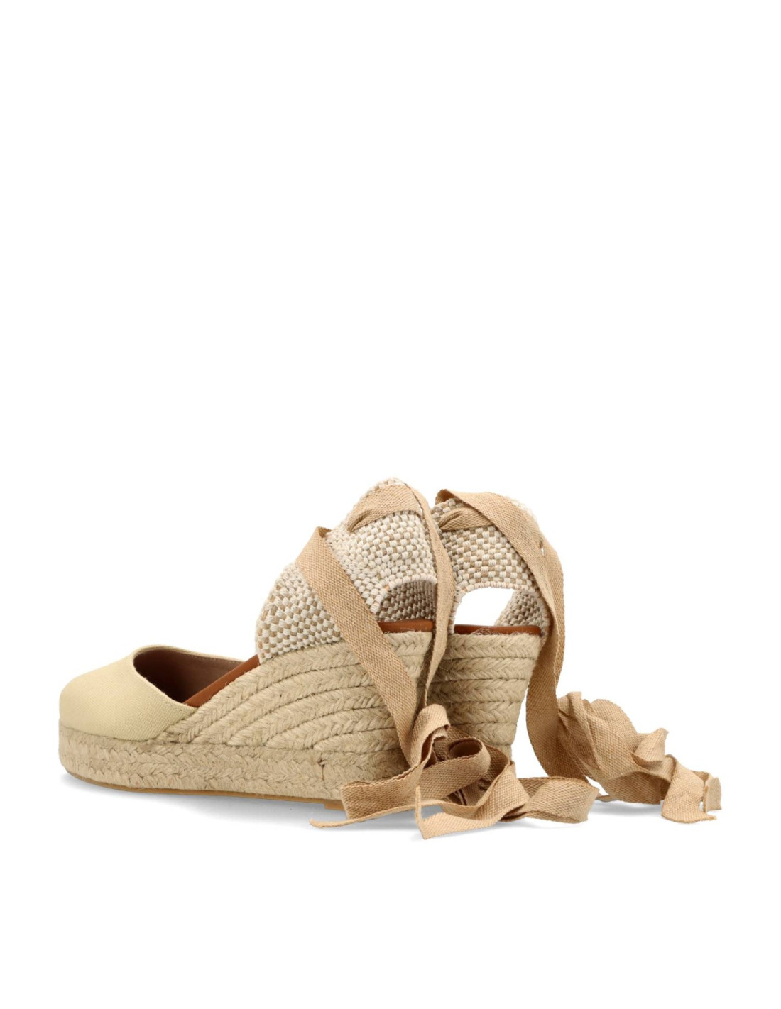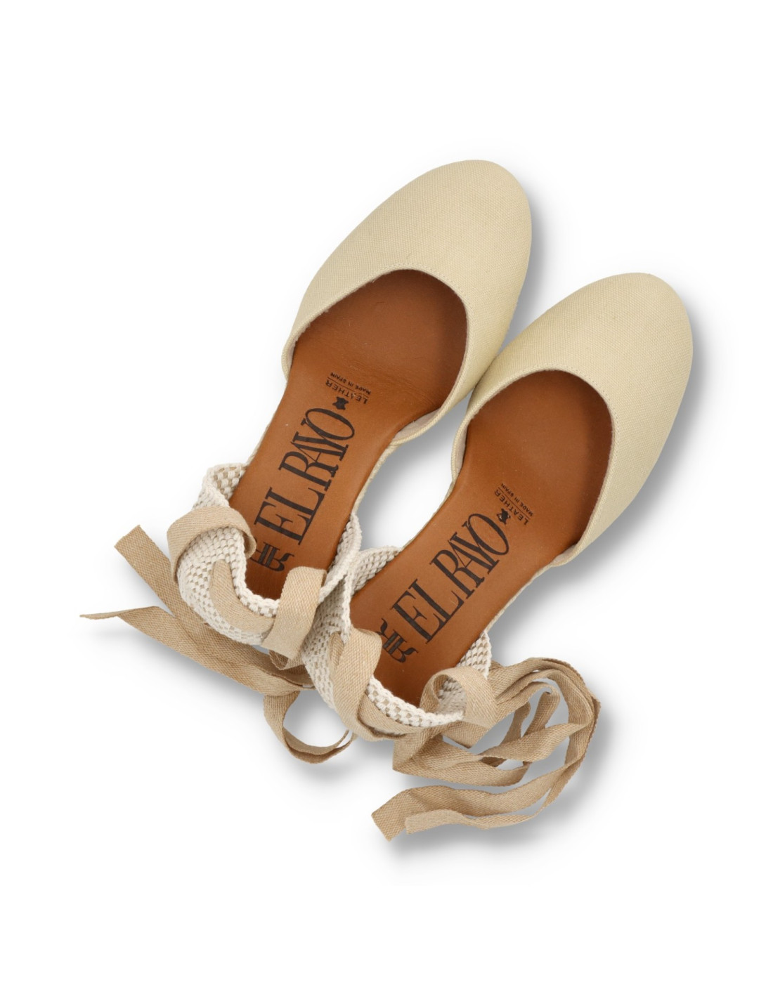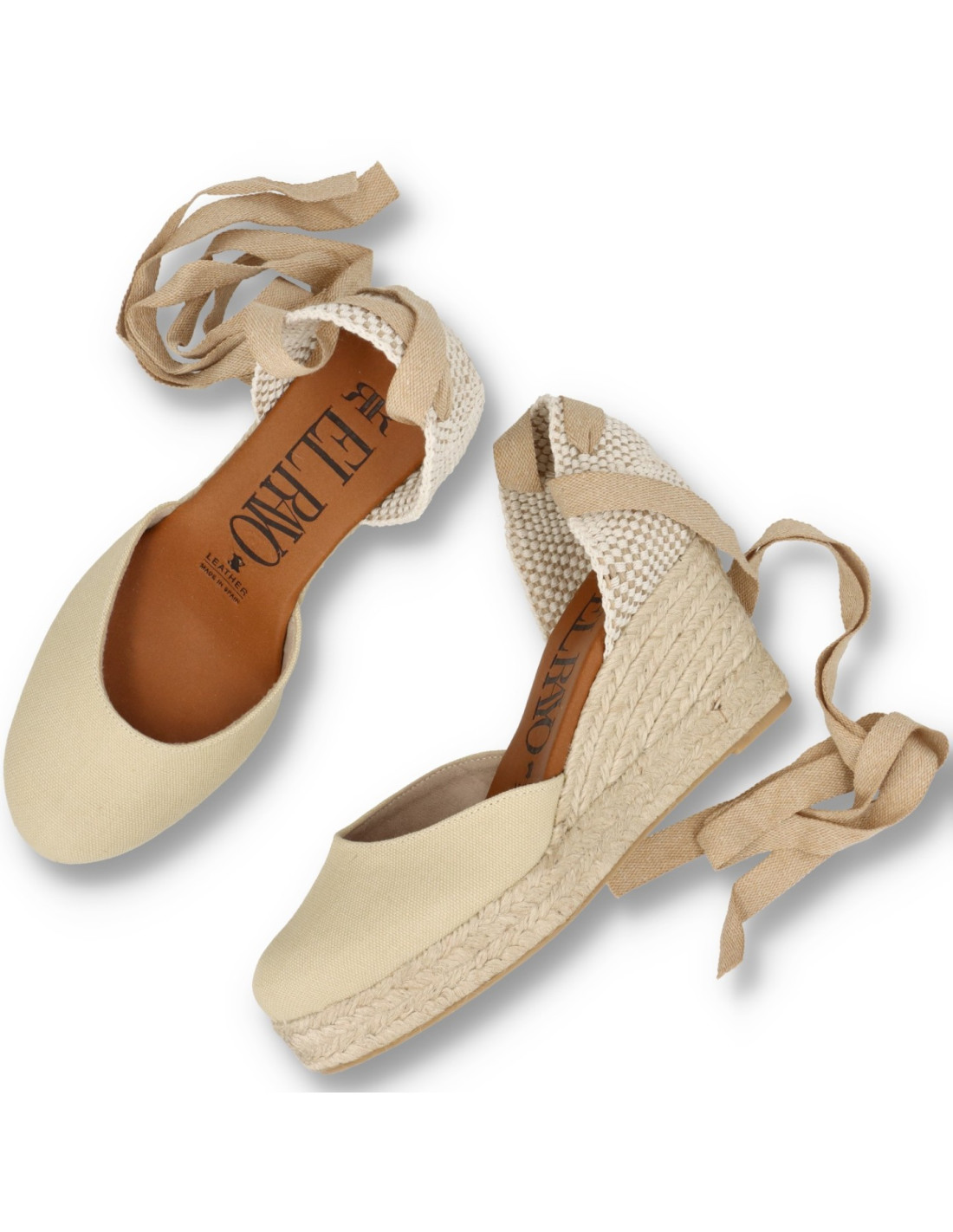 Alpargatas con cuña de mujer 6004PQV25 de RATO NATURE.Espadrilles clasicas de lona color Crudo con talón de cinta atada.Plantilla de gel forrada de piel, cuña de yute natural de unos 8cm de altura y 2cm plataforma delantera.HECHO EN ESPAÑA