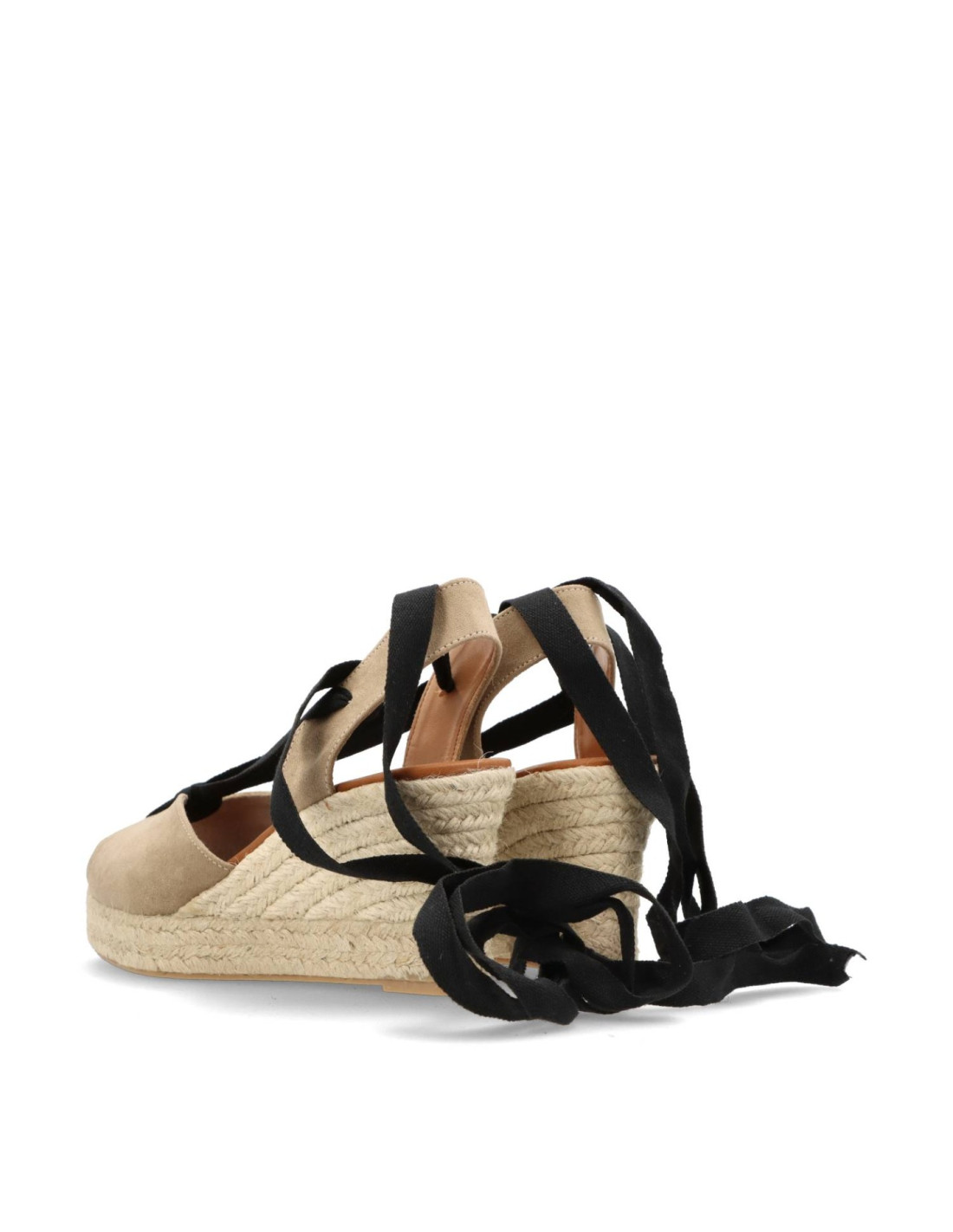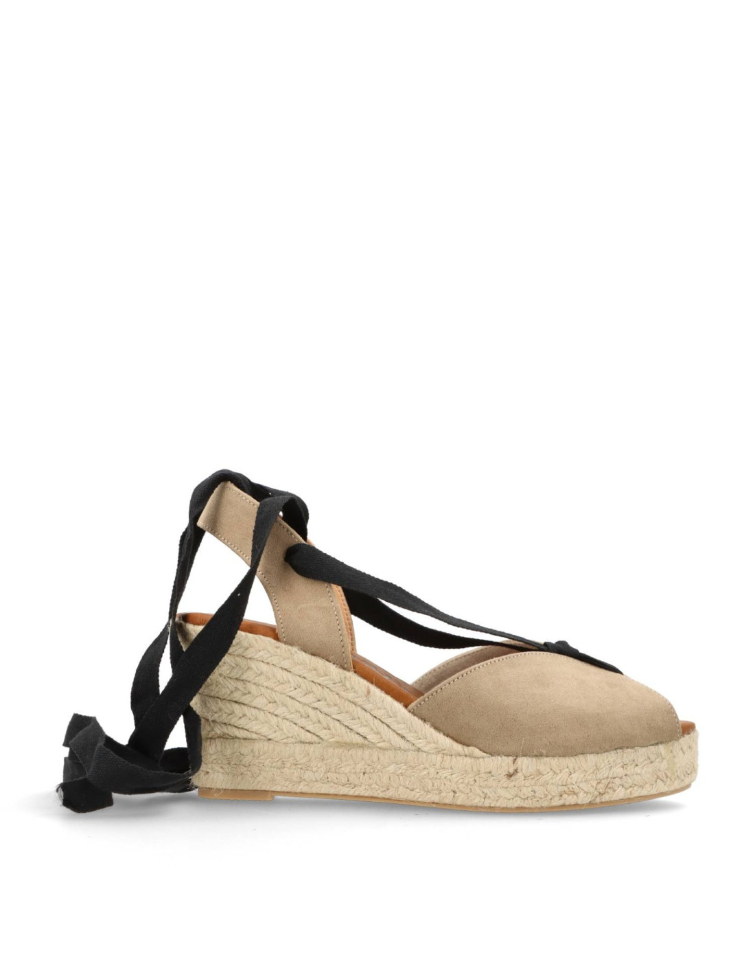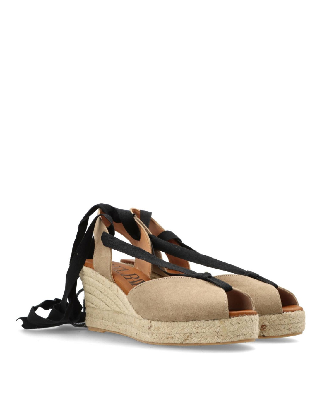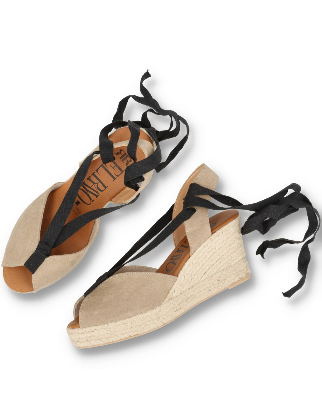 Alpargatas con cuña de mujer 6012 de RATO NATURE. Espadrilles clasicas de Piel 100%serraje en color Taupe con talón de cinta atada.Plantilla de gel forrada de piel, cuña de yute al tono de unos 8cm de altura y 2cm plataforma delantera.HECHO EN ESPAÑA