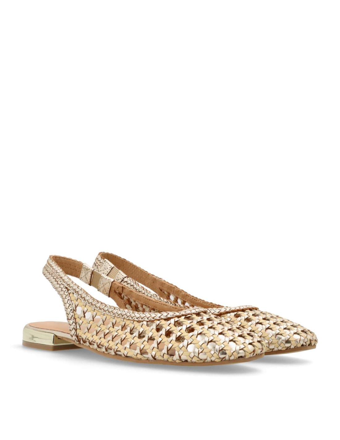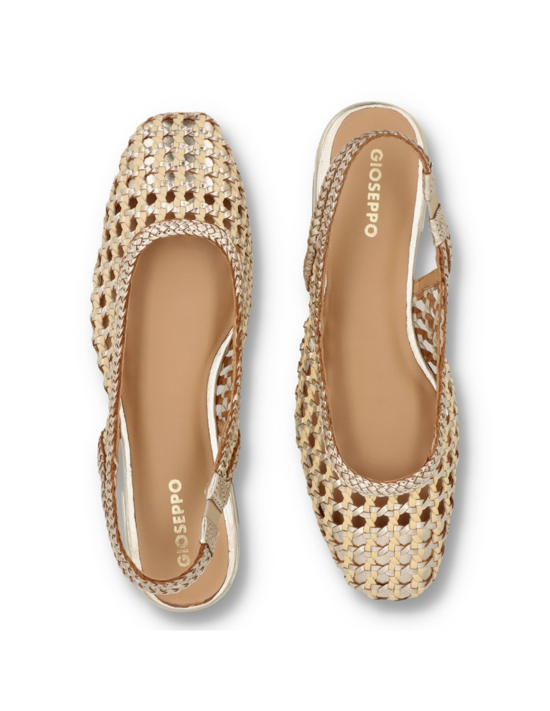 Bailarinas con tacón para mujer 79105-WEBDELL de Gioseppo. Bailarinas de piel metalizada con trenzado hecho a mano. Punta cuadrada. Tacón metalizado. Cuentan con planta acolchada y tira de sujeción en el tobillo. Altura tacón: 1,5 cm. Este modelo destaca por su flexibilidad y ligereza al prescindir de topes y contrafuertes.