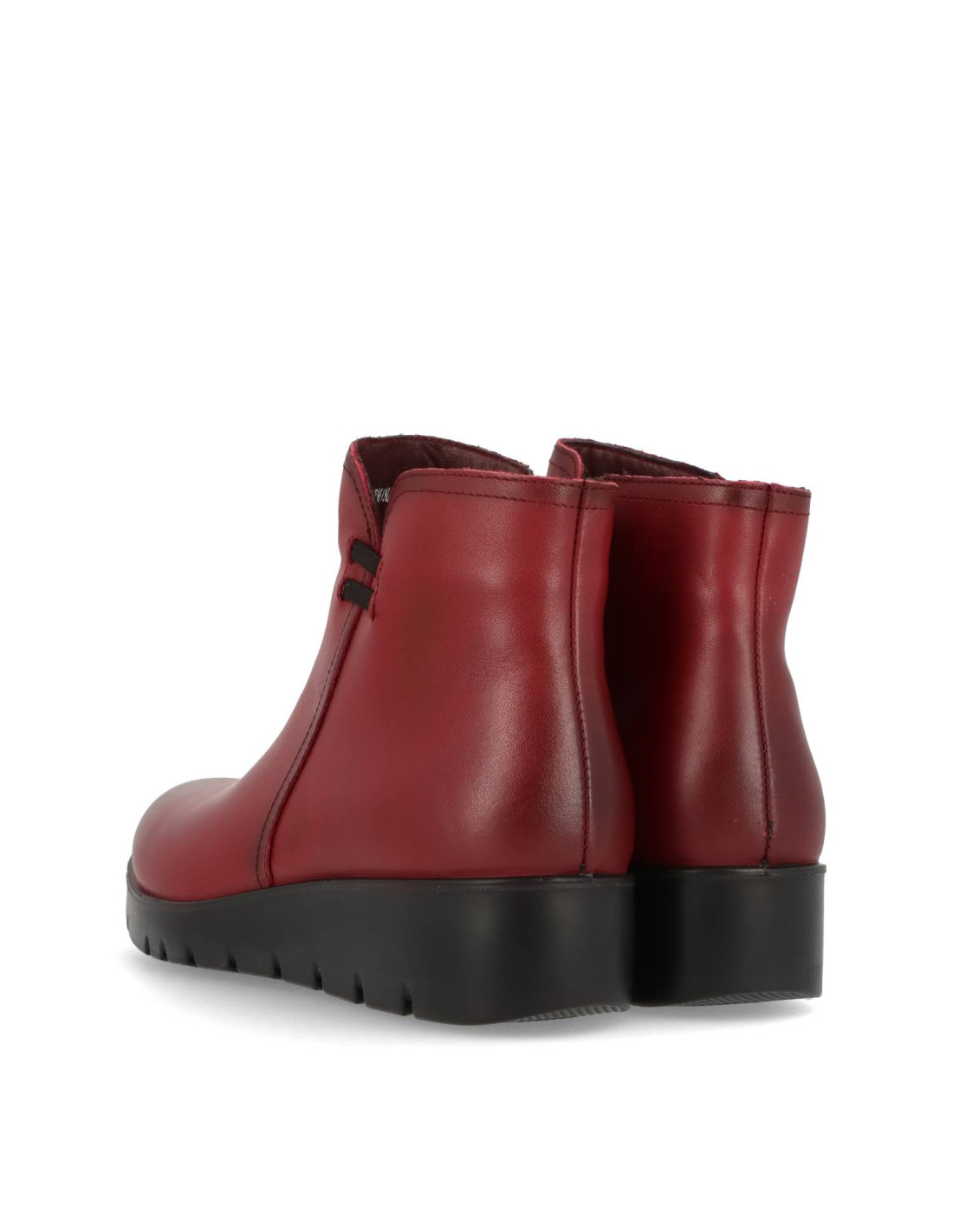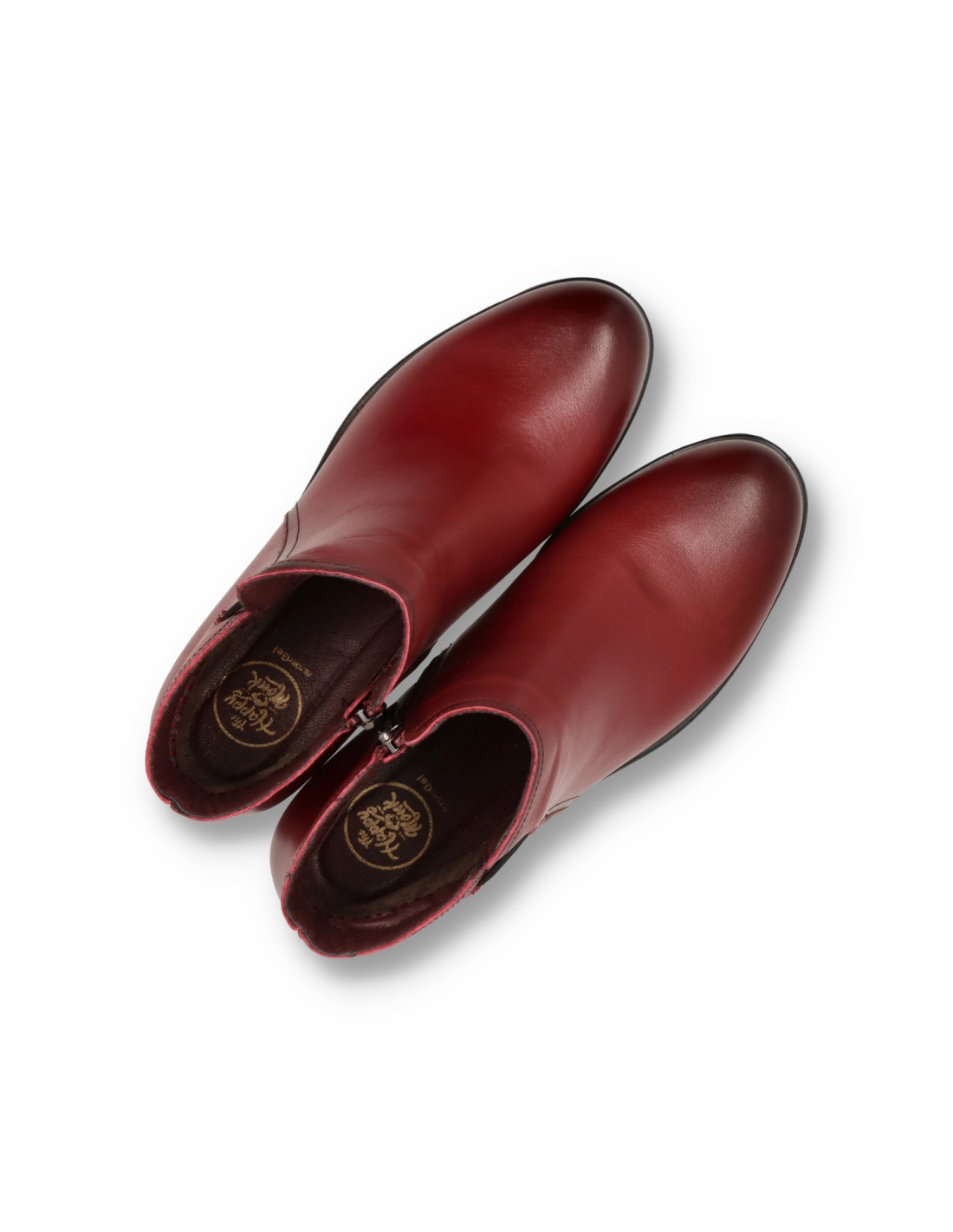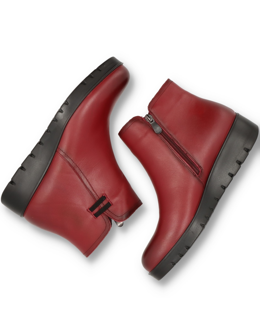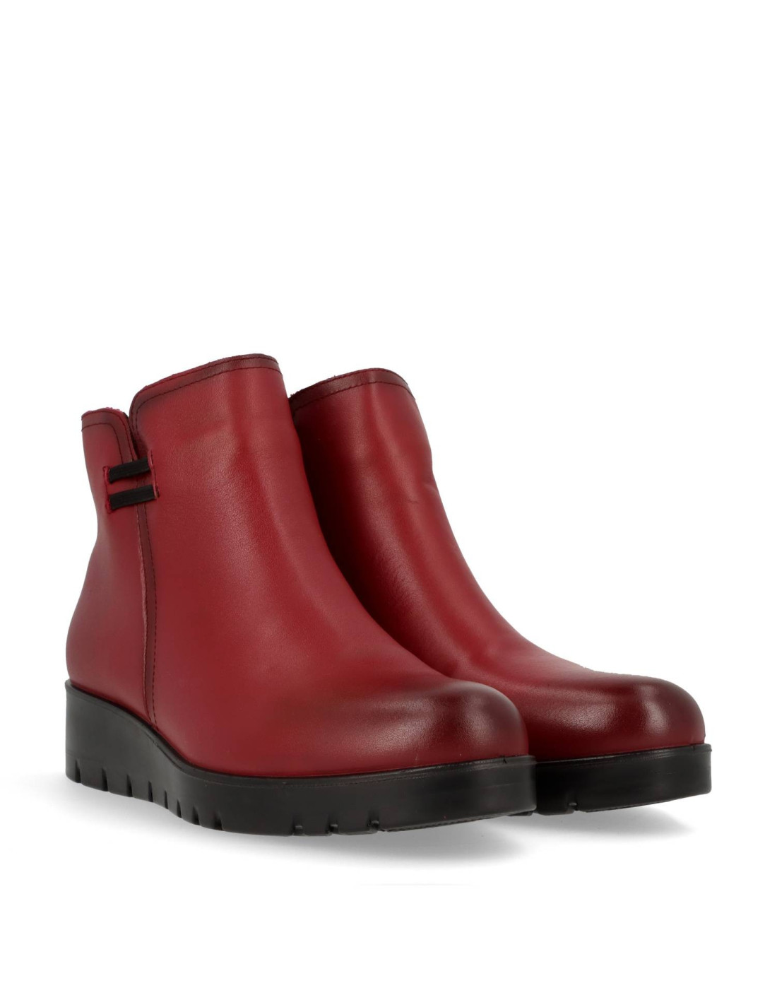 Botines con cuña de Mujer CARMINA016 THE HAPPY MONK. Fábricada en piel 100% Vacuno y suela de GOMA. Presentan un acabado brillante, ofreciendo una robustez y confort inigualables. Cuña de unos 4cm de altura con suela de goma ligera y flexible.