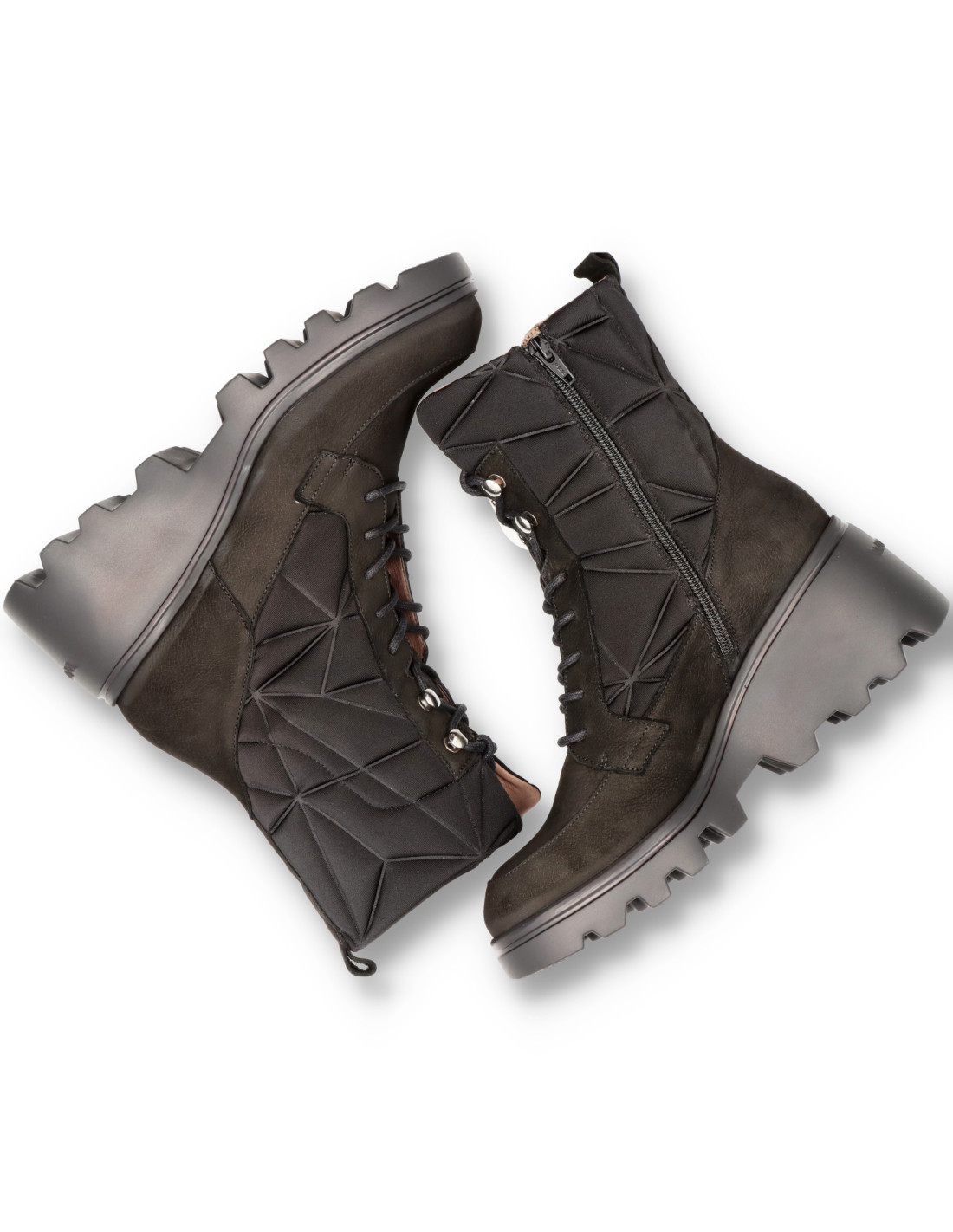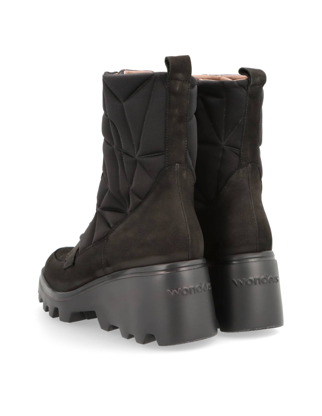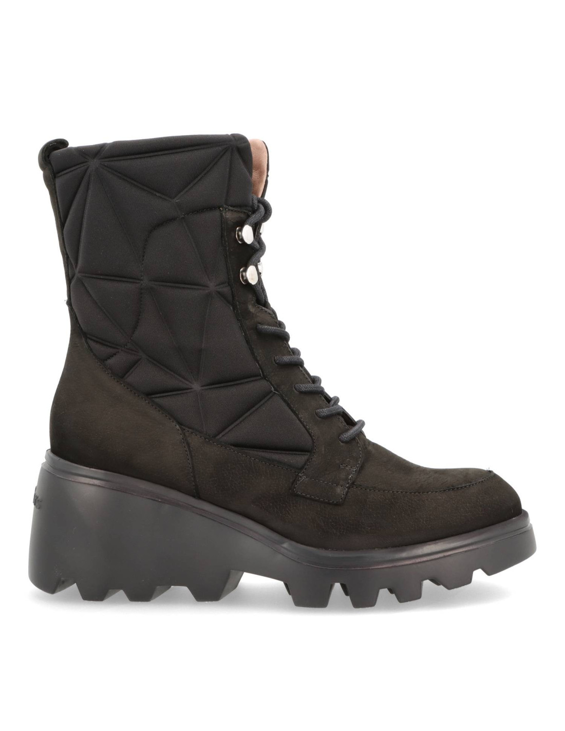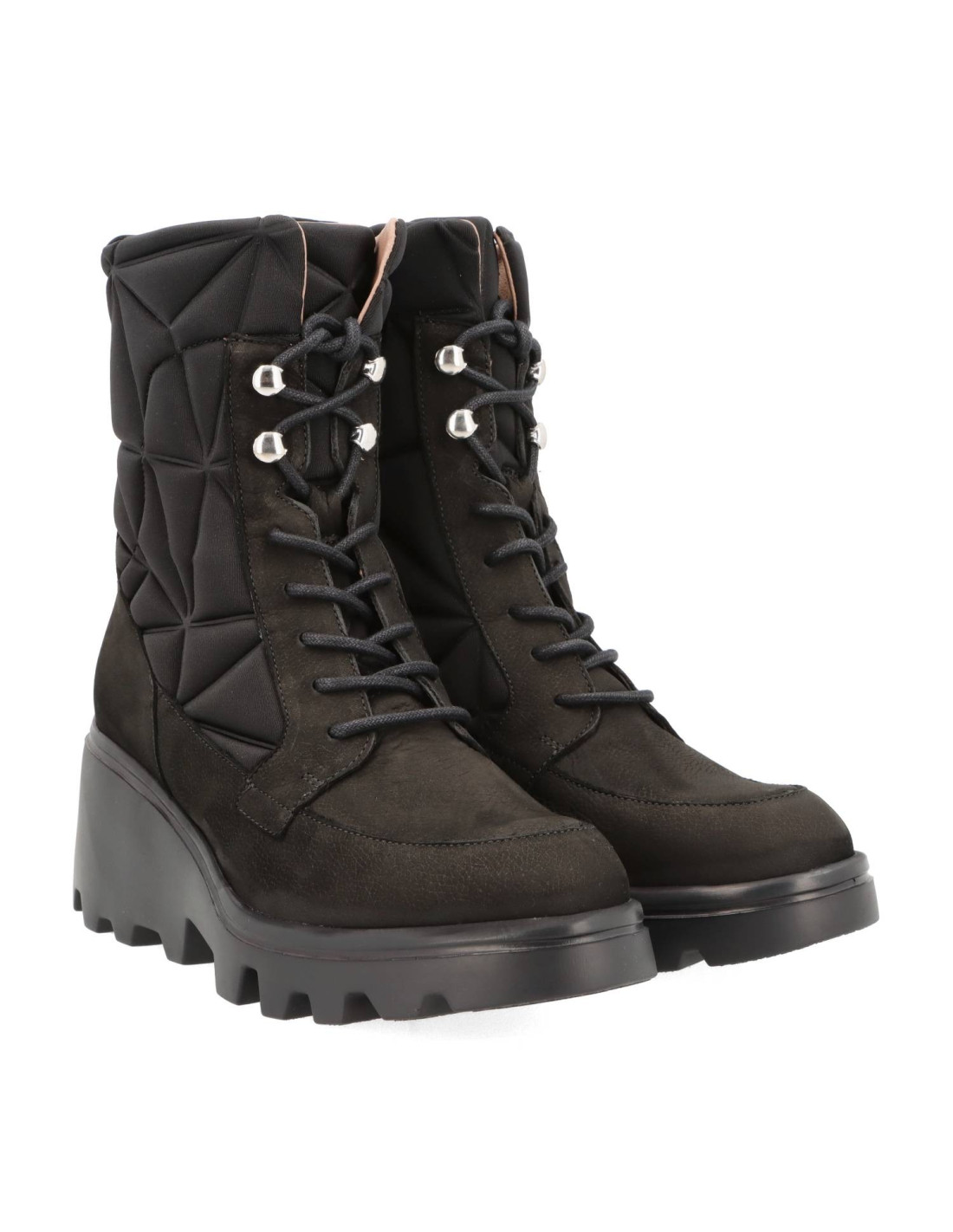 Botín con cuña para mujer G-7004 SILVER de wonders, fabricados en una combinación de piel ante y textil. Este modelo destaca por su diseño actual y atrevido, con detalles geométricos acolchados, punta redonda, tirador trasero para un mejor calce y cierre con cremallera lateral y cordones ajustables para asegurar un ajuste perfecto. Su suela track con plataforma, desarrollada con tecnología WondersFlyT, ofrece una ligereza y confort extraordinarios. La plantilla interior de MemoryGel se adapta perfectamente al pie, proporcionando una comodidad excepcional en cada paso. Prepárate para la sensación #yeswefly!! Wonders apoya la fabricación responsable vía LEATHERWORKINGGROUP.