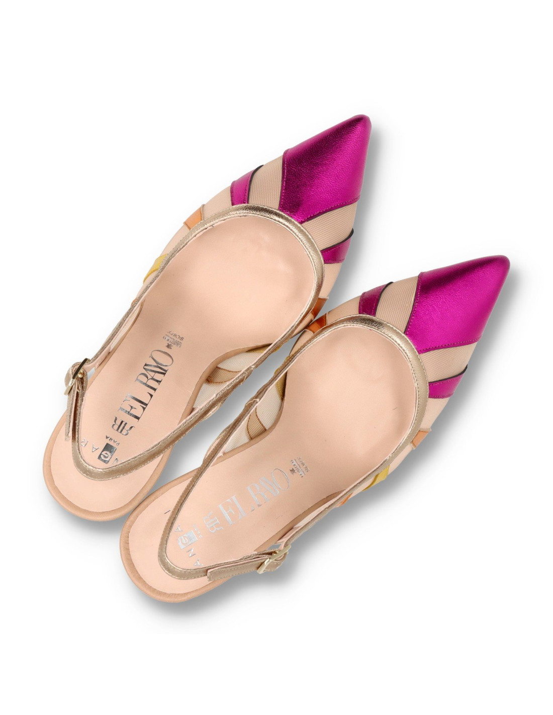 Zapatos de salón para mujer 50004 de Angari para Style shoes. Salón de piel metalizada y rejilla, con taón descubierto y hebilla ajustable. Tacón carrete metalizado de unos 7cm de altura. Planta interior acolchada para un pisada más confortable, horma fina. HECHO EN ESPAÑA
