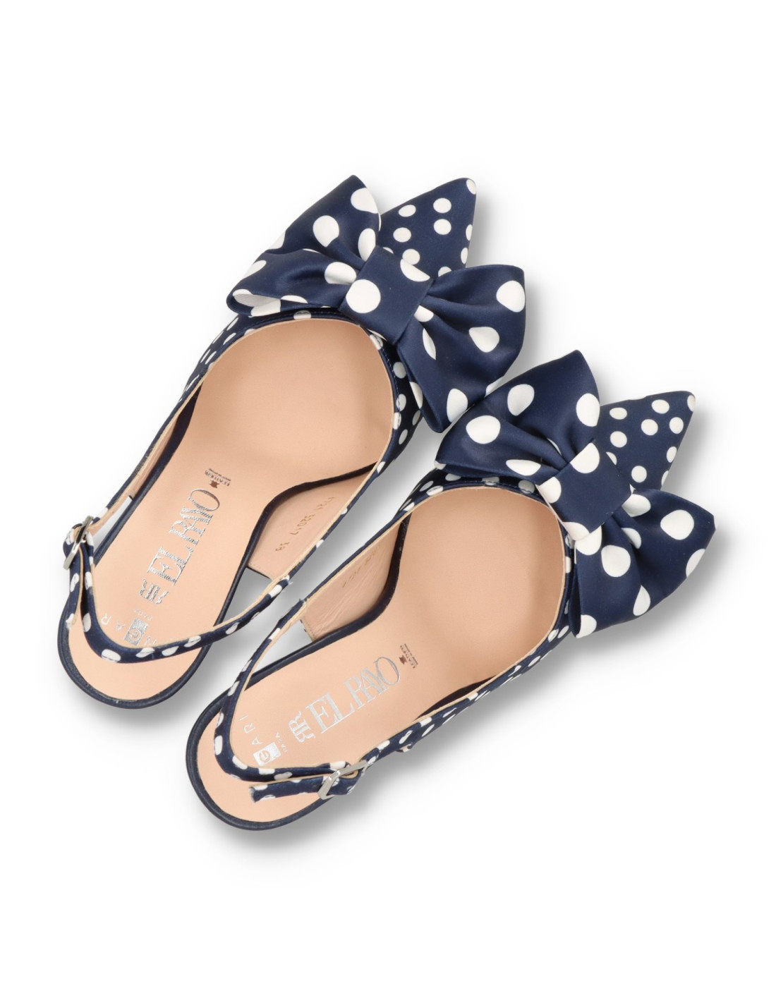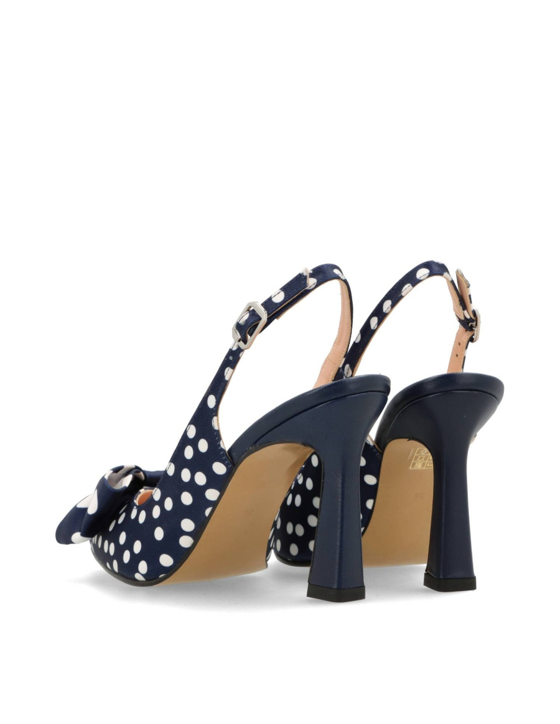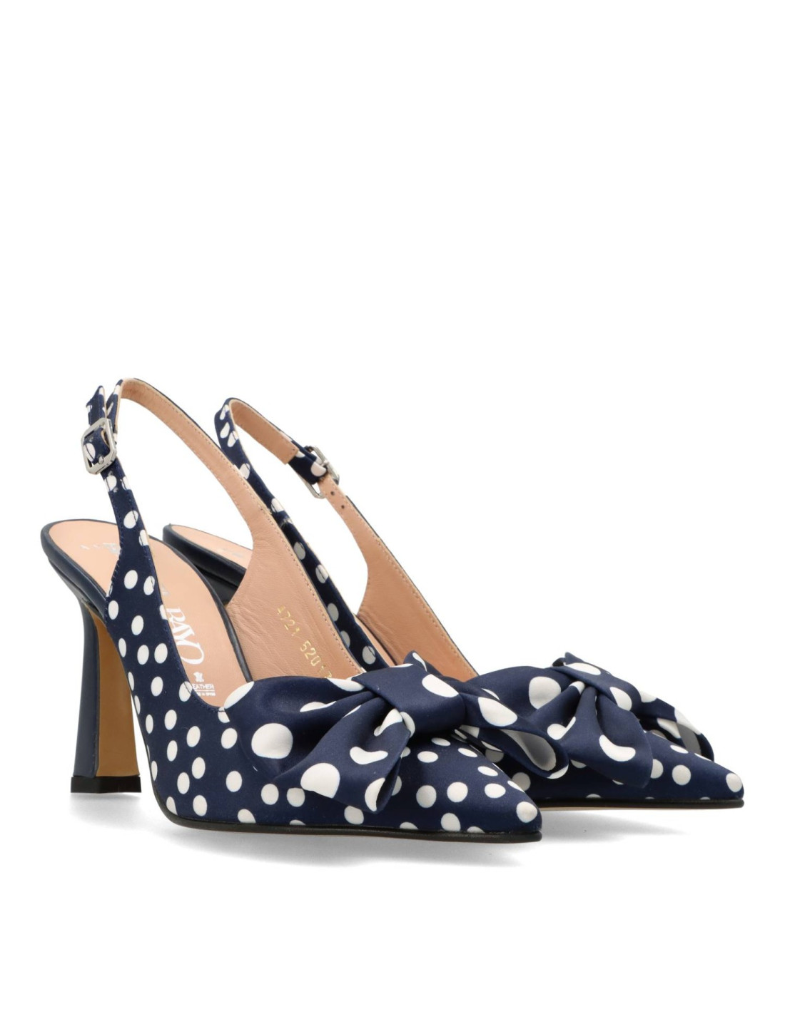 Zapatos de Salón para mujer 52017 de Angari. Salón destalonado con hebilla ajustable. En tejido estampado topos blancos y adorno de lazo. Interior de todo de piel con planta memory gel. Tacón de unos 3cm de altura. HECHO EN ESPAÑA