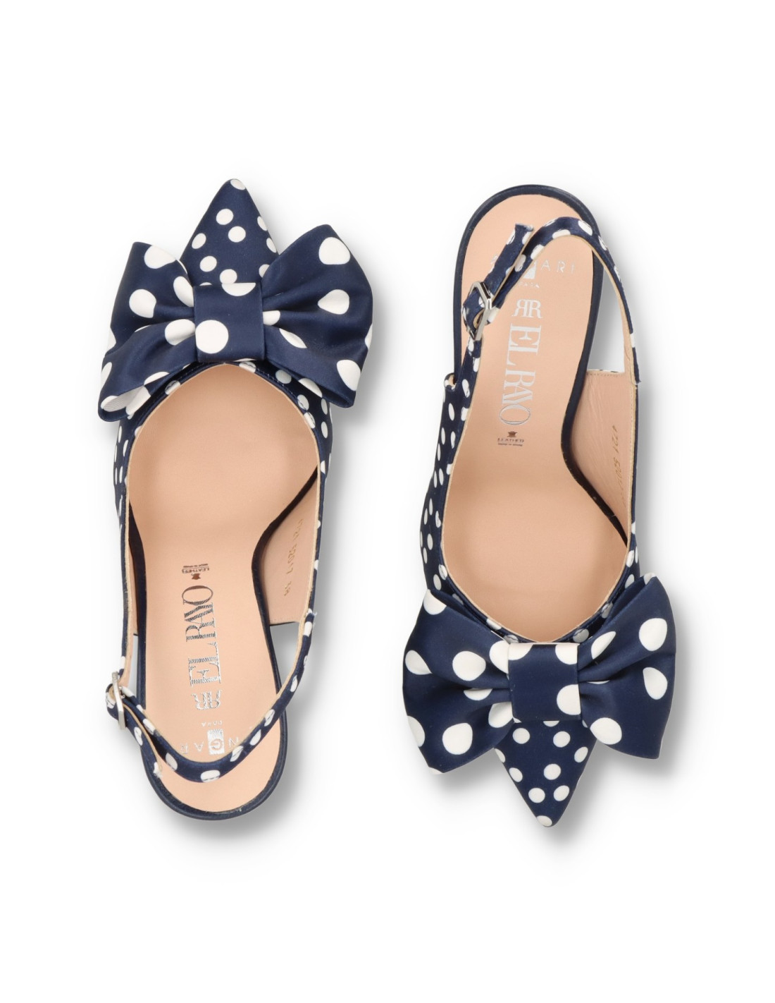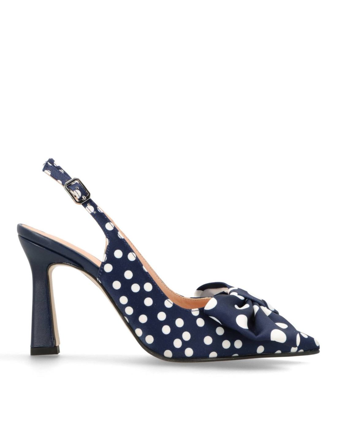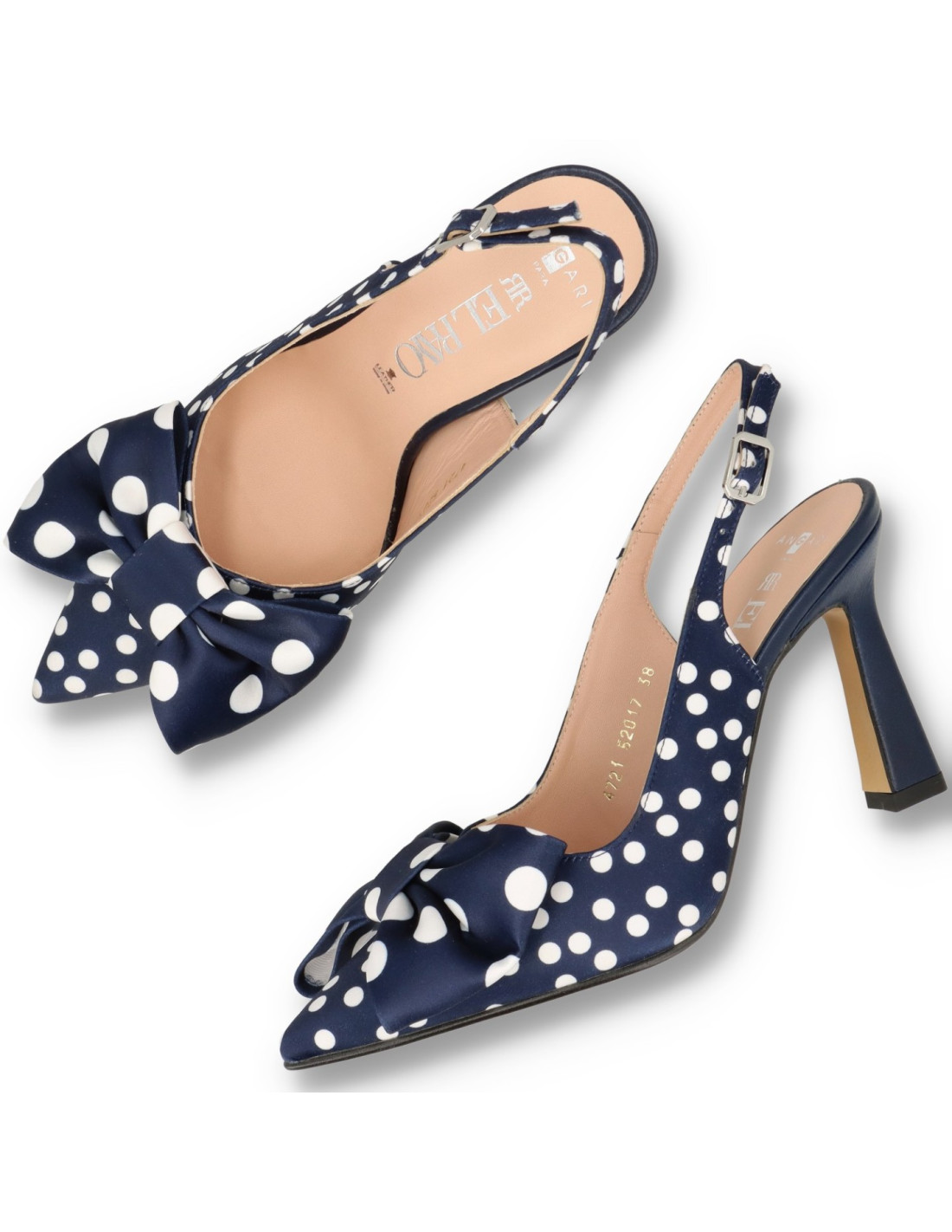 Zapatos de Salón para mujer 52017 de Angari. Salón destalonado con hebilla ajustable. En tejido estampado topos blancos y adorno de lazo. Interior de todo de piel con planta memory gel. Tacón de unos 3cm de altura. HECHO EN ESPAÑA