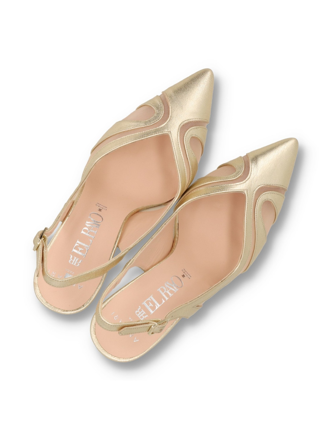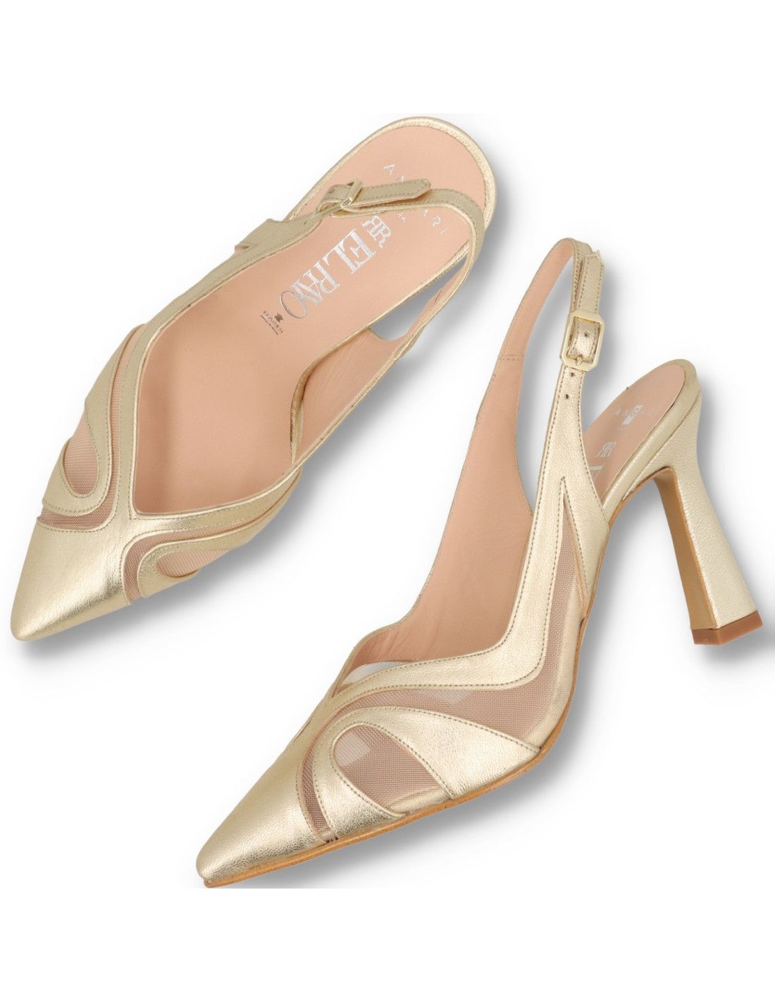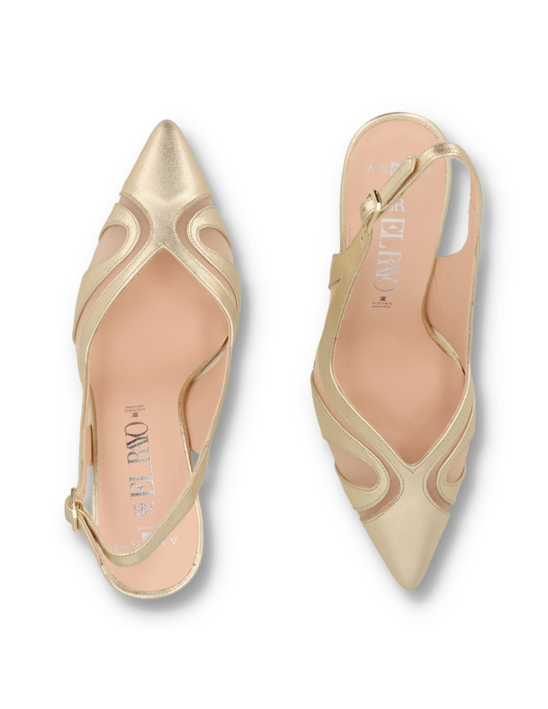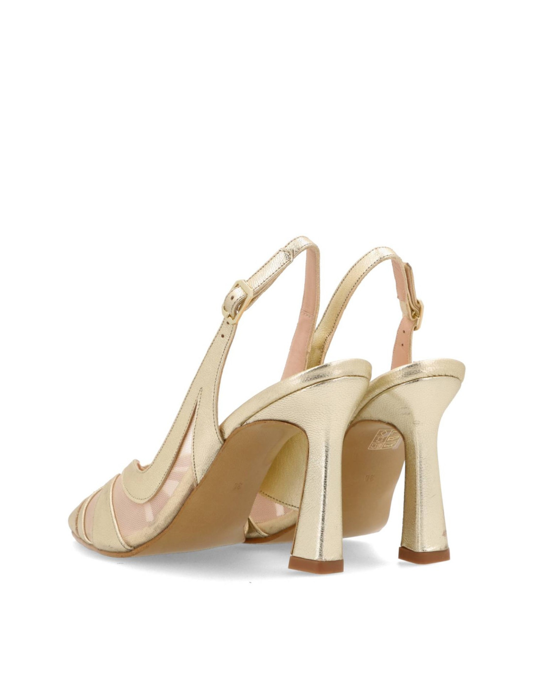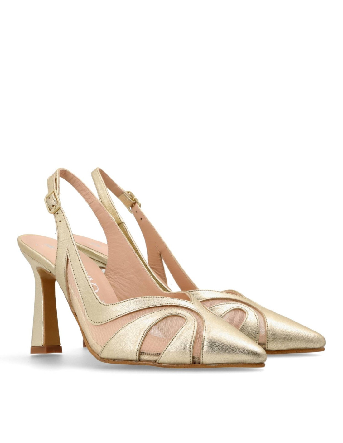 Zapato de salón para mujer 52023 de Angari. Salón de talón descubierto combinado piel metalizada en color champagne y rejilla. Plantilla interior de memory gel. Tacón estilo carrete de unos 6cm de altura, con suela de Nora flexible. HECHO EN ESPAÑA