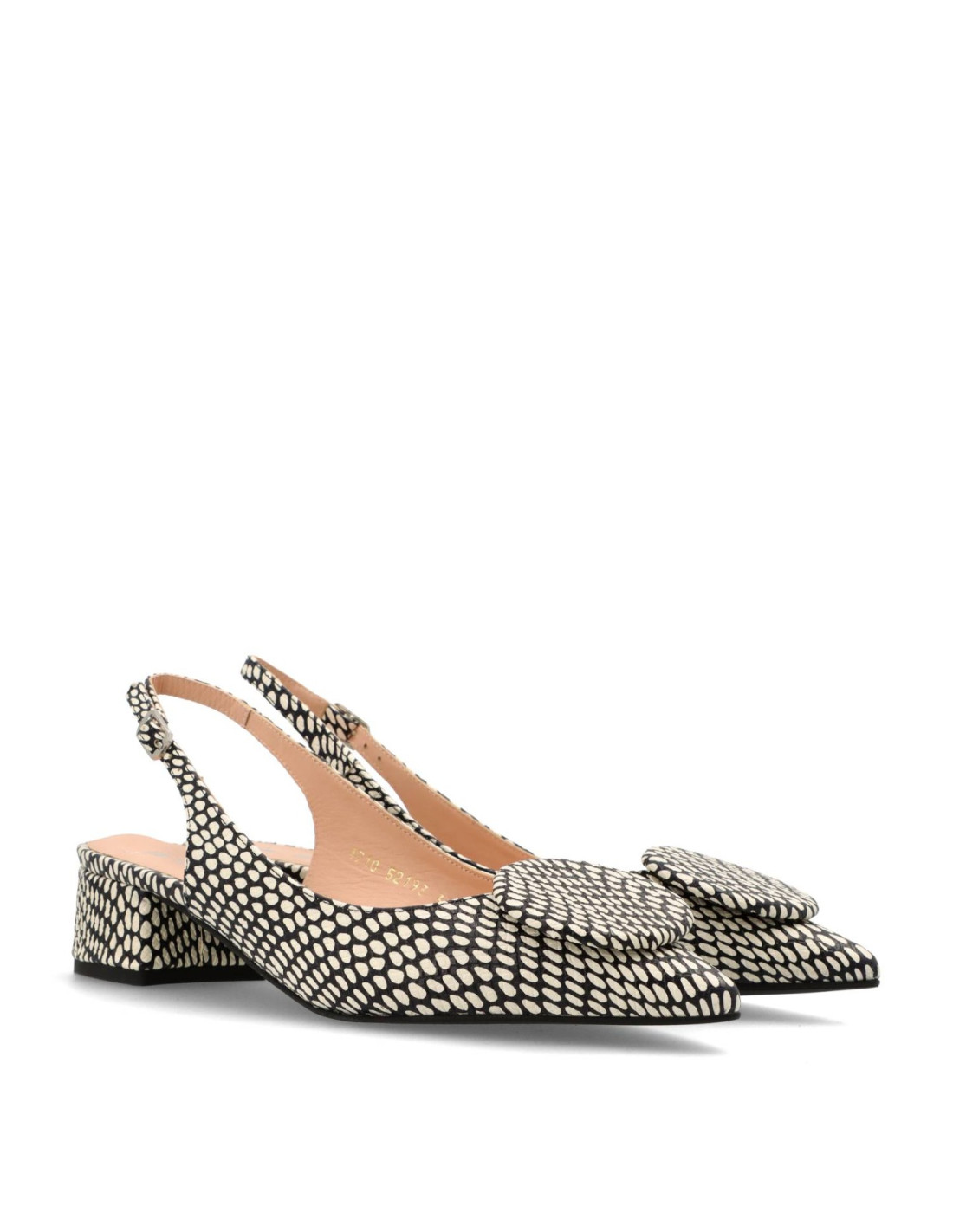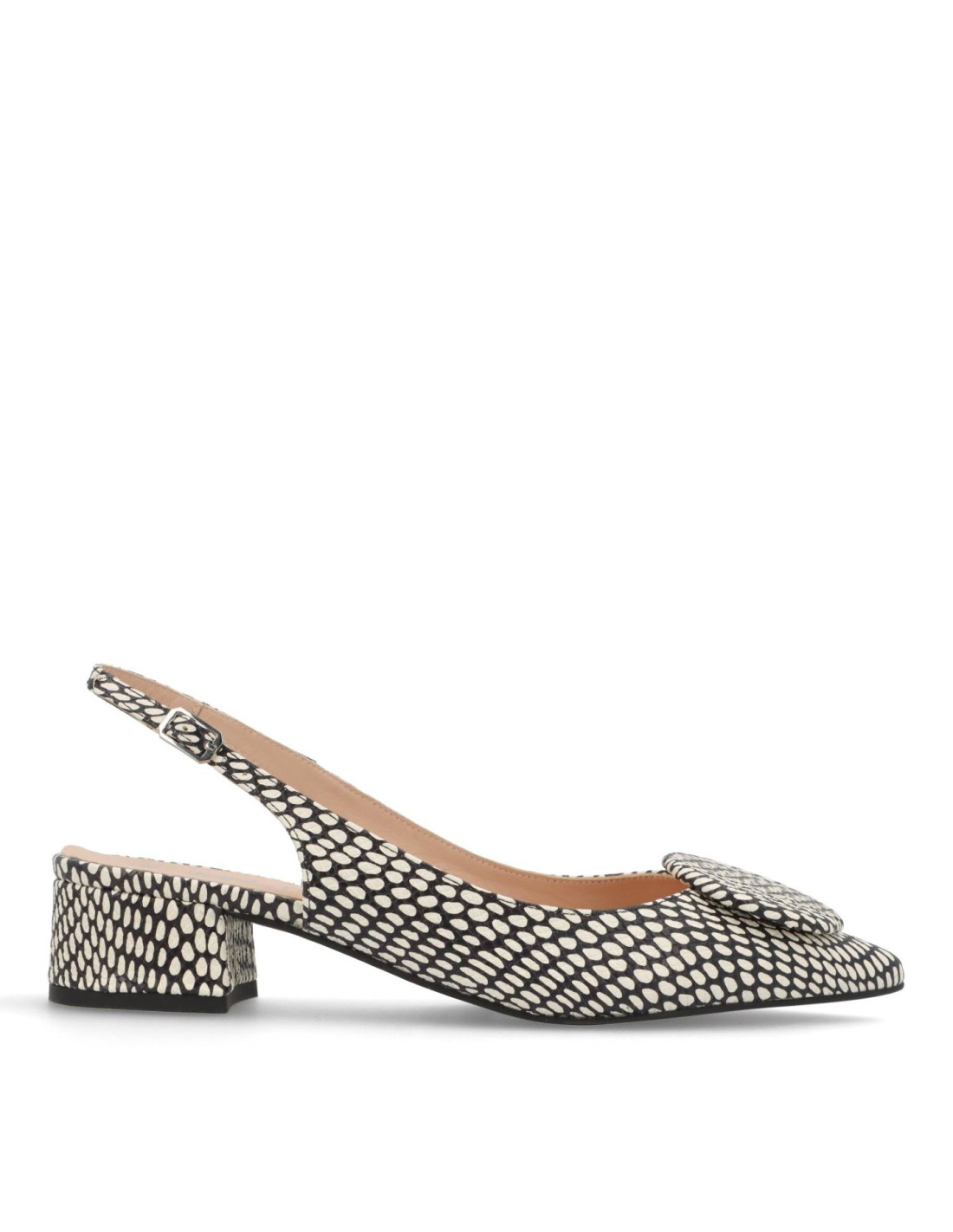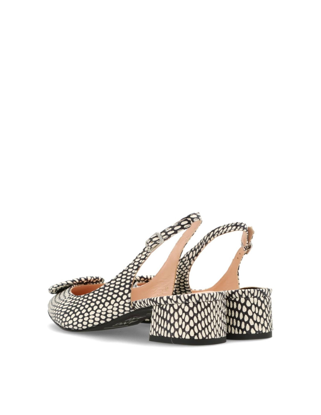 Zapatos de salón para mujer 52193 de Angari. Salón destalonado con hebilla ajustable. De piel 100%vacuno estampado bicolor negro-blanco, plantilla interior de meory gel. Detalle de adorno en pala redondo y cuadrado. Tacón de unos 3cm de altura con piso de nora flexible.