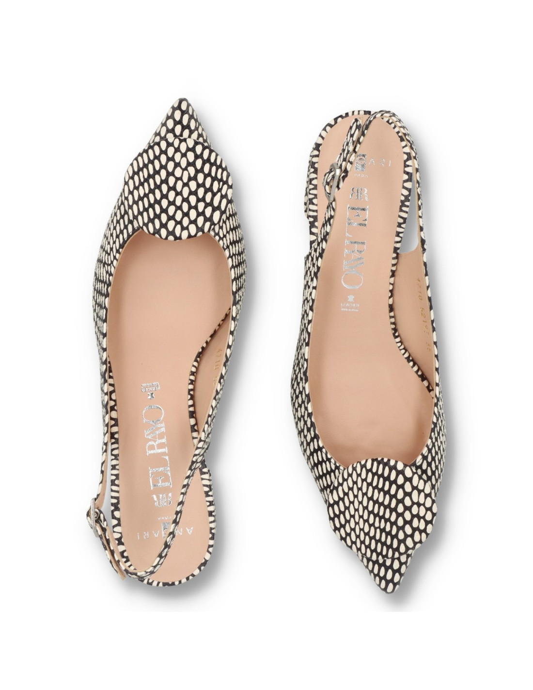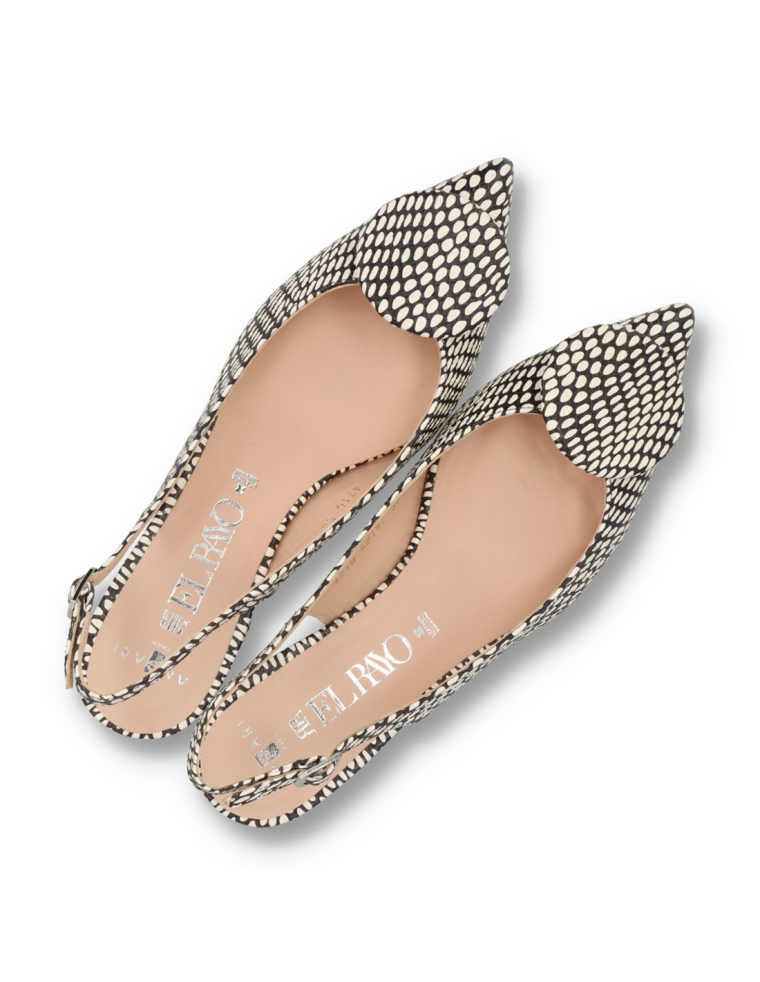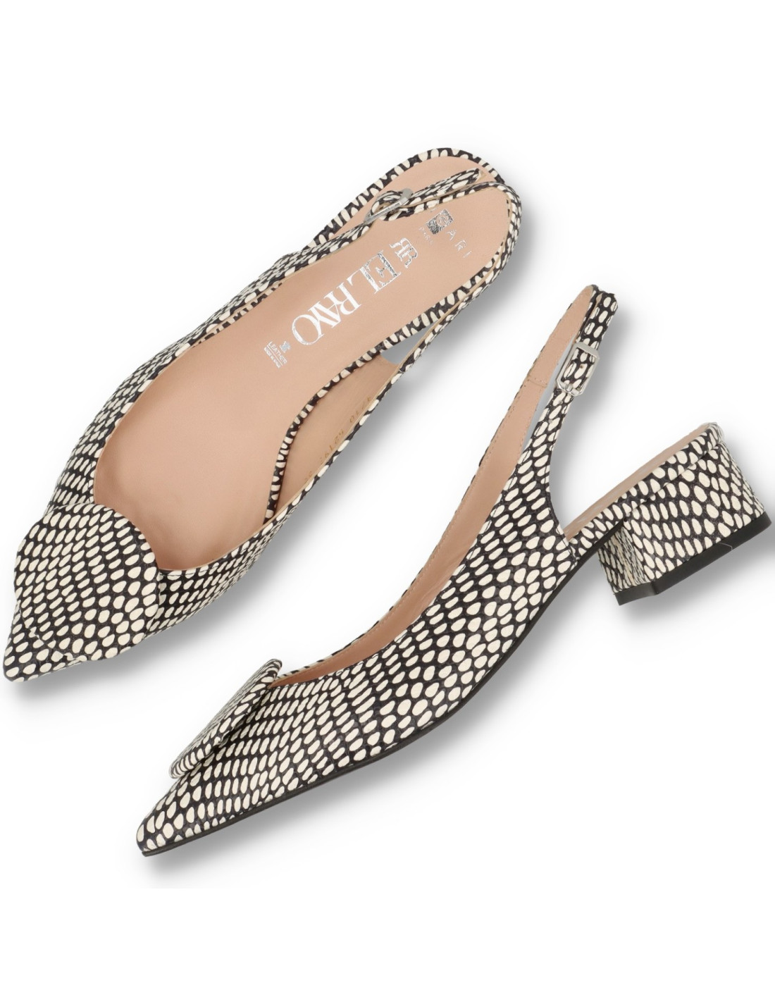 Zapatos de salón para mujer 52193 de Angari. Salón destalonado con hebilla ajustable. De piel 100%vacuno estampado bicolor negro-blanco, plantilla interior de meory gel. Detalle de adorno en pala redondo y cuadrado. Tacón de unos 3cm de altura con piso de nora flexible.