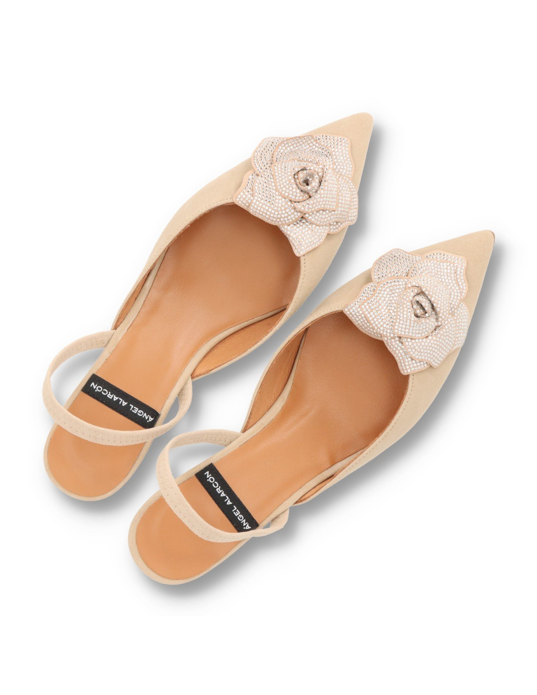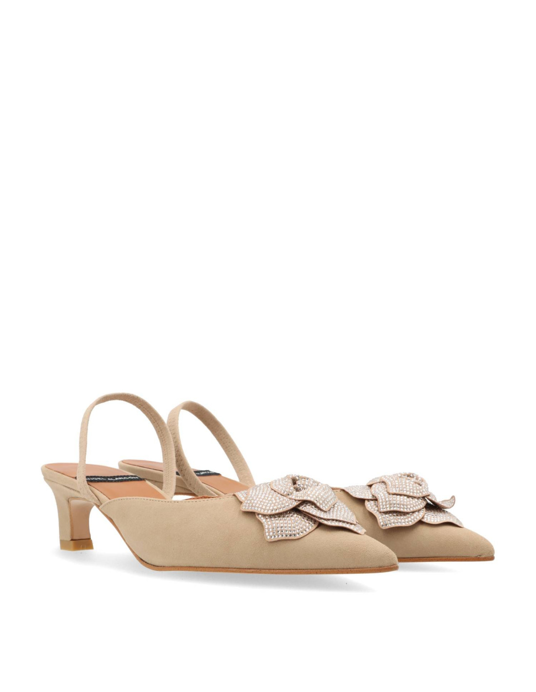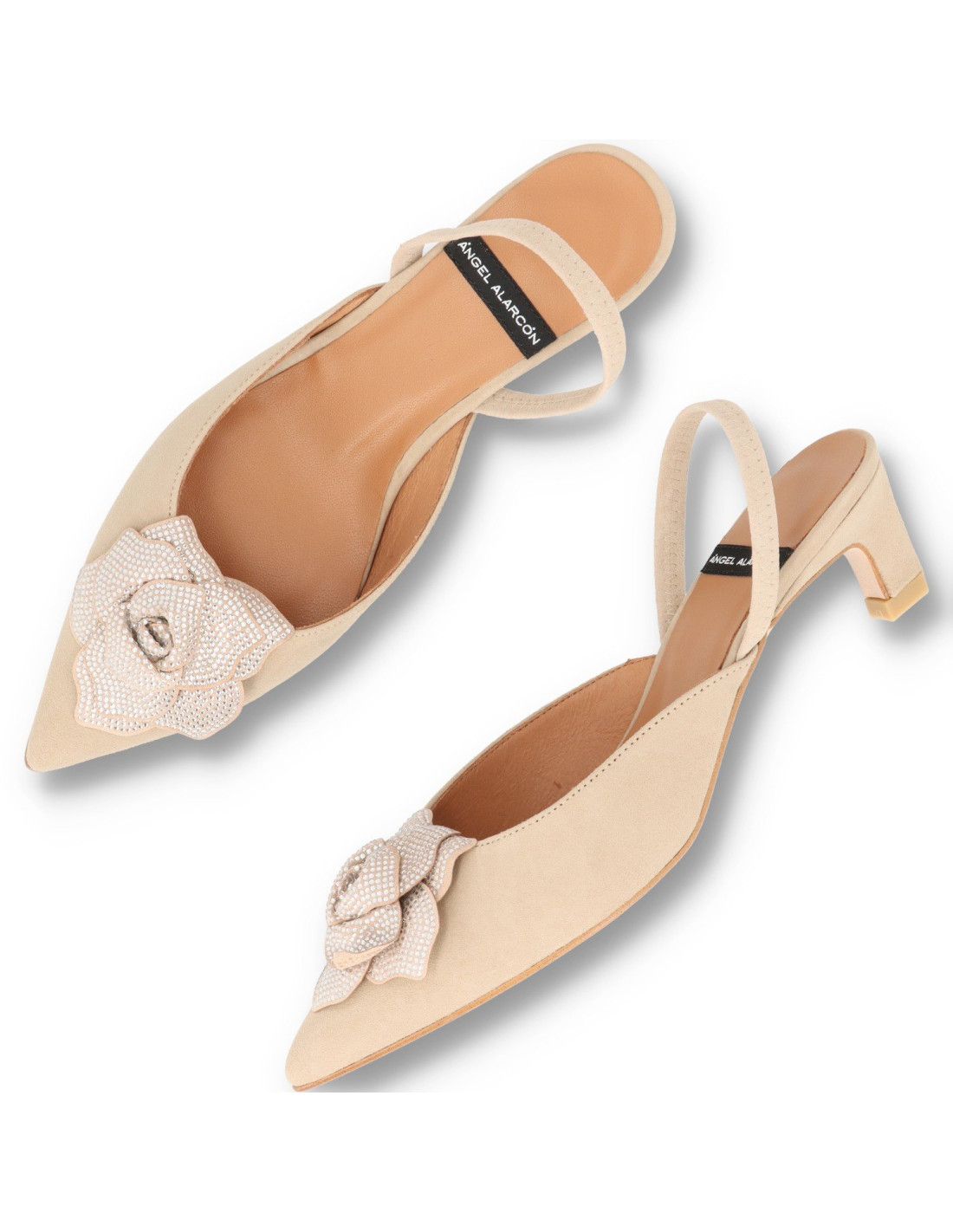 Zapatos de salón para mujer 25049 de Angel Alarcón. Confeccionados en piel de ante vacuno de primera calidad, plantilla de gel para una pisada más confortable. Tacón bajo o kitten de unos 3.5cm, detalle de flor con strass en la pala.HECHO EN ESPAÑA