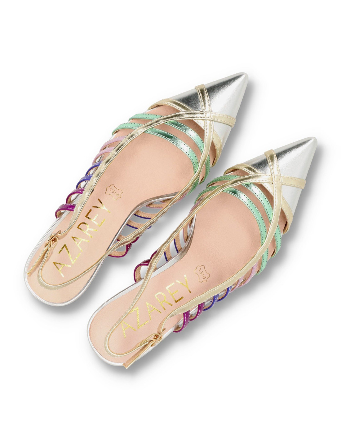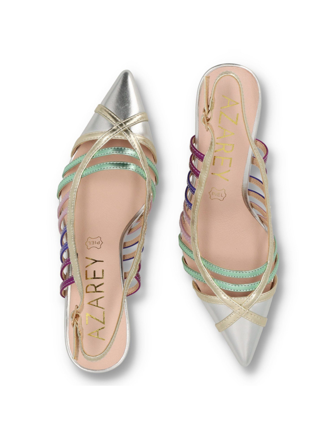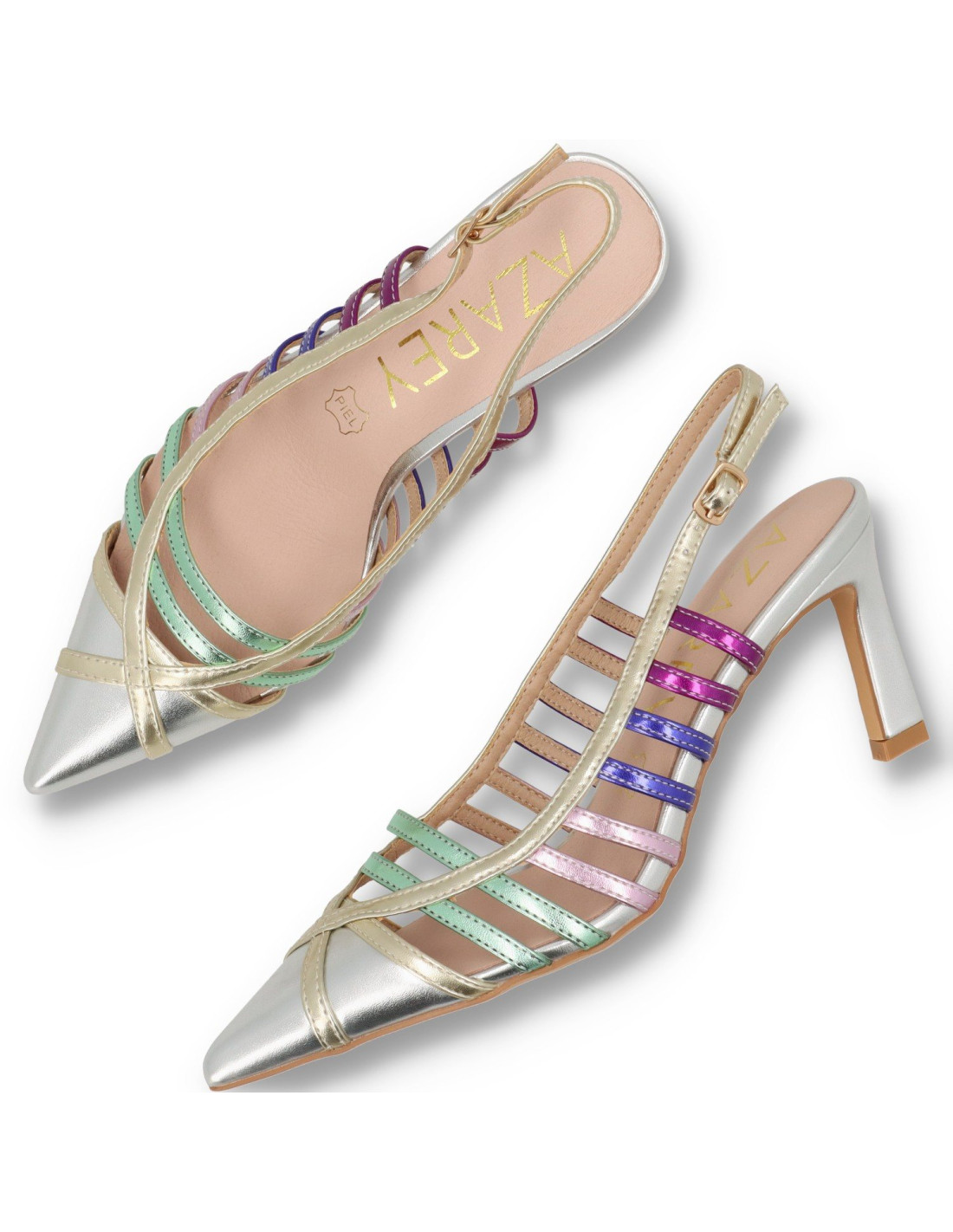 Salon destalonado con tacón para mujer 1615A de Daniela Vega. De PU Leather en distintas texturas, planta interior de piel 100%vacuno acolchada y forro de material sostenible. Salón tipo PEEPTOES con tacón de unos9cm de altura y plataforma de 2cm. Talón descubierto con hebilla ajustable. HECHO EN ESPAÑA