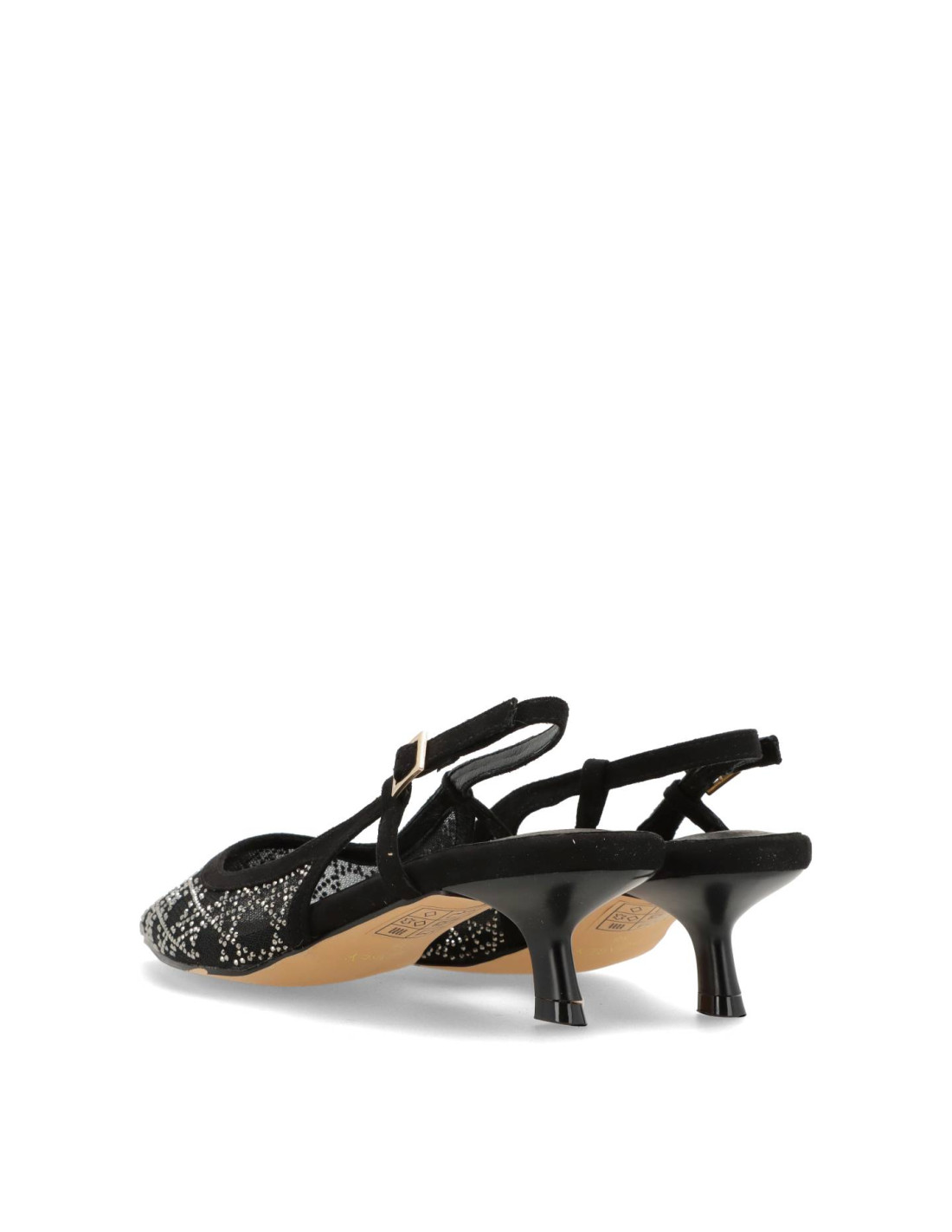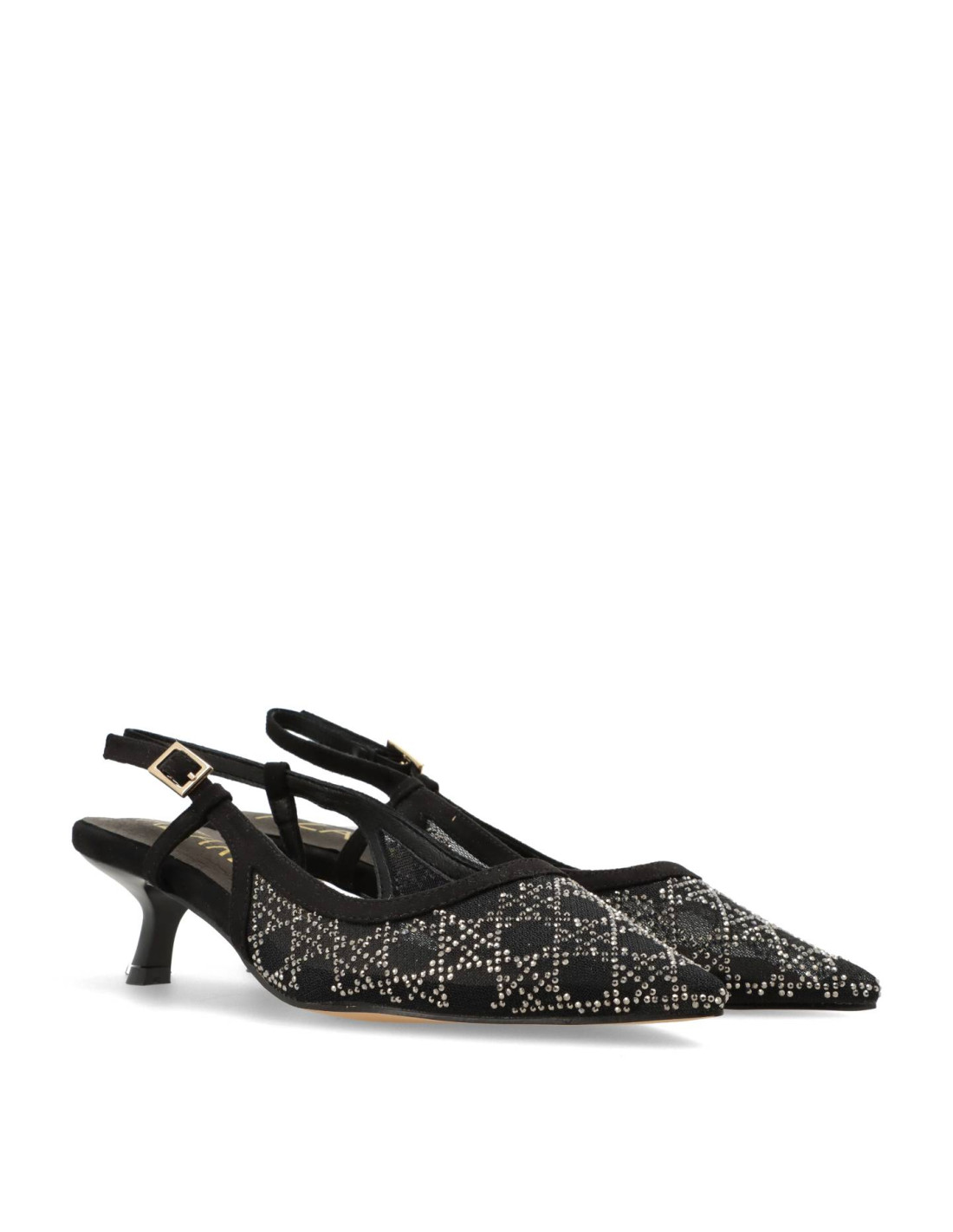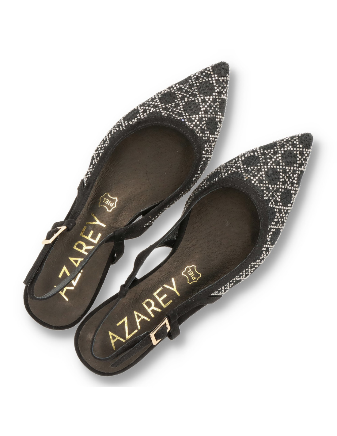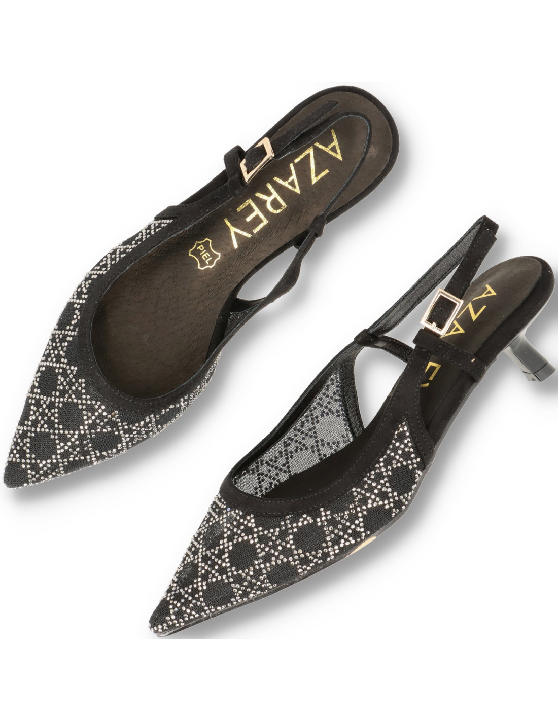 Zapatos de salón para mujer 459L005 de Azarey. De tejido tipo rejilla y strass con planta interior de piel con memory gel. Tacón chupete de unos 3cm de altura y suela flexible.