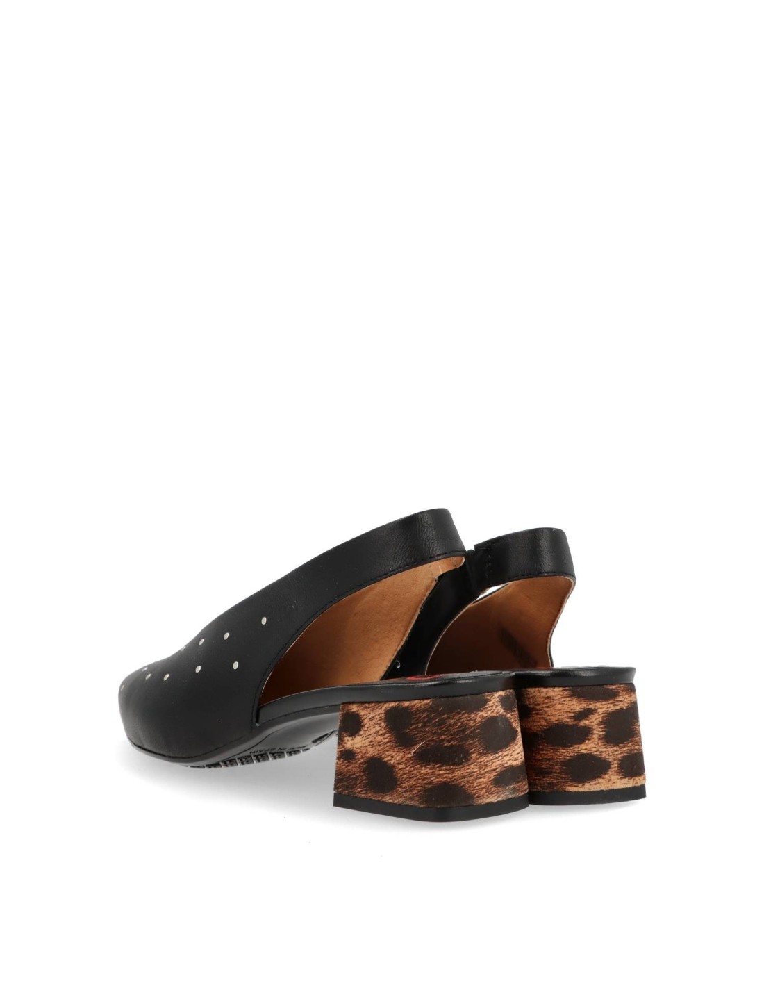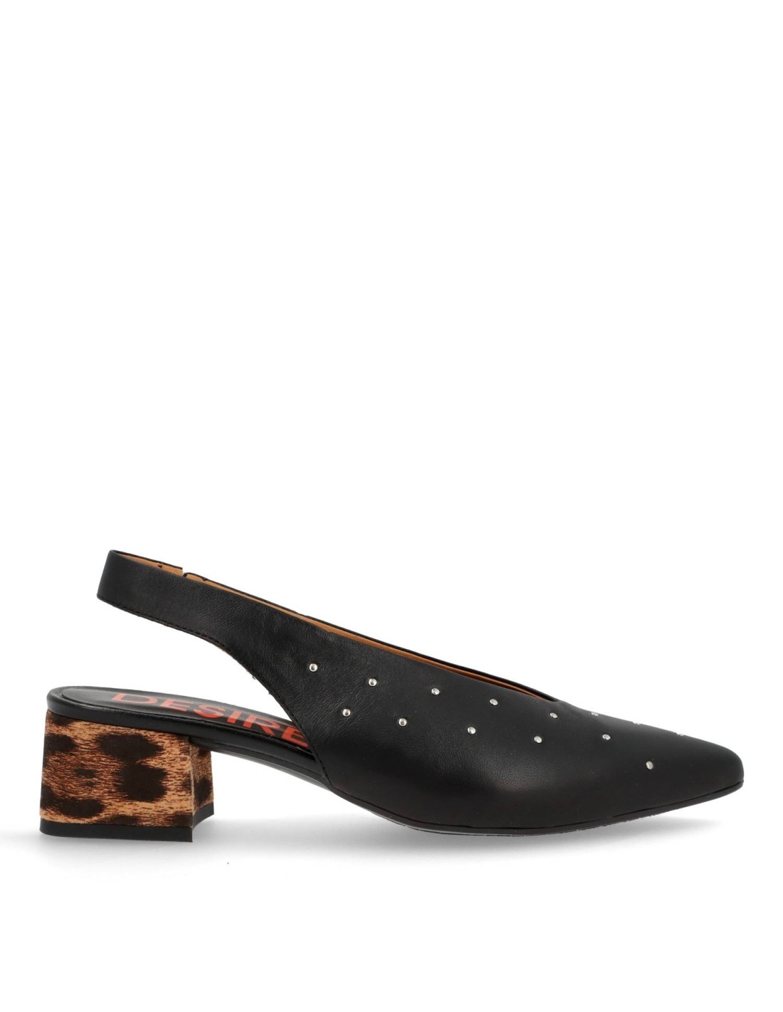 Zapato de salón para mujer MALTA-10 de Desiree. Fabricado todo en piel100%vacuno y planta acolchada. Tacón ancho y comodo forrado en leopardo de unos 5cm de altura. Detalle de tachas y talón abierto con suela de goma antideslizante. HECHO EN ESPAÑA