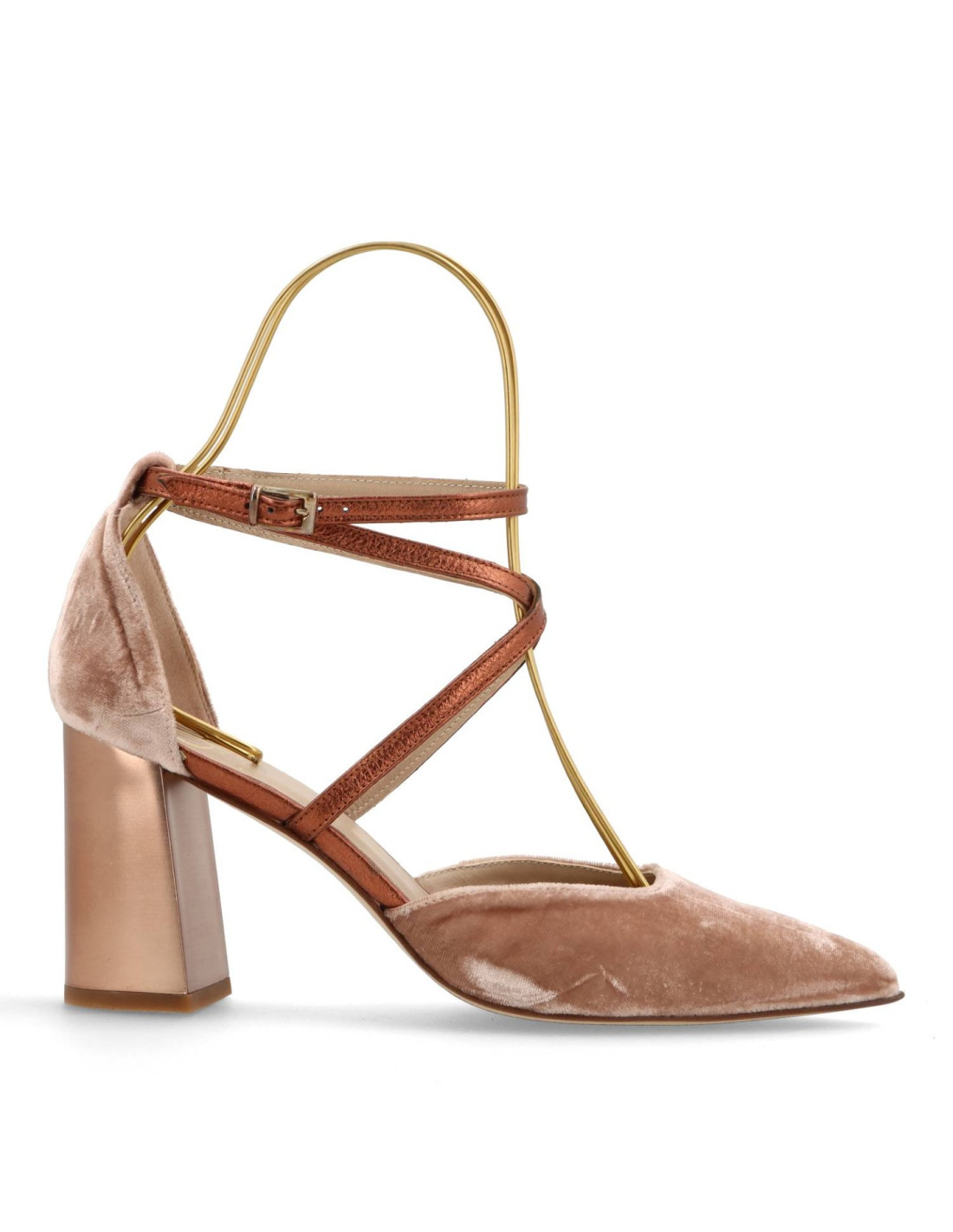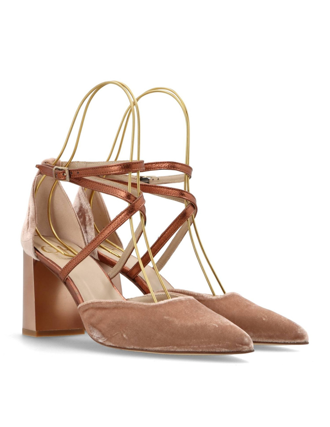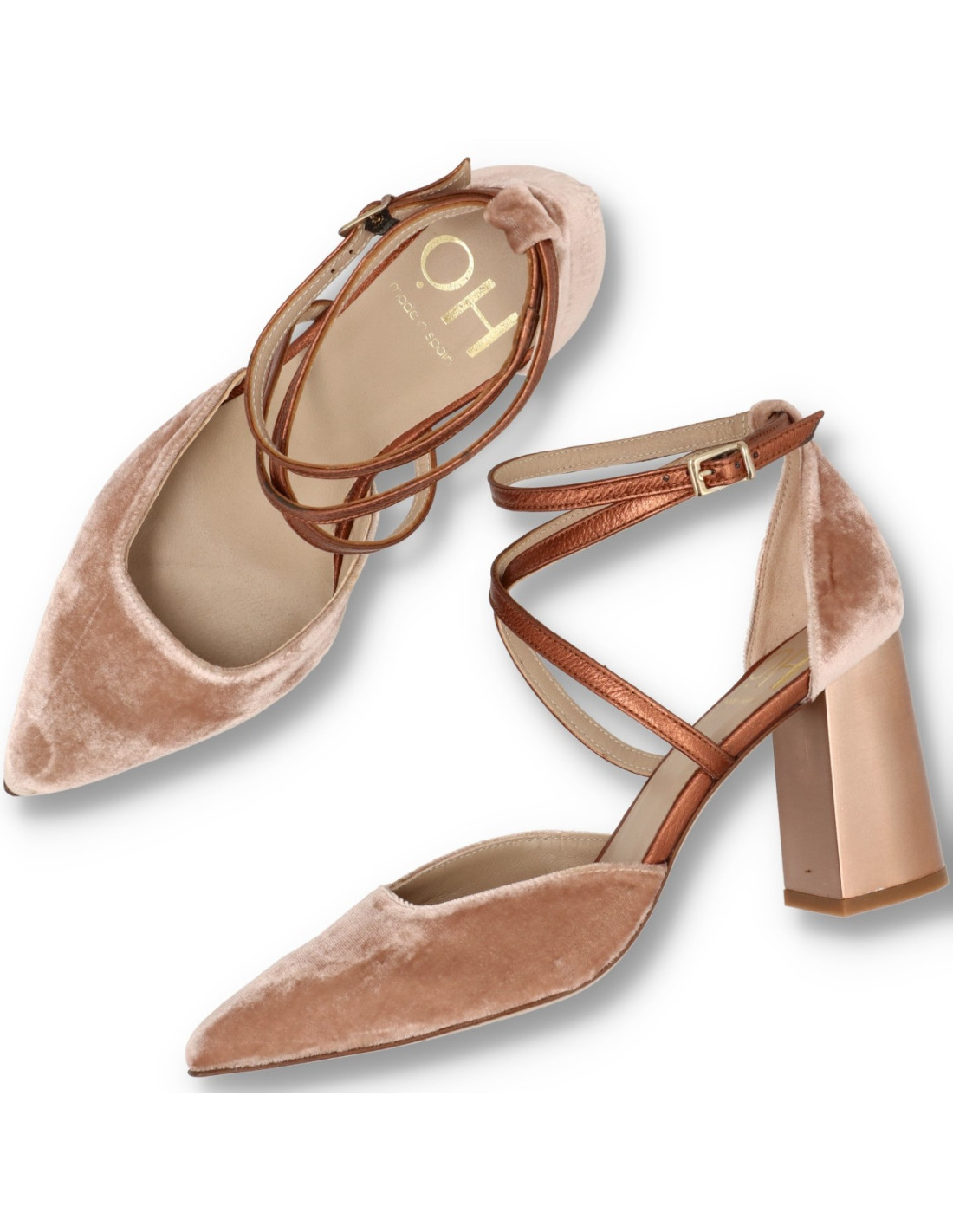 Zapatos de mujer modelo M-5002 de la marca ¡OH. Salones de huecos abiertos y talón tiras cruzadas de color Taupe. De tacón ancho de unos 8cm de altura acabado metal. Confeccionado en terciopelo y con forro de piel, la planta acolchada de gel. Para una pisada más comoda. HECHO EN ESPAÑA.