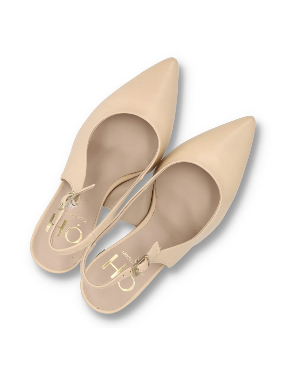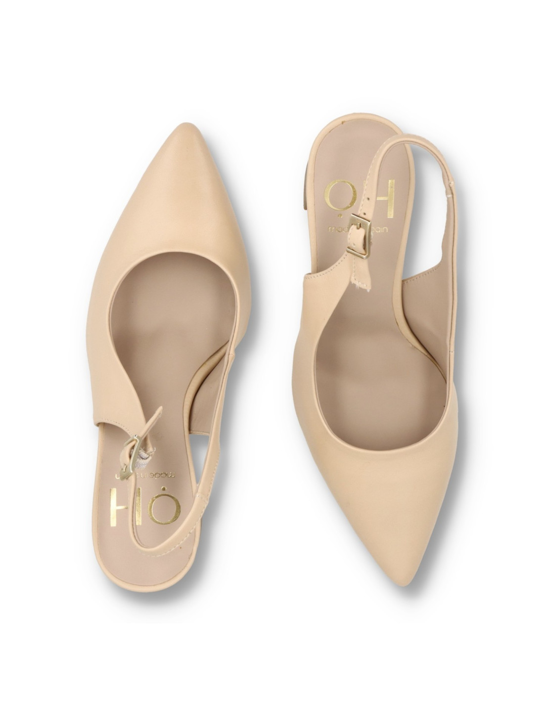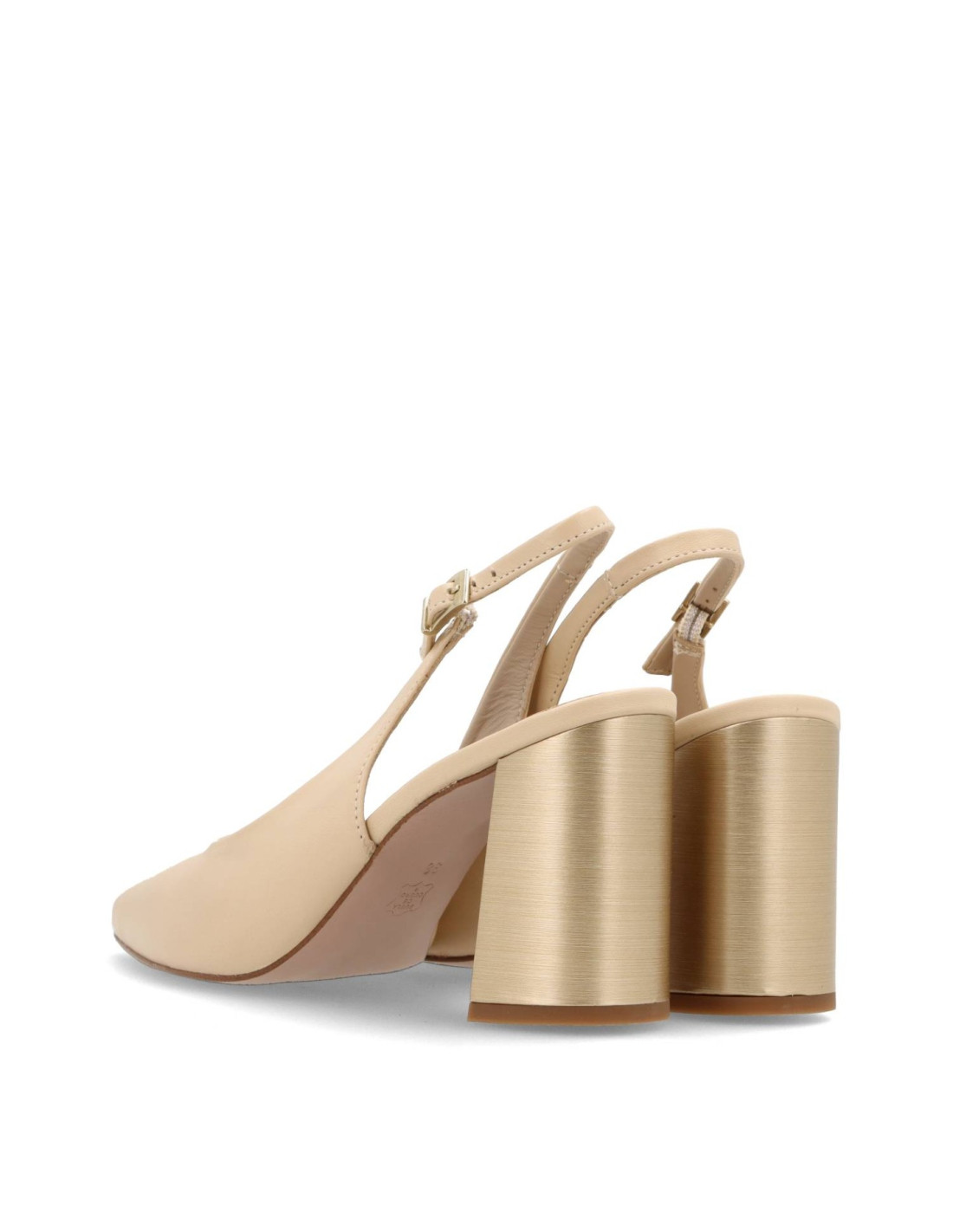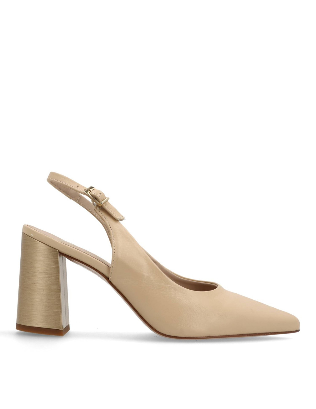 Salón de tacón para mujer modelo M-5020 de OH¡. Fabricado todo en piel 100%vacuno de primera calidad en color Natural, plantilla interior de gel. Tacón ancho acabado metálico de unos 9cm de altura, horma de punta fina. HECHO EN ESPAÑA.