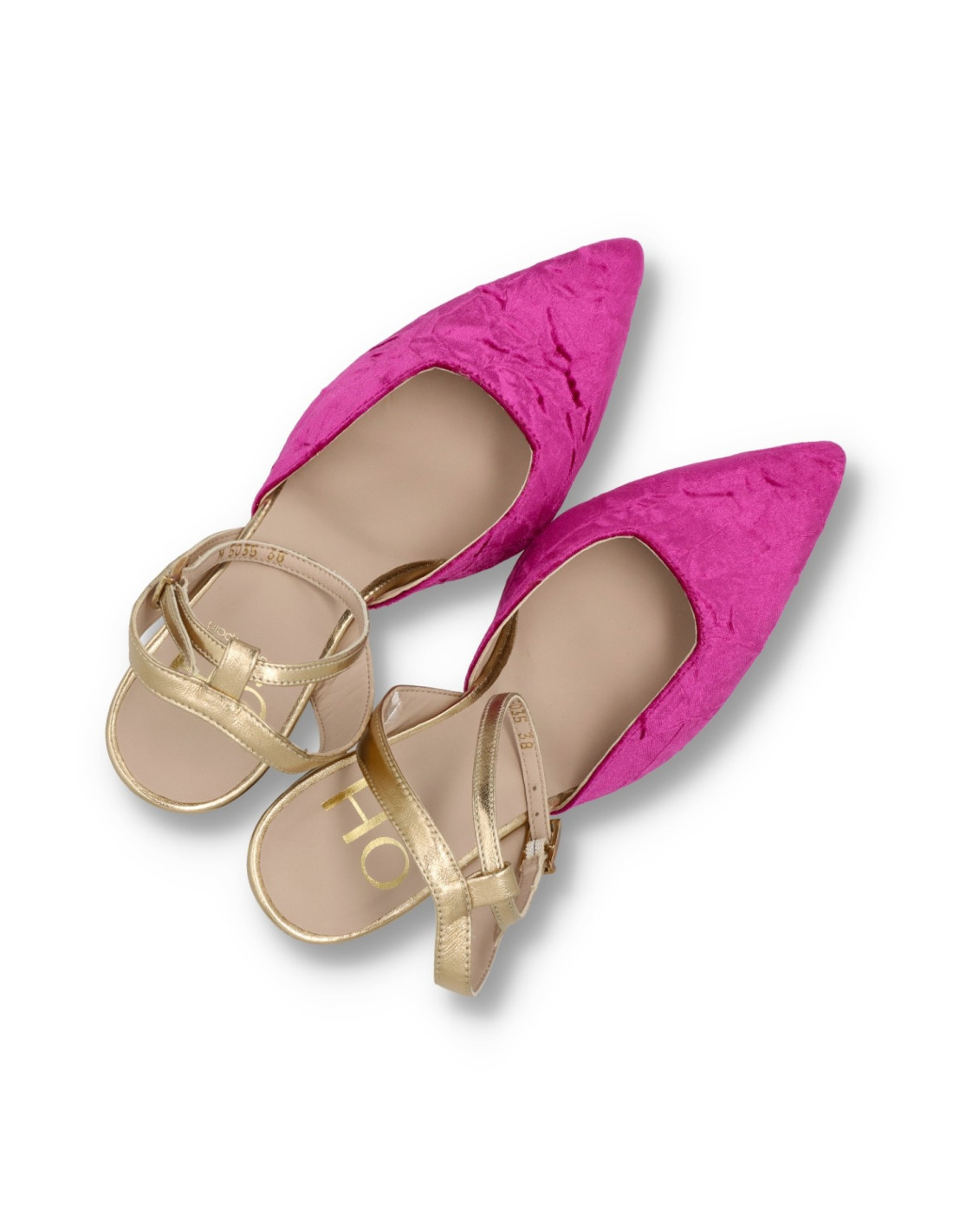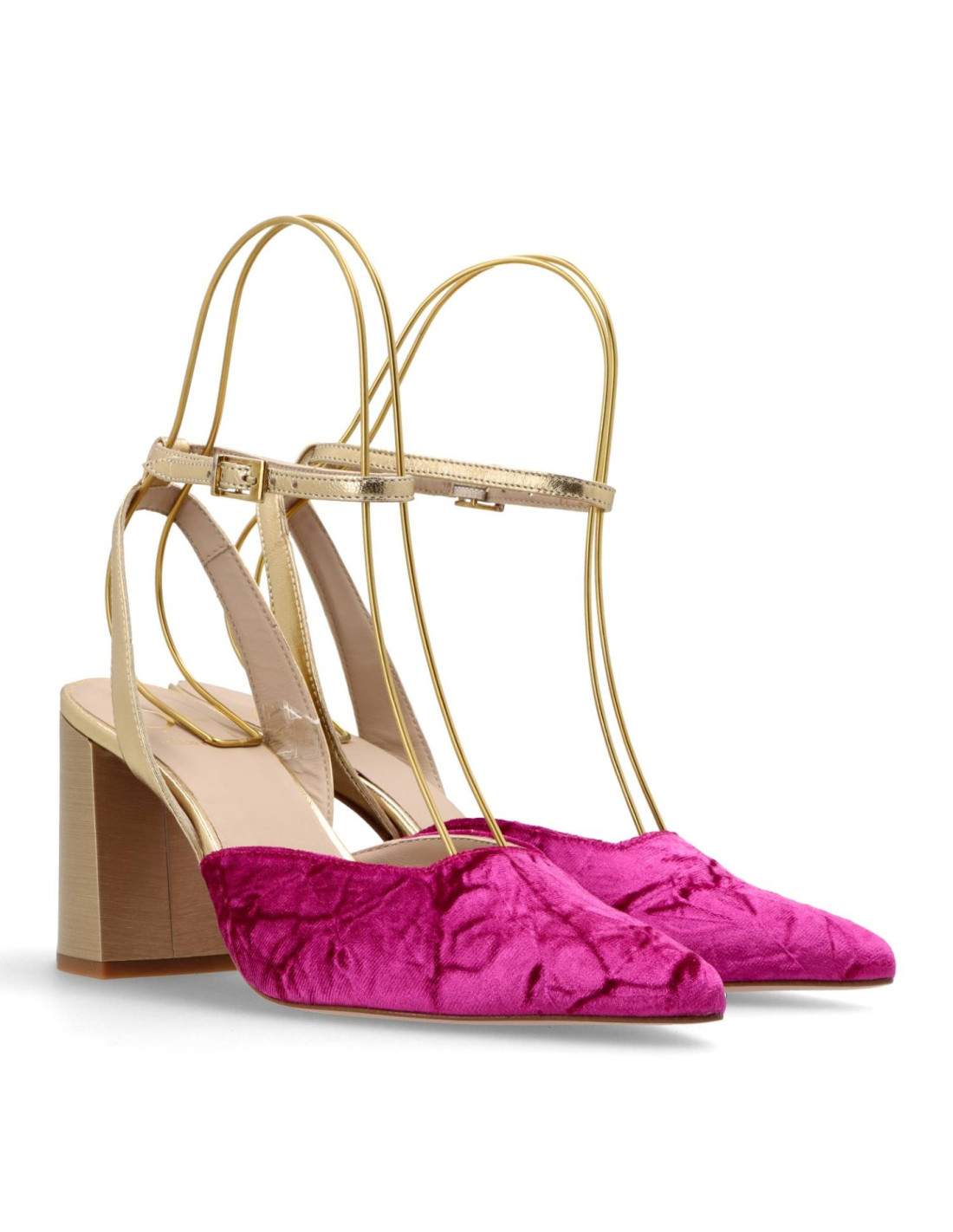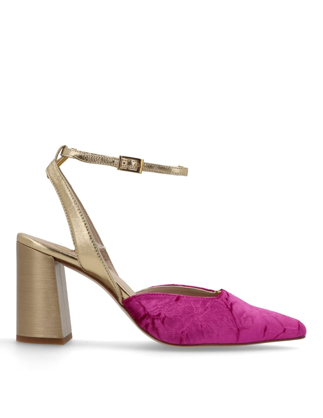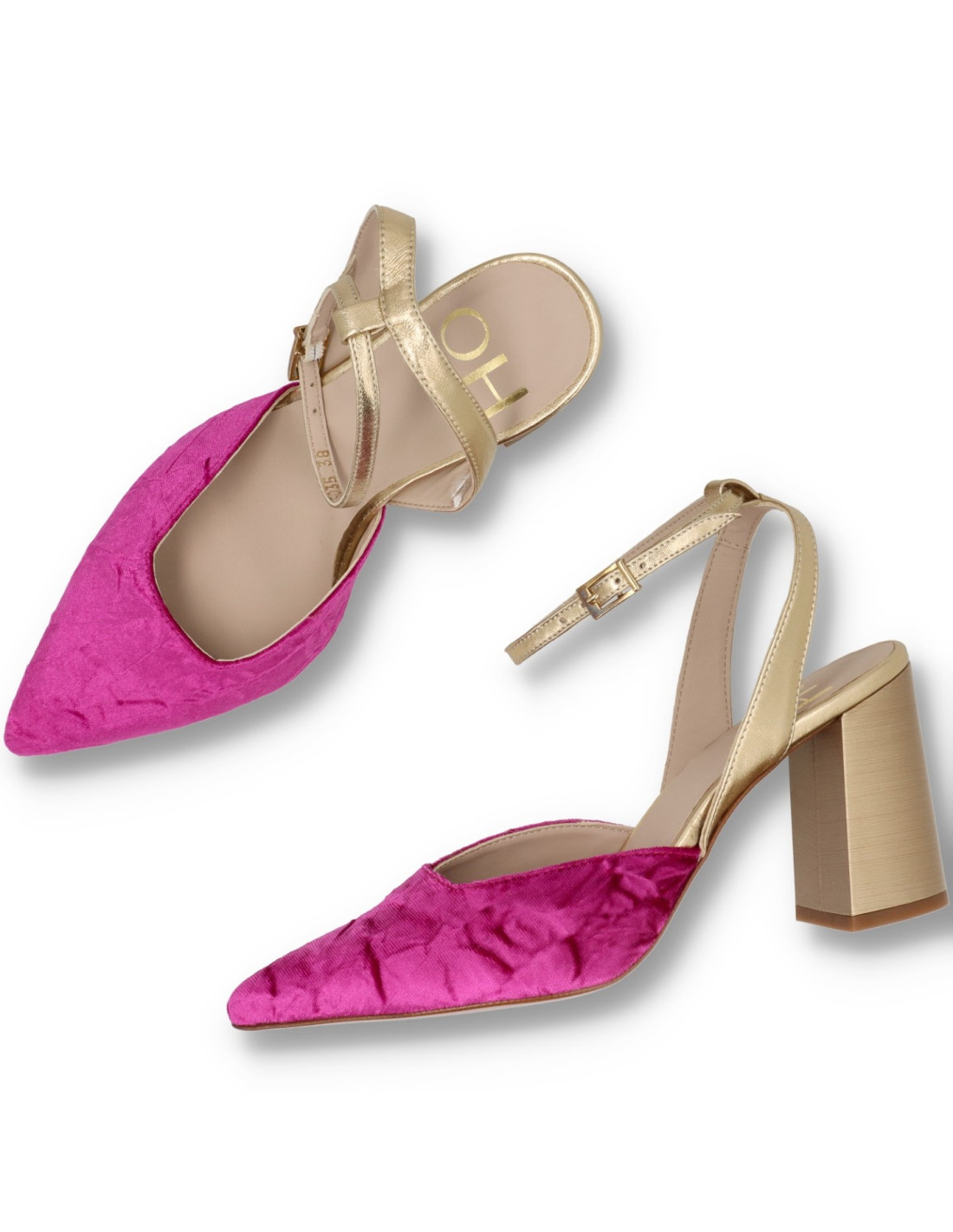Zapatos de mujer modelo M-5035 de la marca ¡OH. Salones de pala en terciopelo color Fuxia y talón pulsera de piel metalizada. De tacón ancho de unos 8cm de altura acabado metal. Confeccionado en terciopelo y con forro de piel, la planta acolchada de gel. Para una pisada más comoda. HECHO EN ESPAÑA.