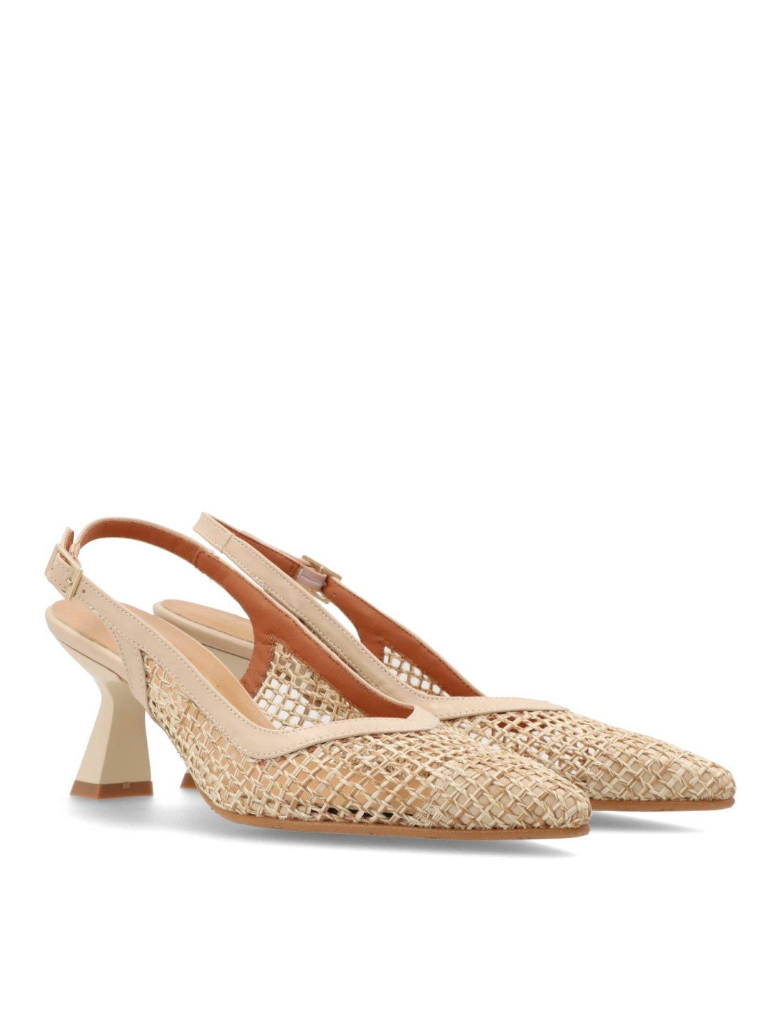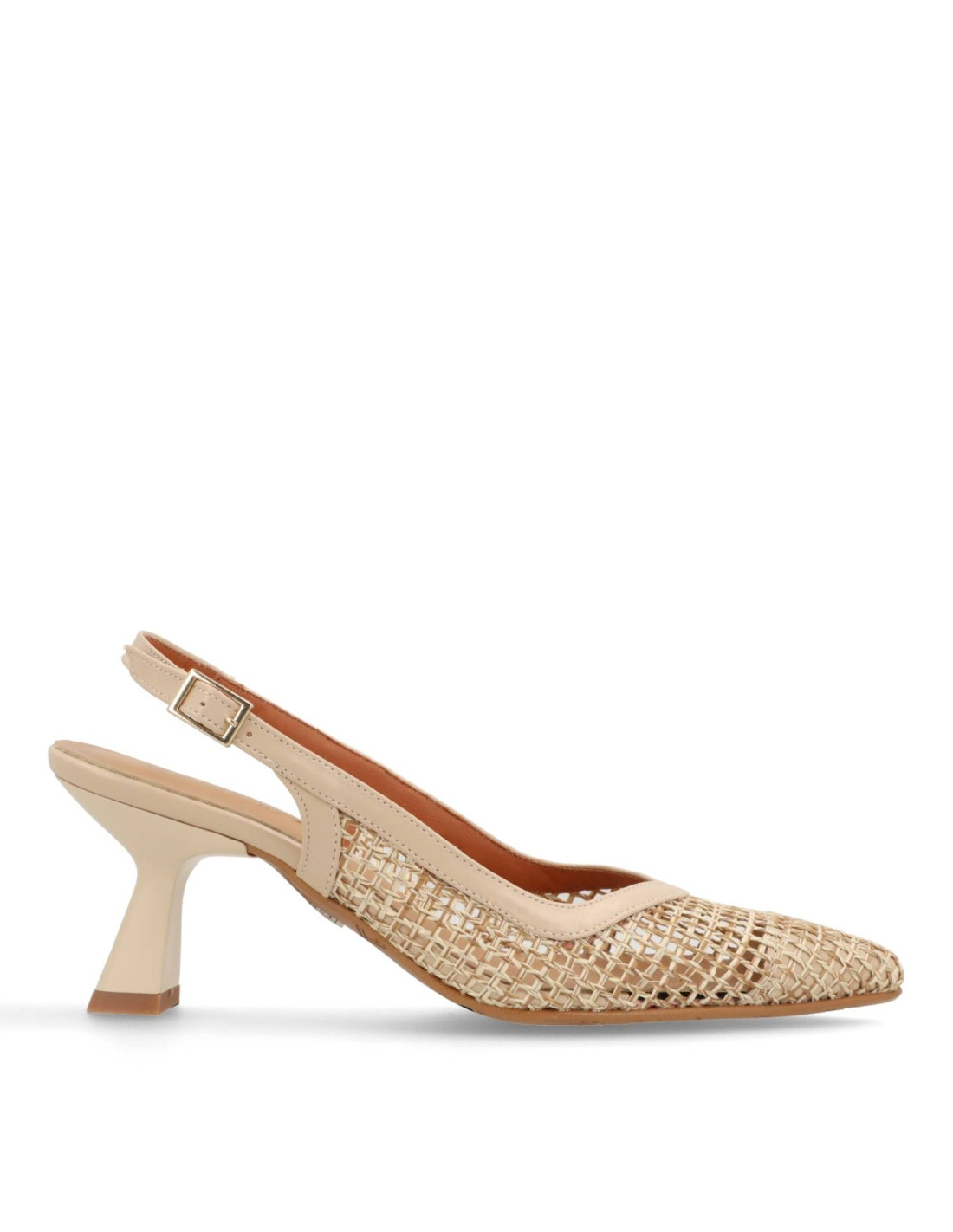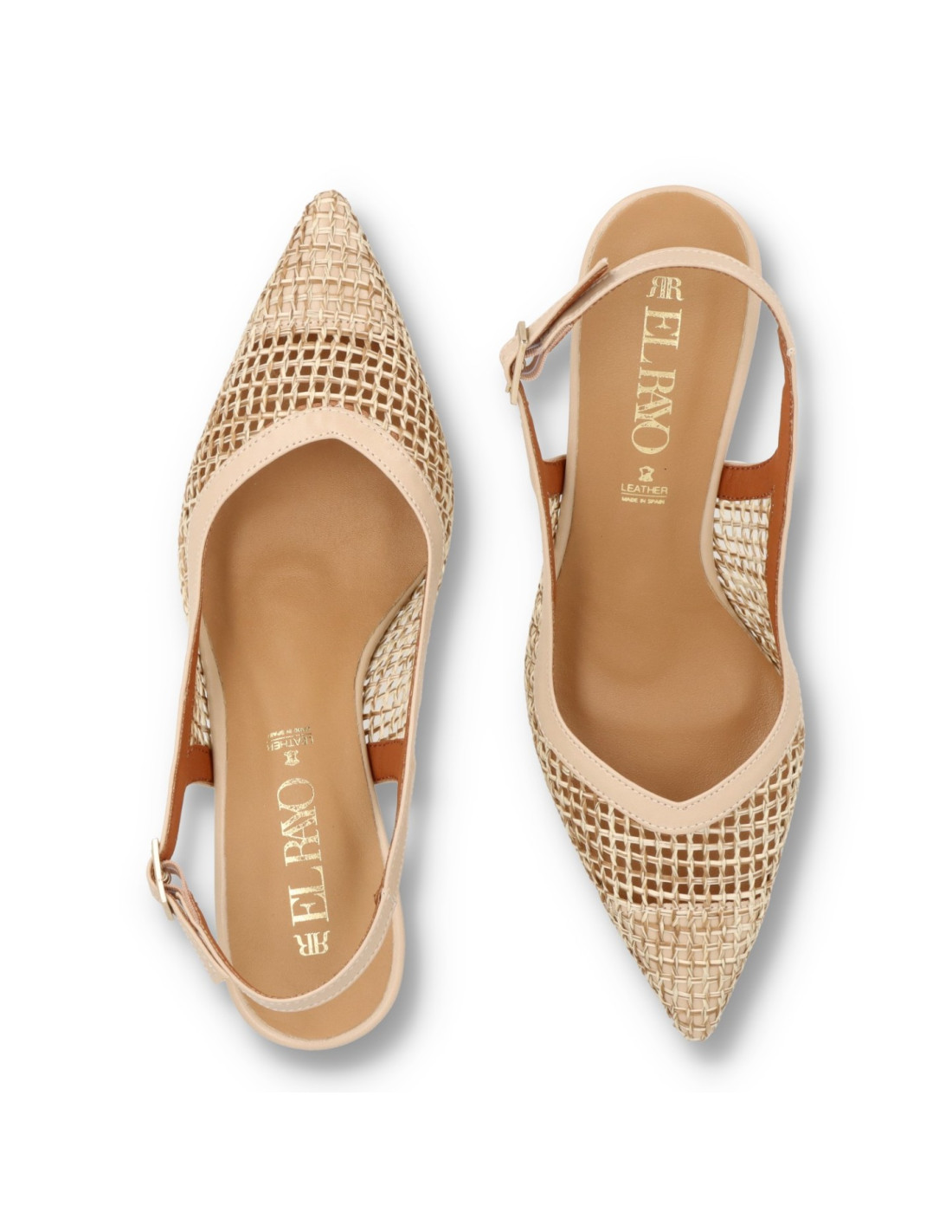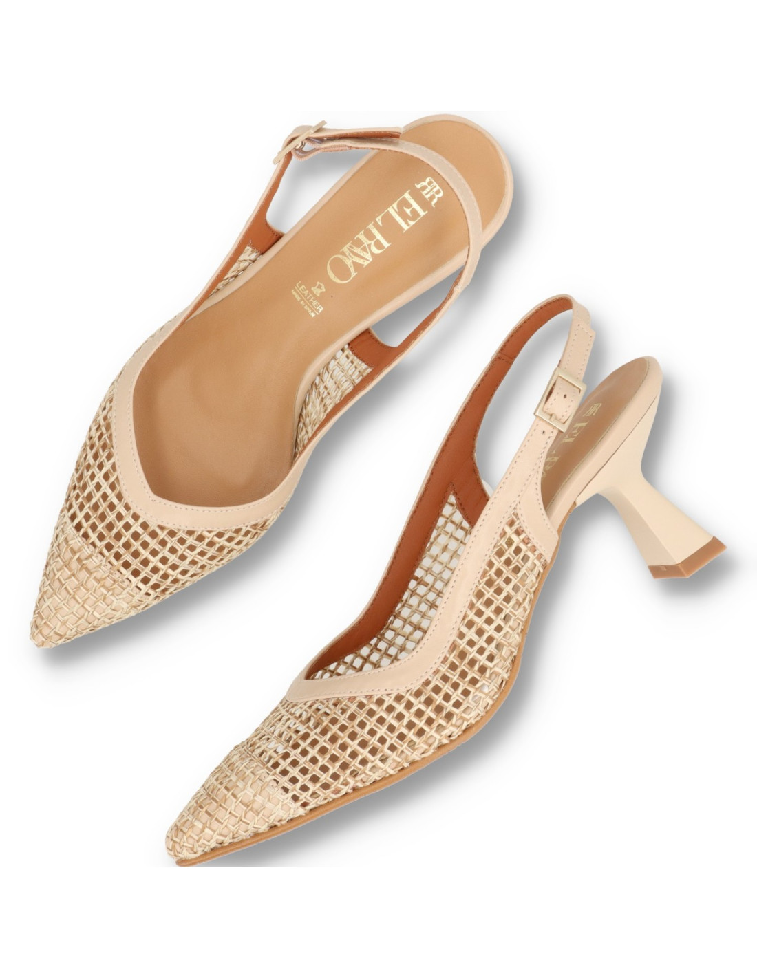 Zapatos de Salón para mujer 2610BD de EL RAYO STUDIO. Salón de PU Leather y rafia con talón ajustable por hebilla. Plantilla interior de piel acolchada para una pisada más confortable. Tacón lacado al tono de unos 8cm de alto con base más ancha. HECHO EN ESPAÑA