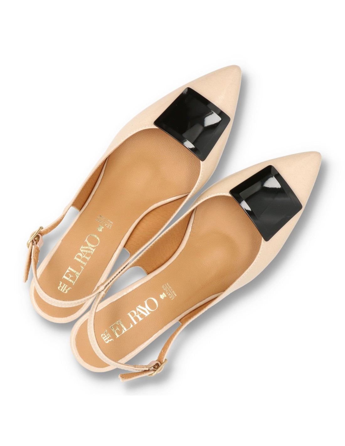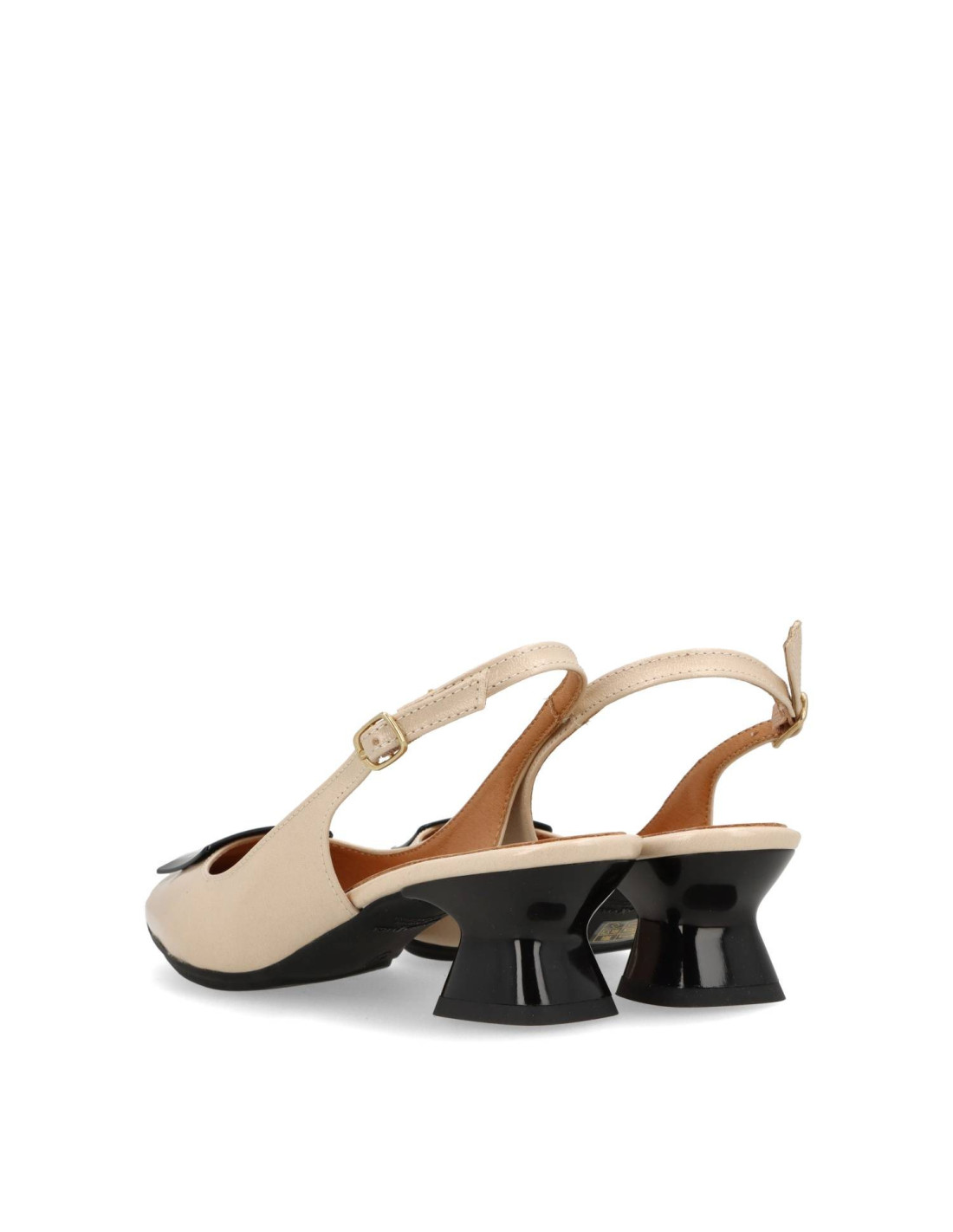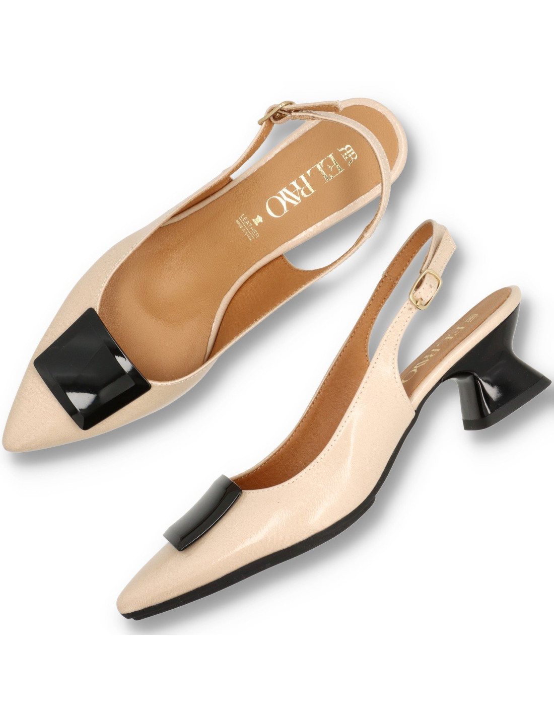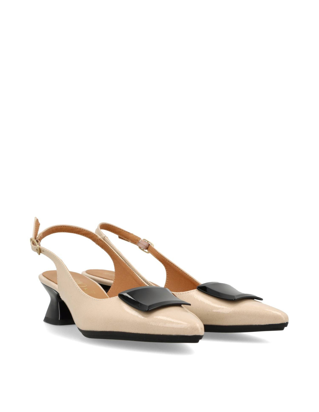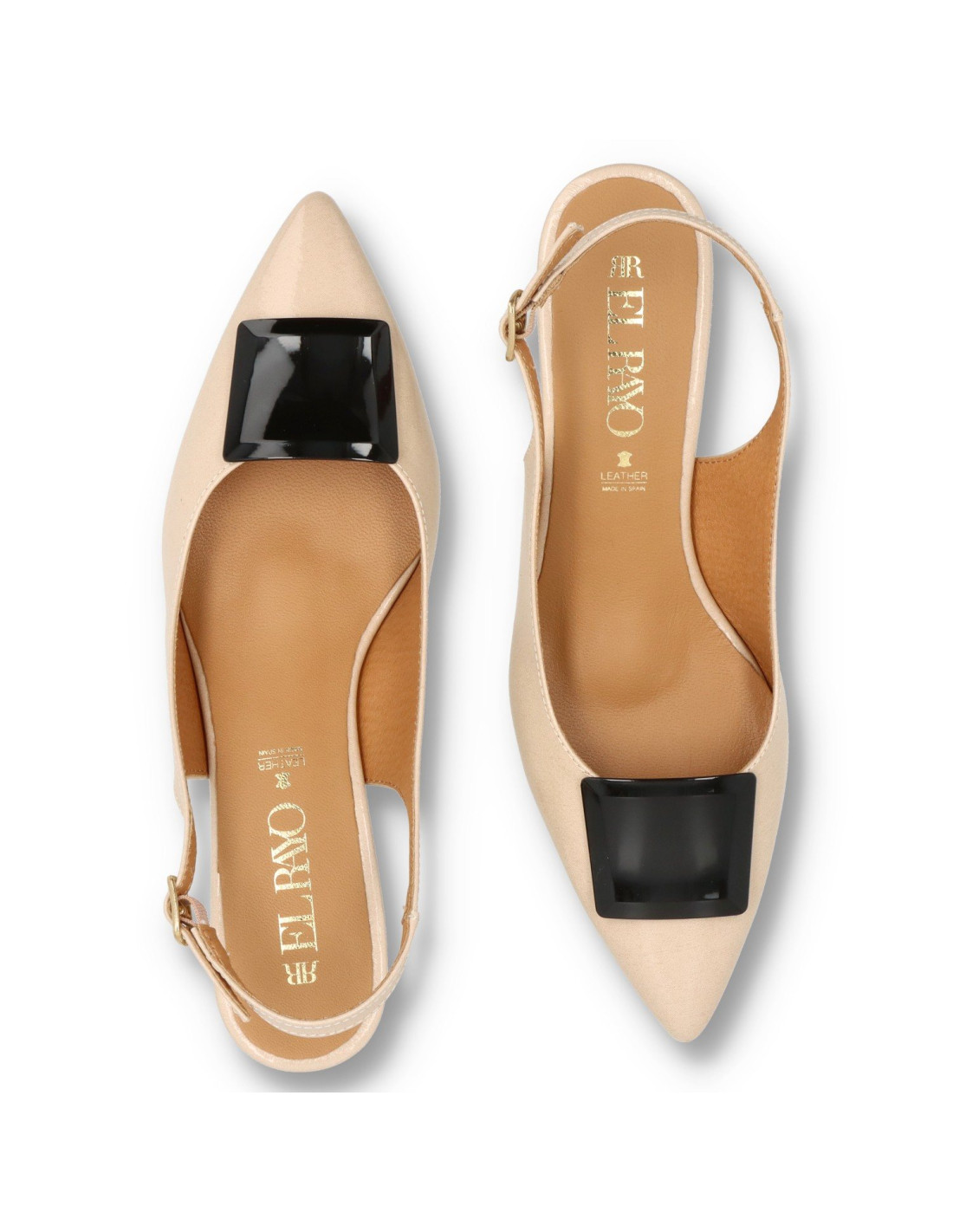 Salón con tacón para mujer 2628 de Daniela Vega. De Pu Leather y plantilla interior de piel 100%vacuno acolchada, forro de material sostenible. Taón tipo carrete lacado de unos 4cm de altura. Talón descubierto con hebilla ajustable. Suela de goma felxibe y horma de punta fina. HECHO EN ESPAÑA