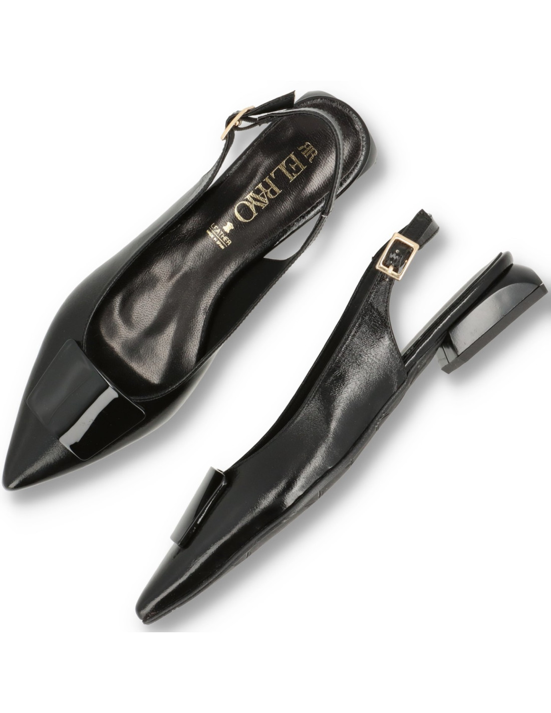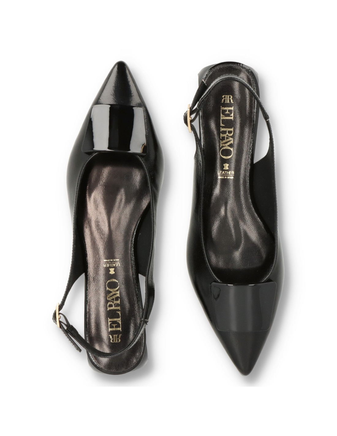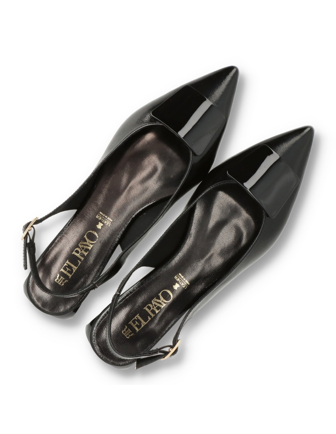 Zapatos de salón planos para mujer 2777 de EL RAYO STUDIO. Salón en PU Leather en color Negro con adorno lacado en pala. Plantilla interior de piel acolchada, para una pisada más confortable. Talón descubierto ajustable por hebilla, tacón lacado al tono de unos 1cm de altura. HECHO EN ESPAÑA