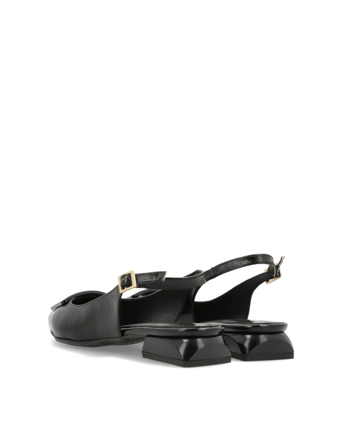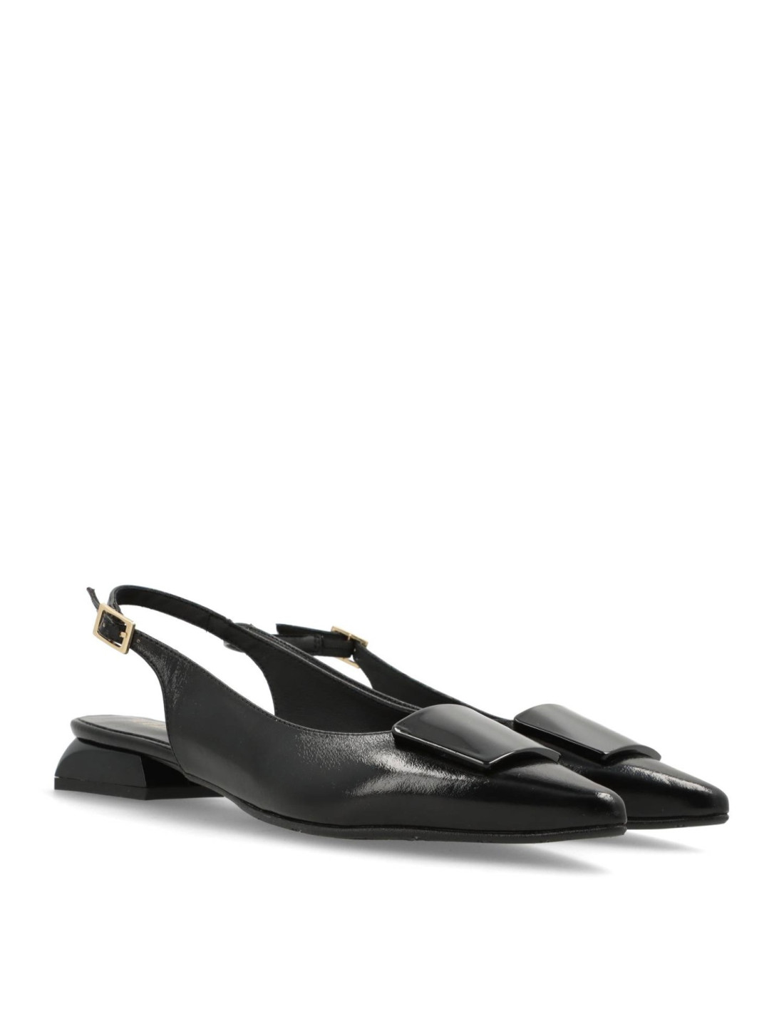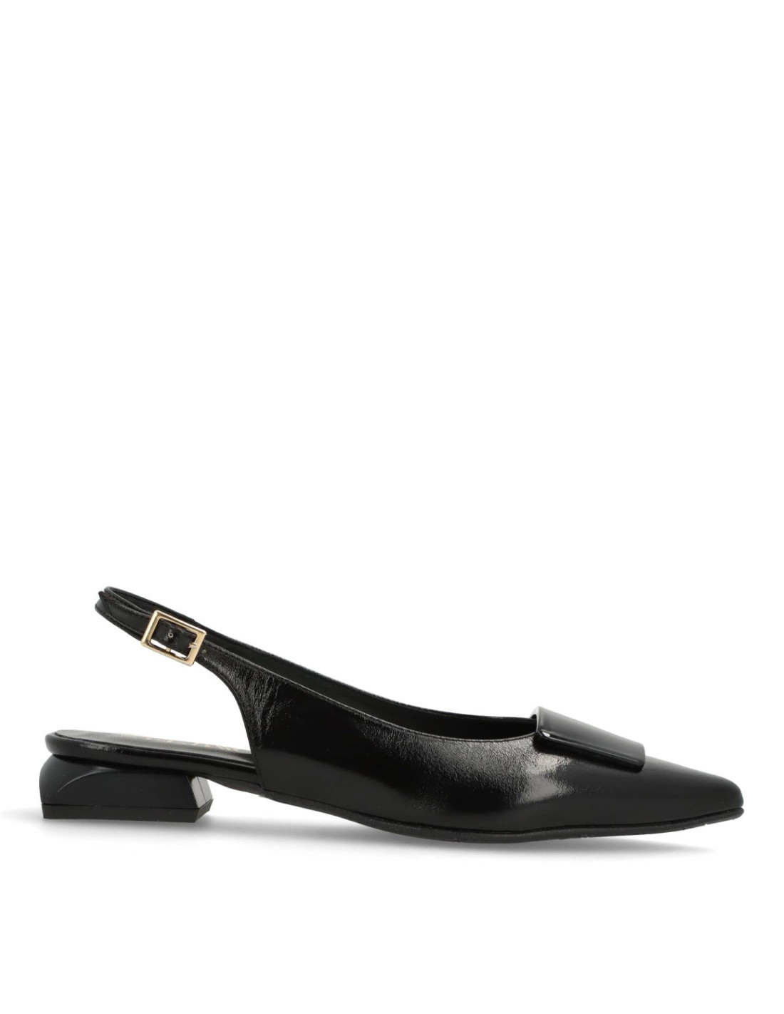 Zapatos de salón planos para mujer 2777 de EL RAYO STUDIO. Salón en PU Leather en color Negro con adorno lacado en pala. Plantilla interior de piel acolchada, para una pisada más confortable. Talón descubierto ajustable por hebilla, tacón lacado al tono de unos 1cm de altura. HECHO EN ESPAÑA