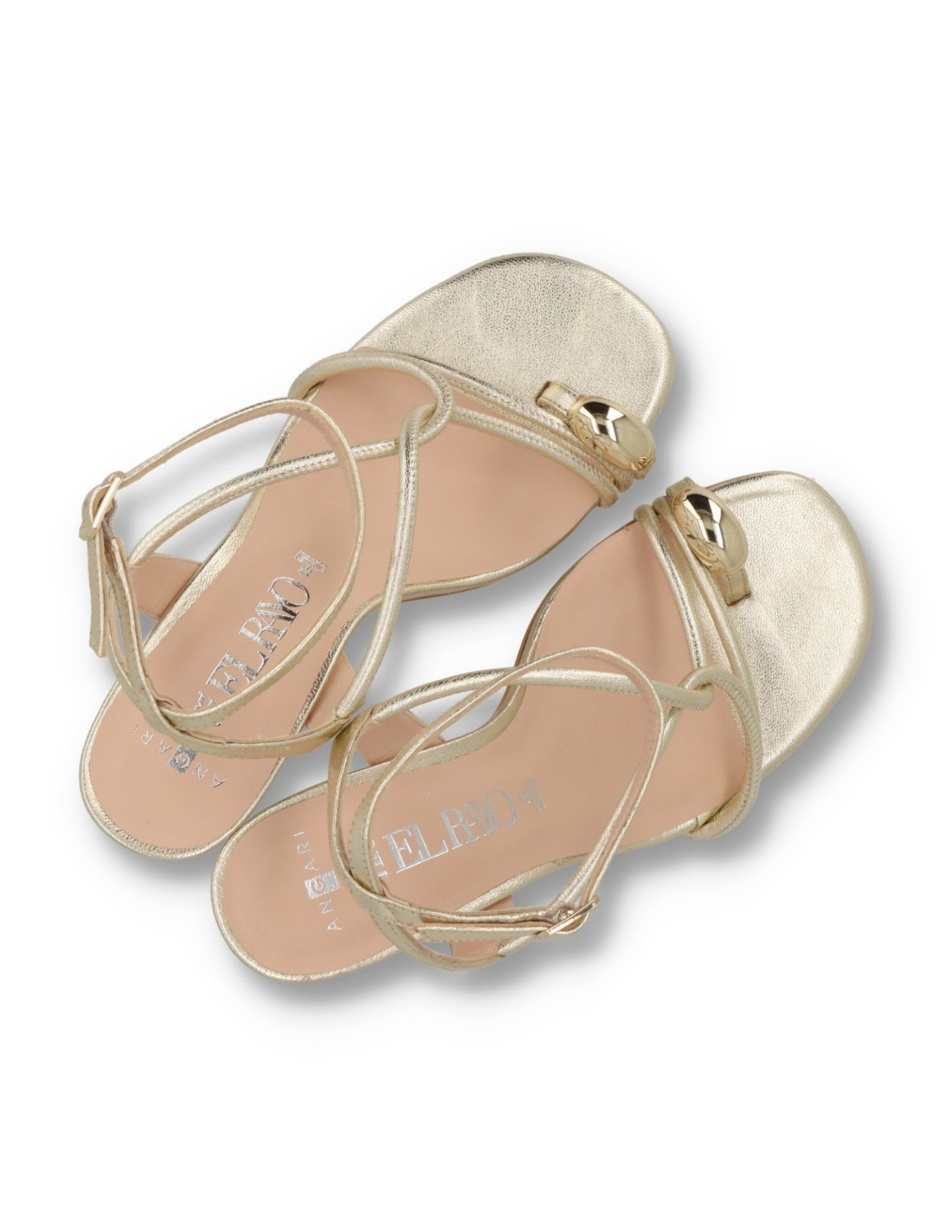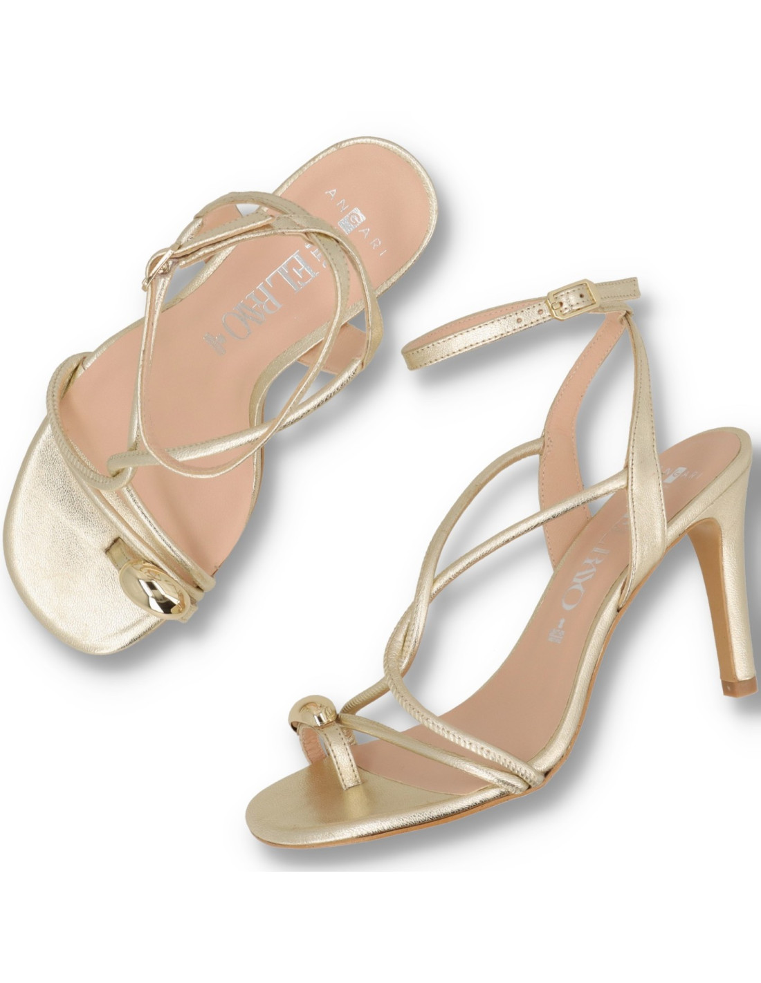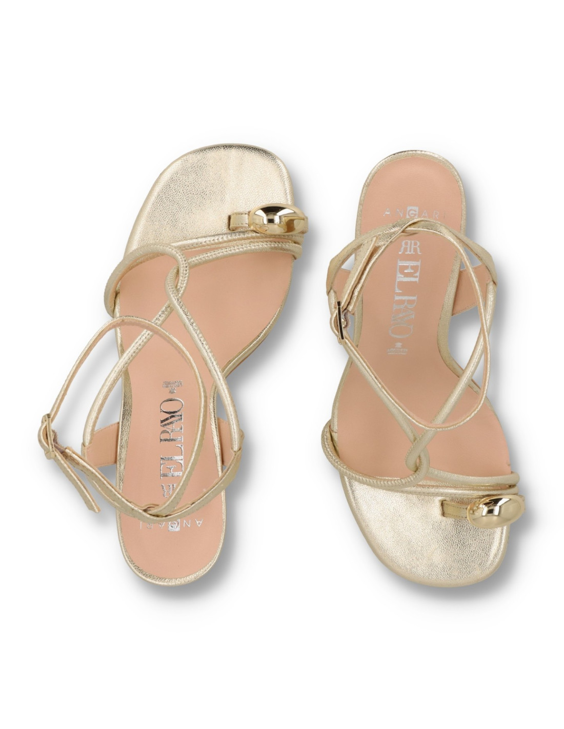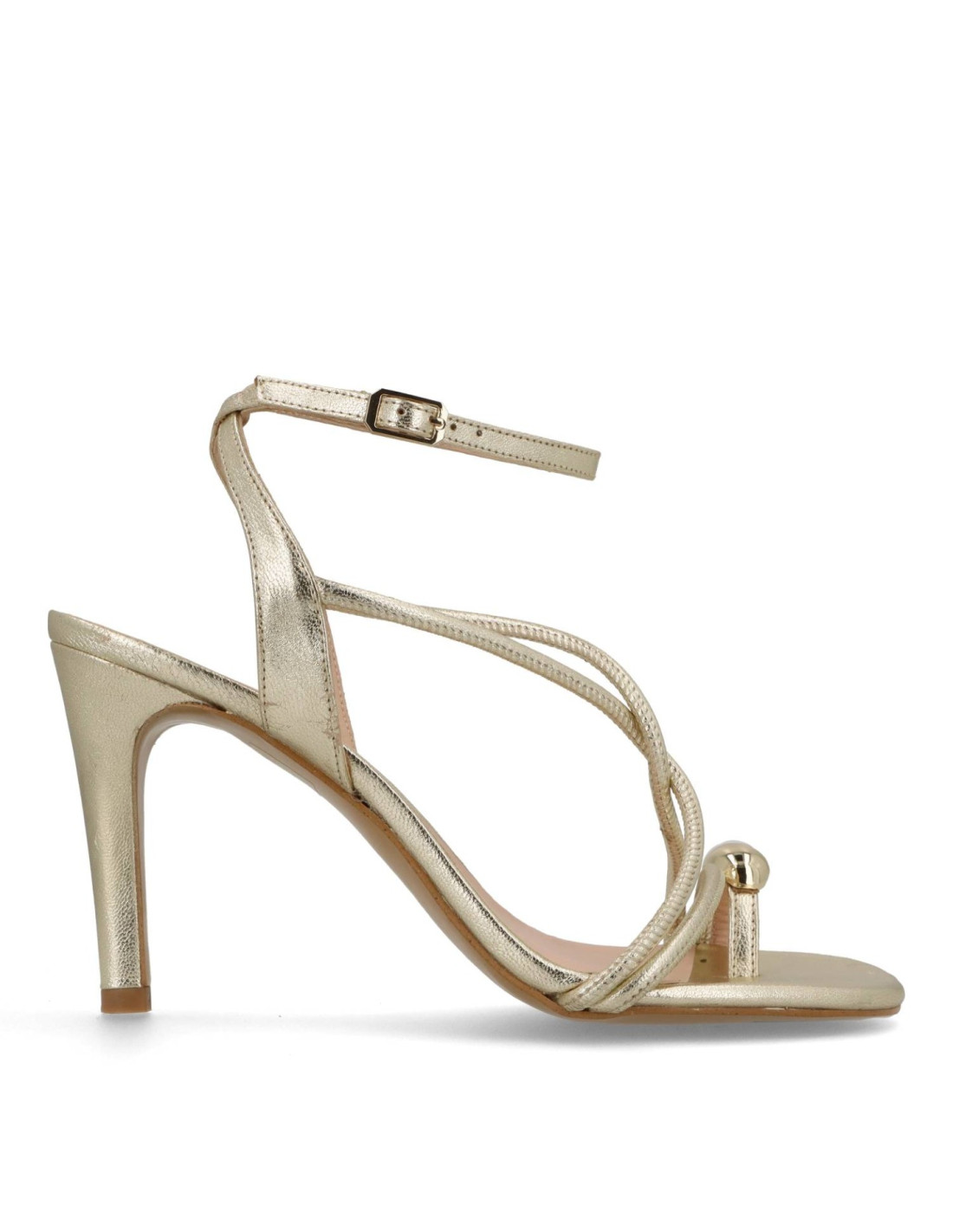 Sandalias para mujer 52075 de Angari. Sandalia toda de piel 100%vacuno acabado metalizado en color CHAMPAGNE, planta interior con memory Gel. Talón pulsera con ajuste mediante hebilla con detalle metálico en el dedo. Tacón de unos 10 cm de altura y suela flexible. HECHO EN ESPAÑA.