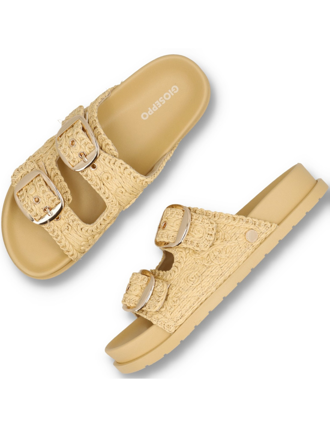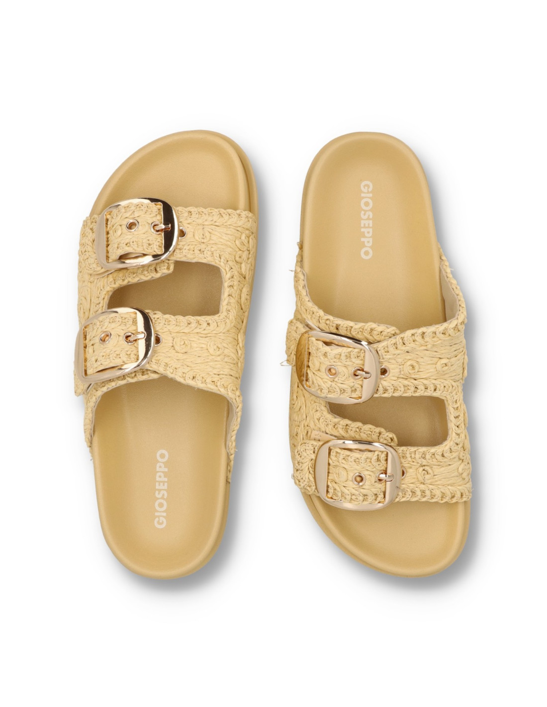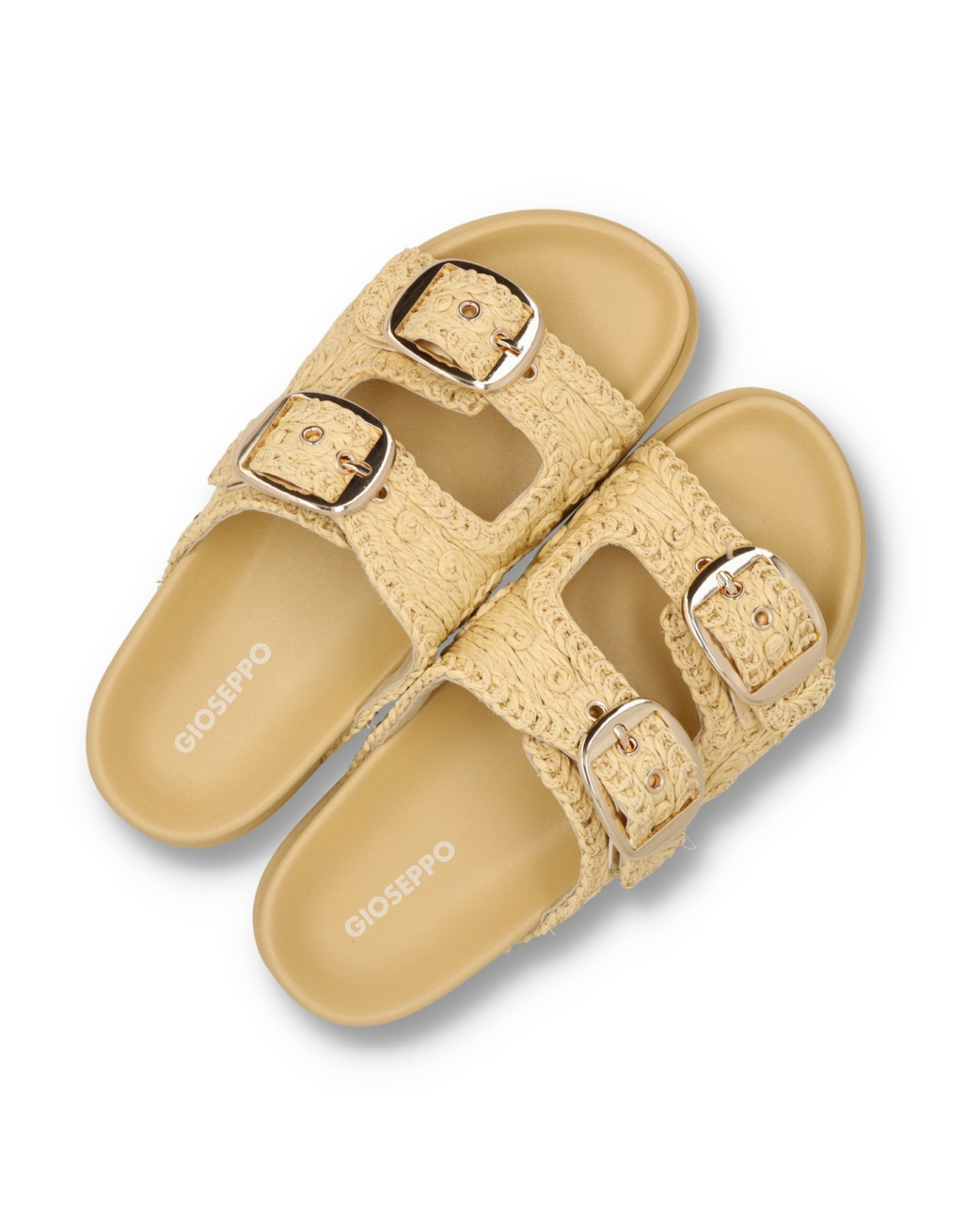 Sandalias Bio para mujer 78374-EULEN de Gioseppo. Sandalias efecto rafia trenzada con motivos florales y hebillas. Cuentan con planta tipo bio forrada y con diseño ergonómico para repartir el peso de manera equilibrada. Altura plataforma: 4 cm.