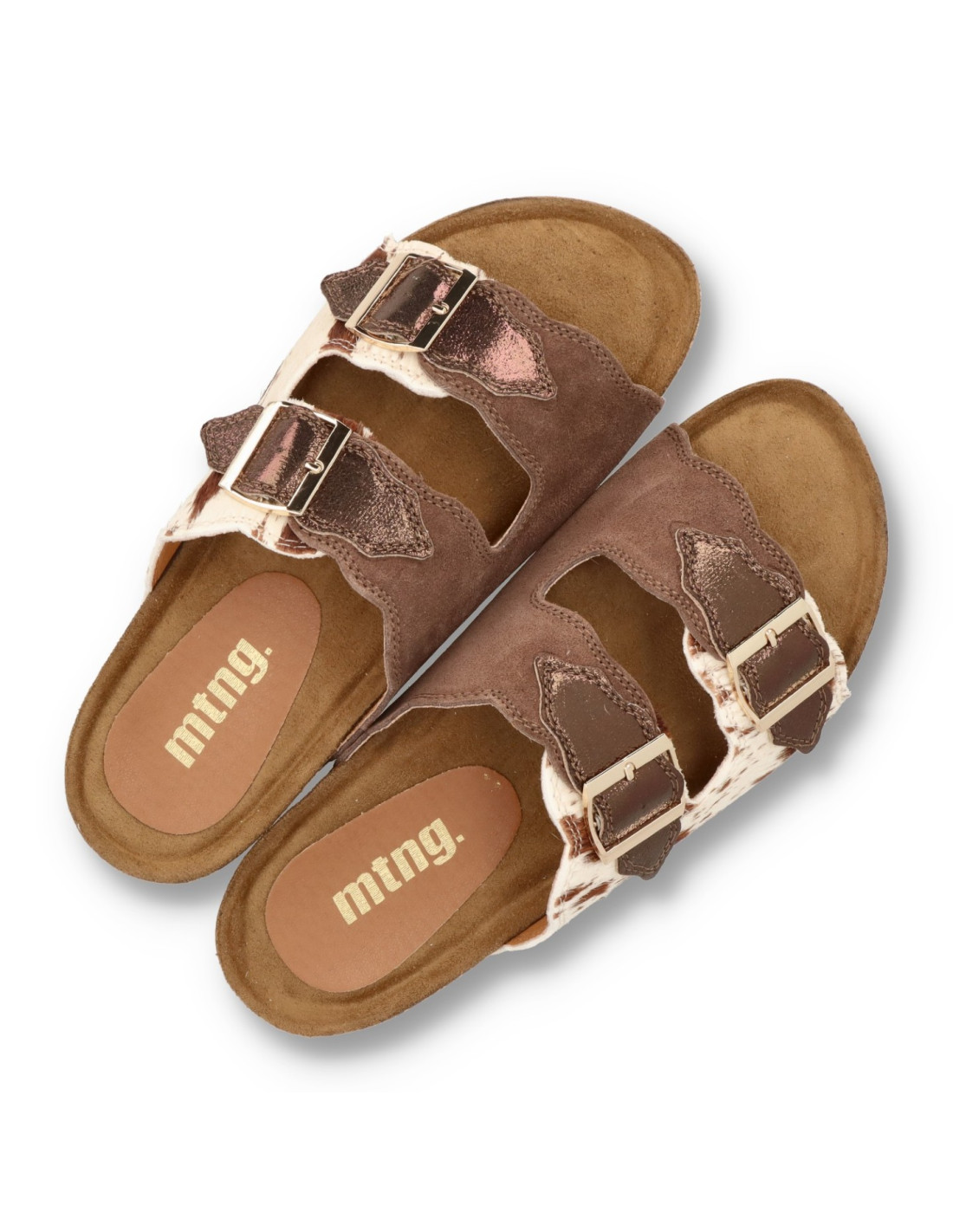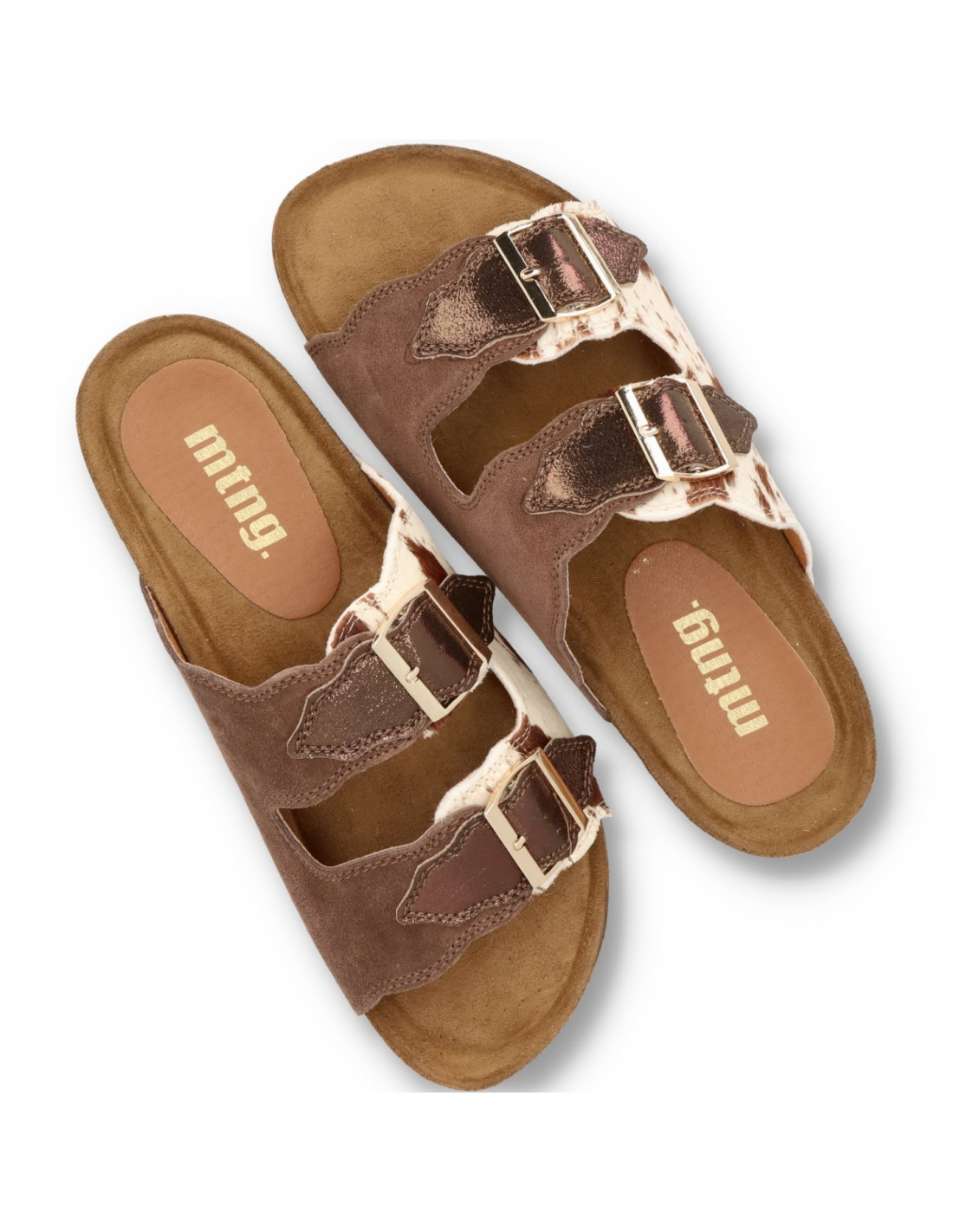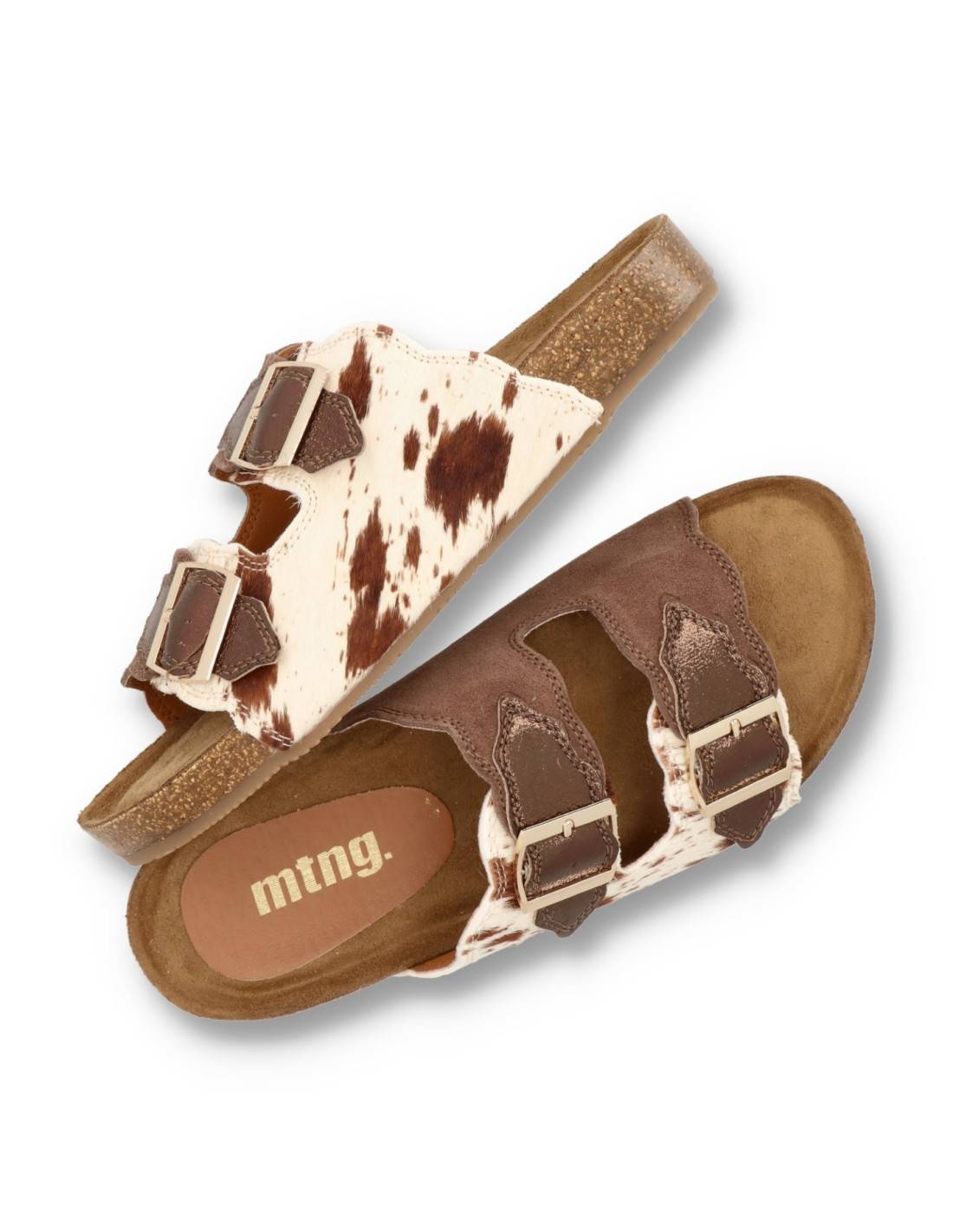 Sandalias para mujer 54085 LIN de Mustang. Sandalias tipo BIO para esta sandalia estilo UGGLY con planta anatómica que aporta una pisada super confortable. En acabado print animal vaca, con hebillas ajustables, piso de goma.