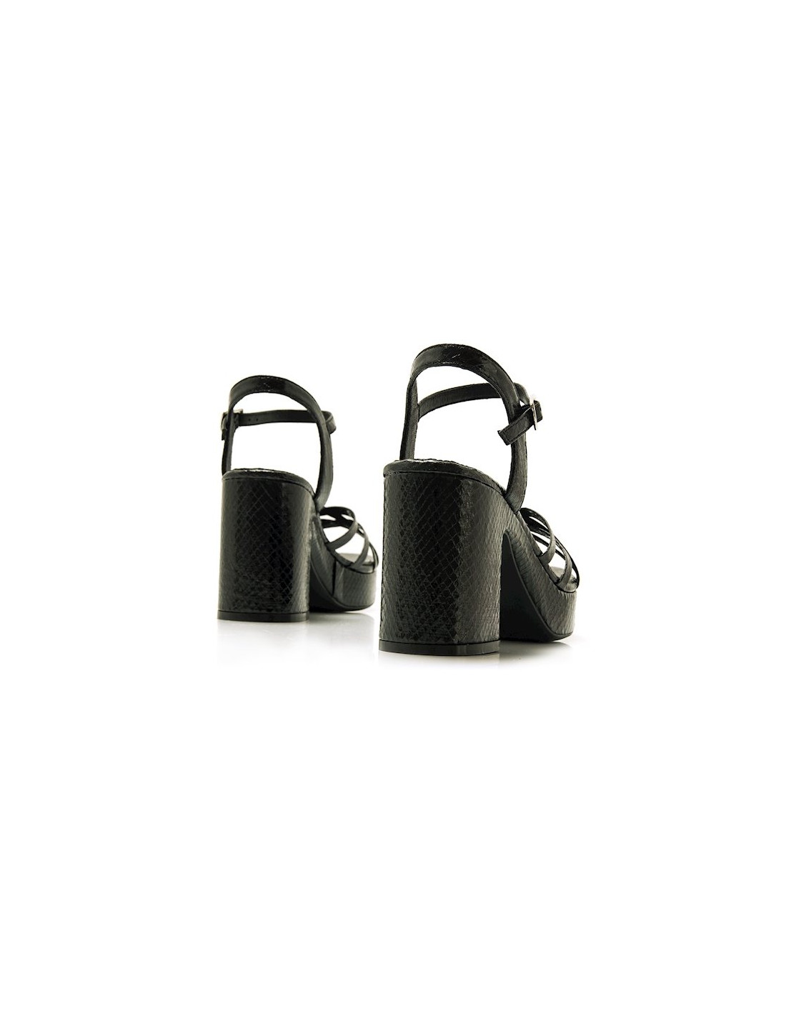 Sandalias de paltaforma para mujer 59609 BRITT de Mustang. Diseñada en color champagne y negro con textura de estilo piel de serpiente. Tacón ancho y comodo de unos 7cm de altura y plataforma de 4cm. Incorpora un set de tiras en el empeine y otra rodeando el tobillo acabada en cierre de hebilla para mayor comodidad. Deslumbrarás en cada pisada.
