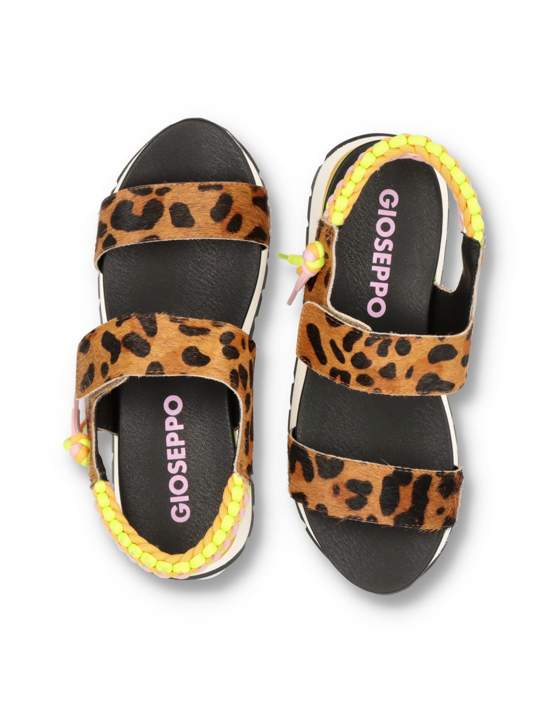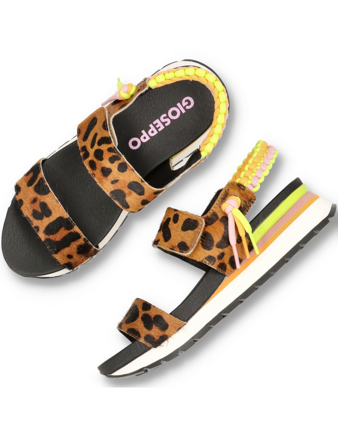 Sandalias con cuña de mujer 74954-LEVERETT de GIOSEPPO. De piel 100%vacuno efecto leopardo y detalles en tejido. Tira delantera ajustable con velcro. Cuña de unos 3,5cm de altura y piso super ligero de eva bicolor.