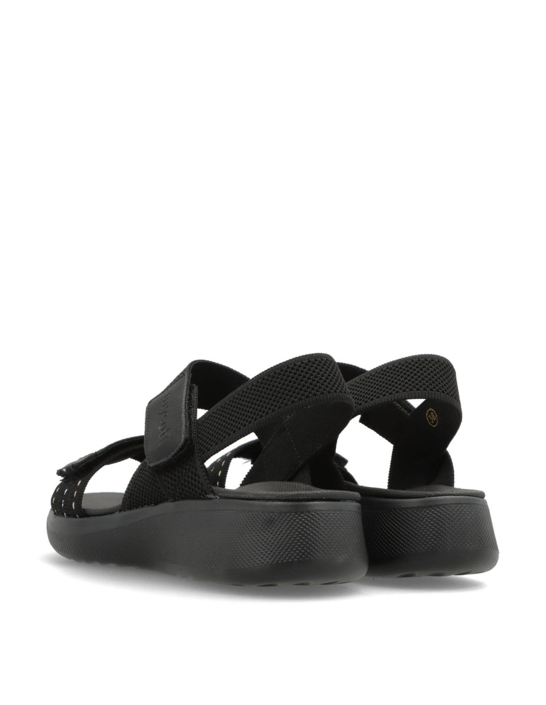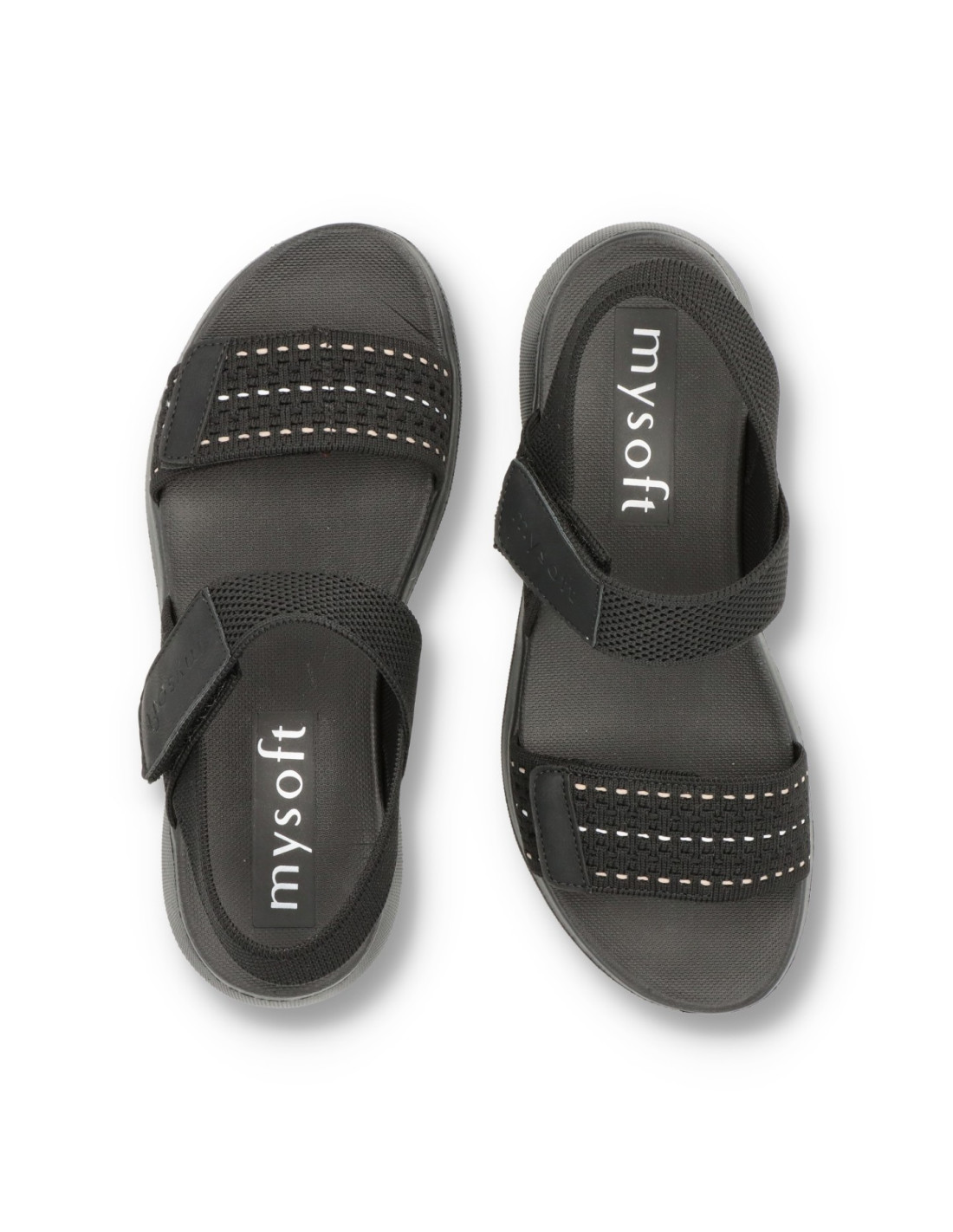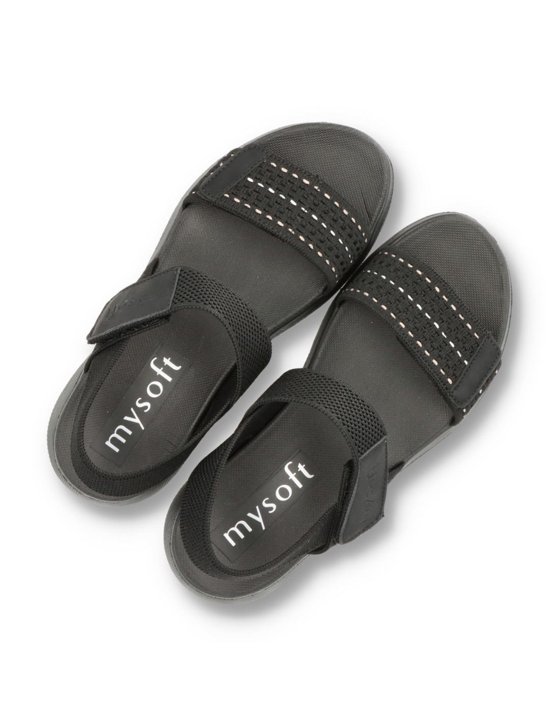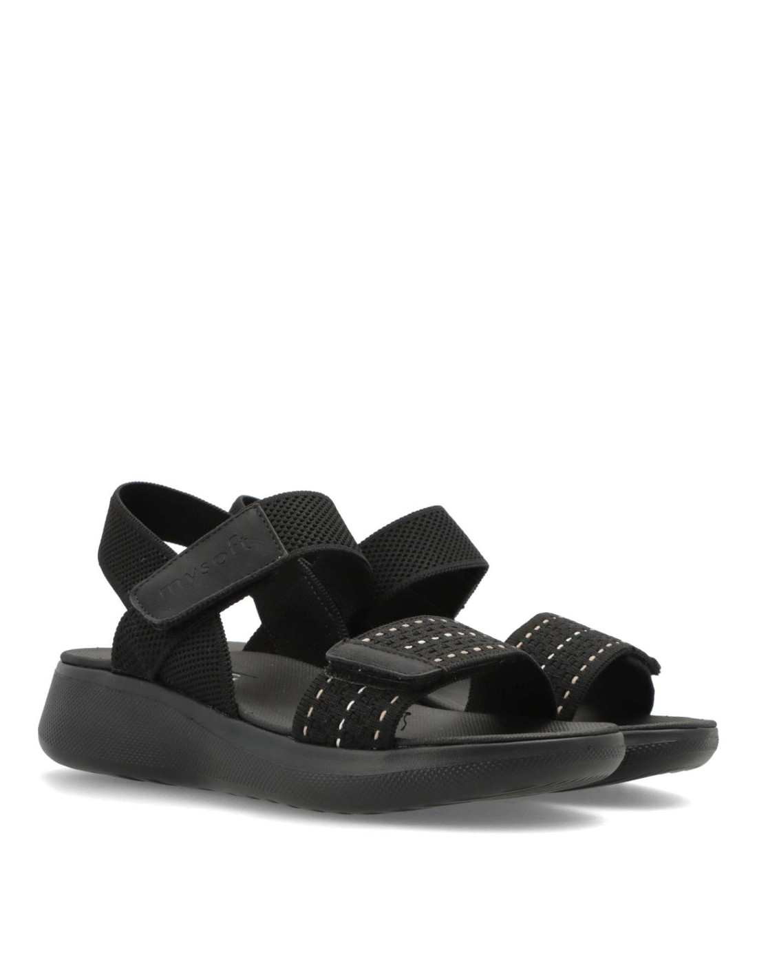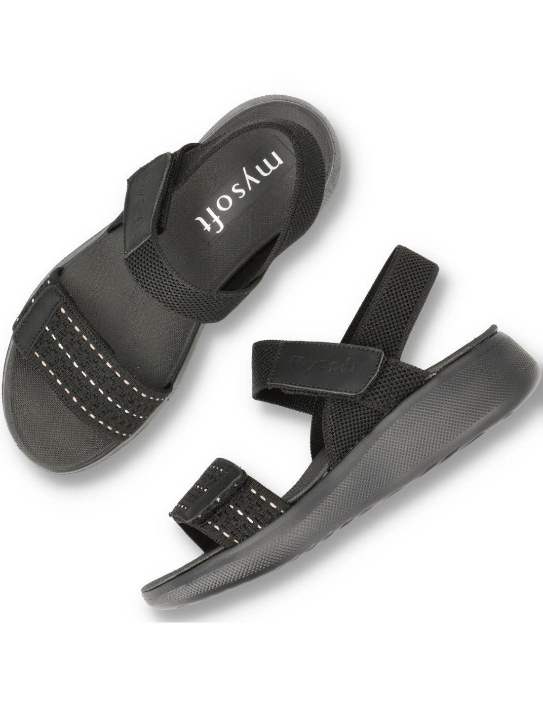 Sandalias con cuña para mujer 26M360 de Mysoft. Sandalia en tejido suave y planta con tecnología Softgel para una pisada más confortable. Talón y pala ajustables por velcro y piso super ligero con cuña de unos 3,5cm de altura.