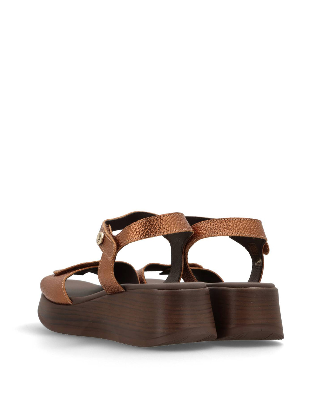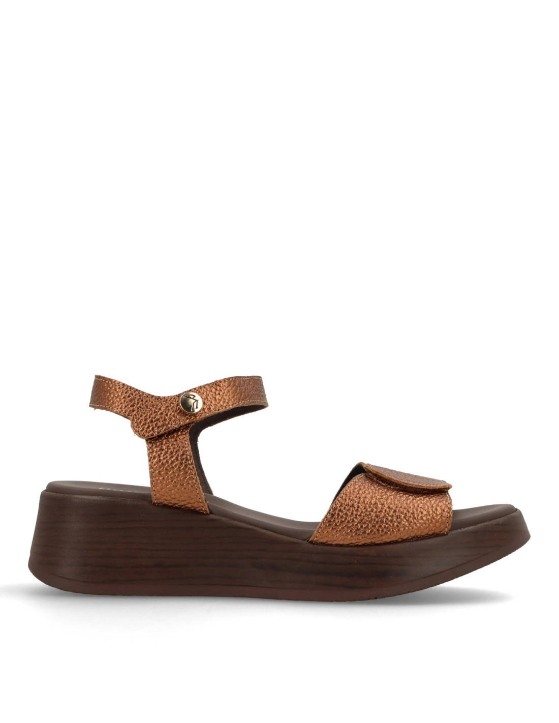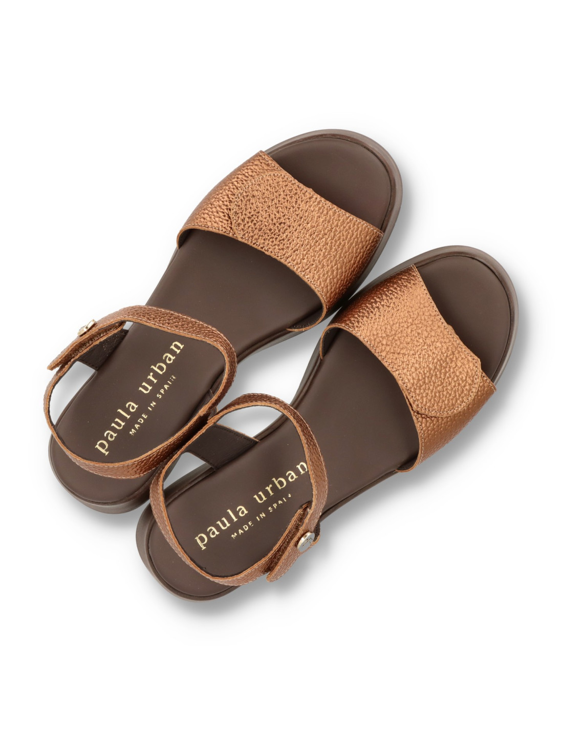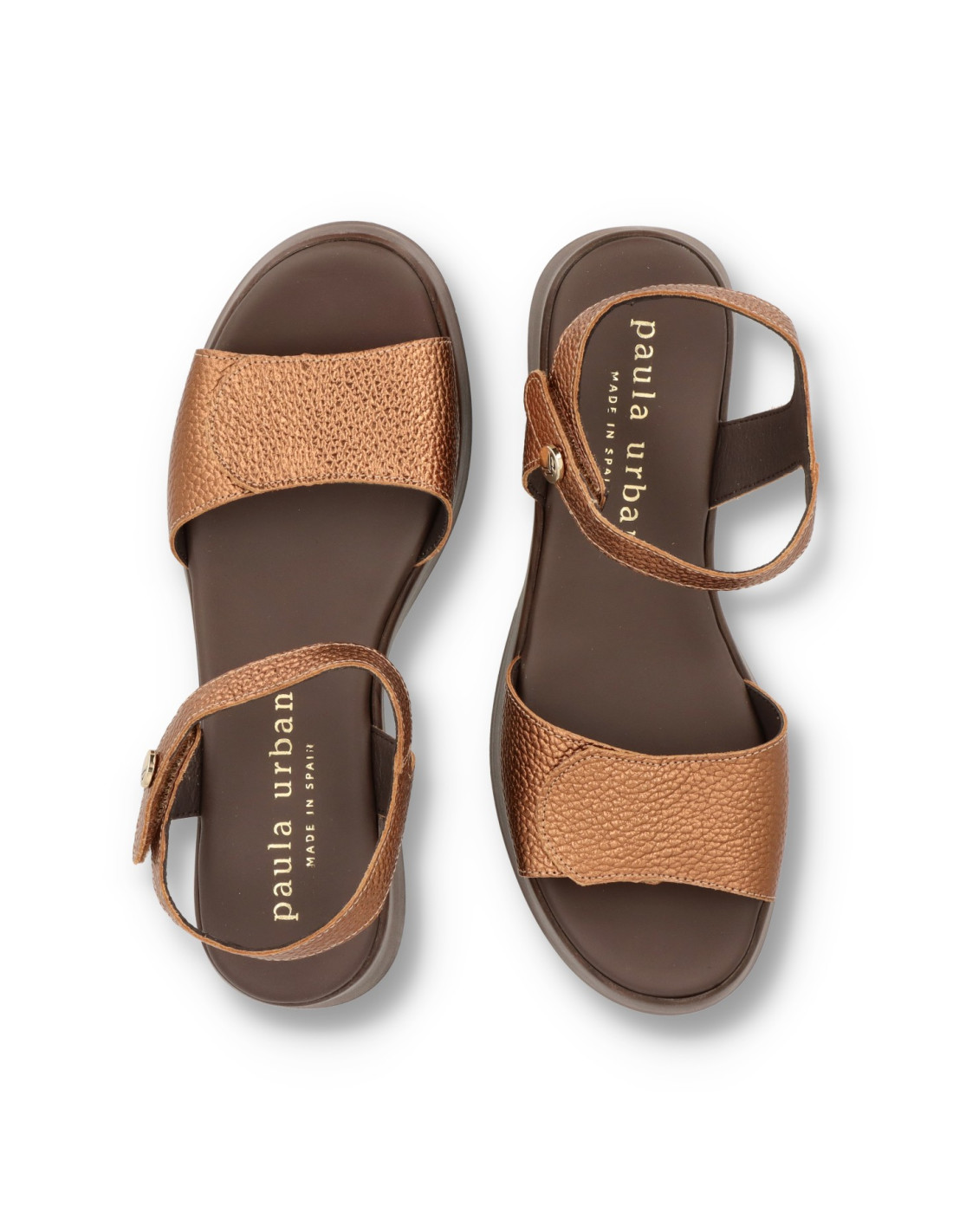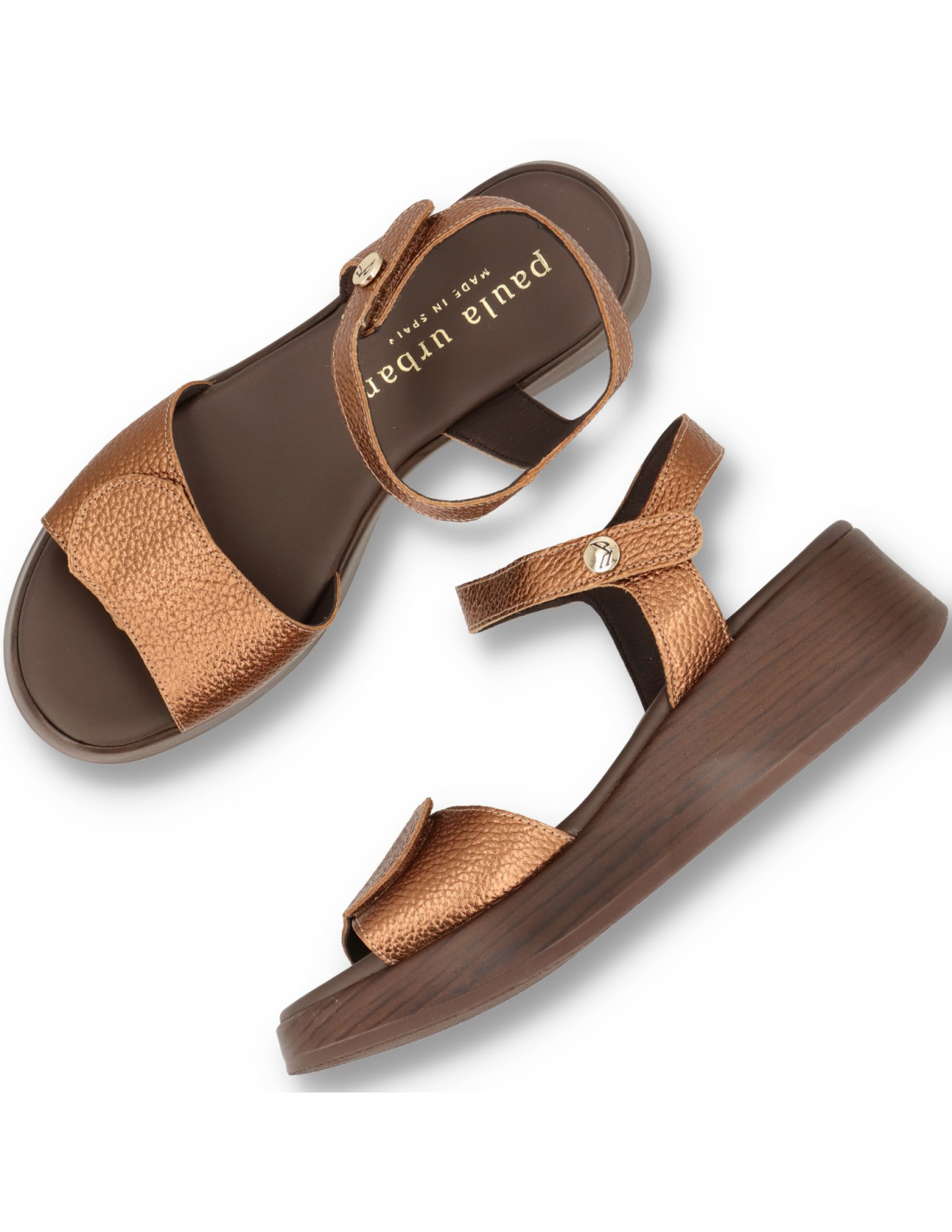 Sandalia de cuña para mujer 33-698 de PAULA URBAN. Sandalia toda de piel 100%vacuno acabado metalizado BRONCE, con planta interior con tecnología Flot Up System. Talón ajustable mediante cierre de velcro. Piso super ligero de poliuretano con una altura de unos 5,5cm. FABRICADO EN ESPAÑA.