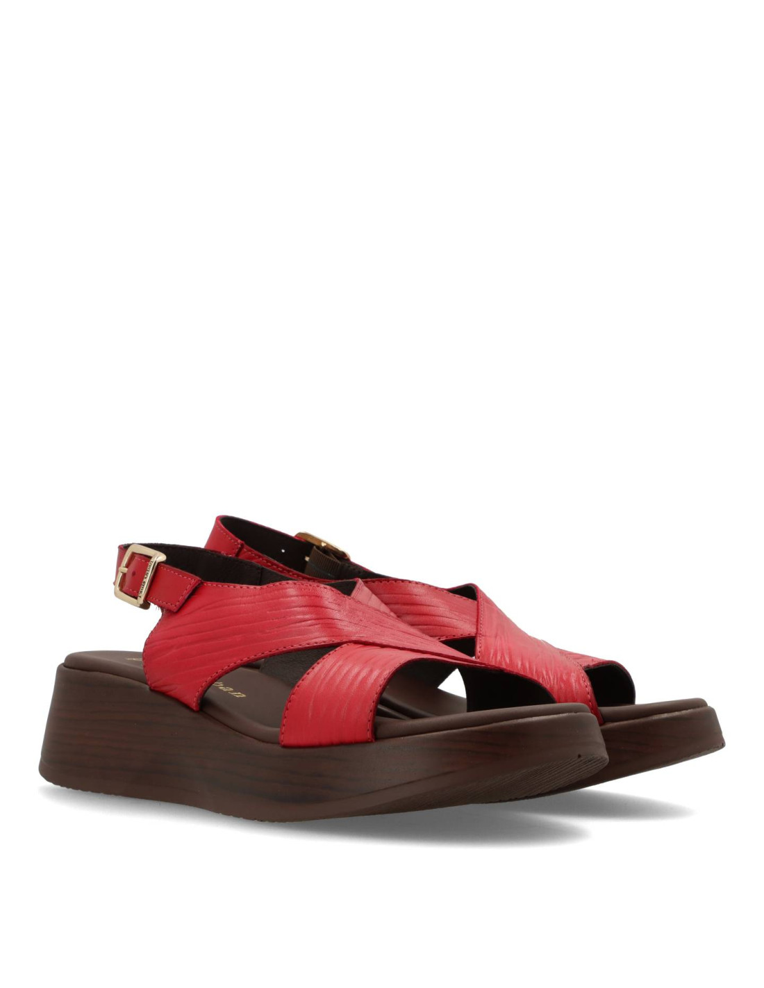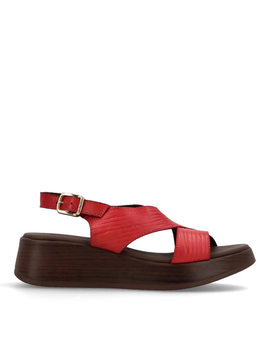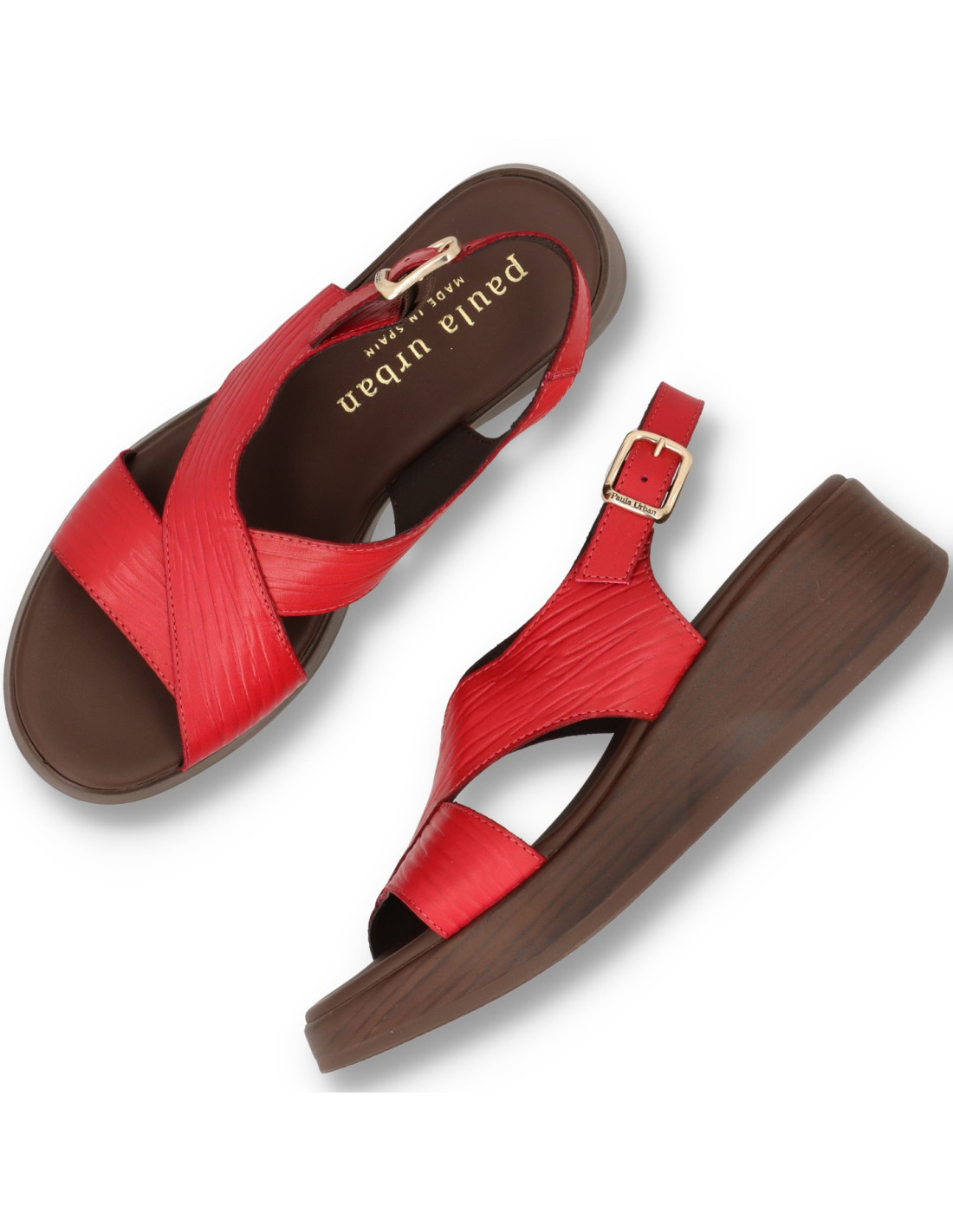 Sandalia de cuña para mujer 33-833 de PAULA URBAN. Sandalia toda de piel 100%vacuno en color CEREZA, con planta interior con tecnología Flot Up System. Piso super ligero de poliuretano con una altura de unos 5,5cm. FABRICADO EN ESPAÑA.