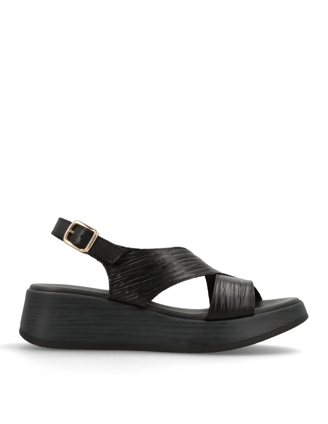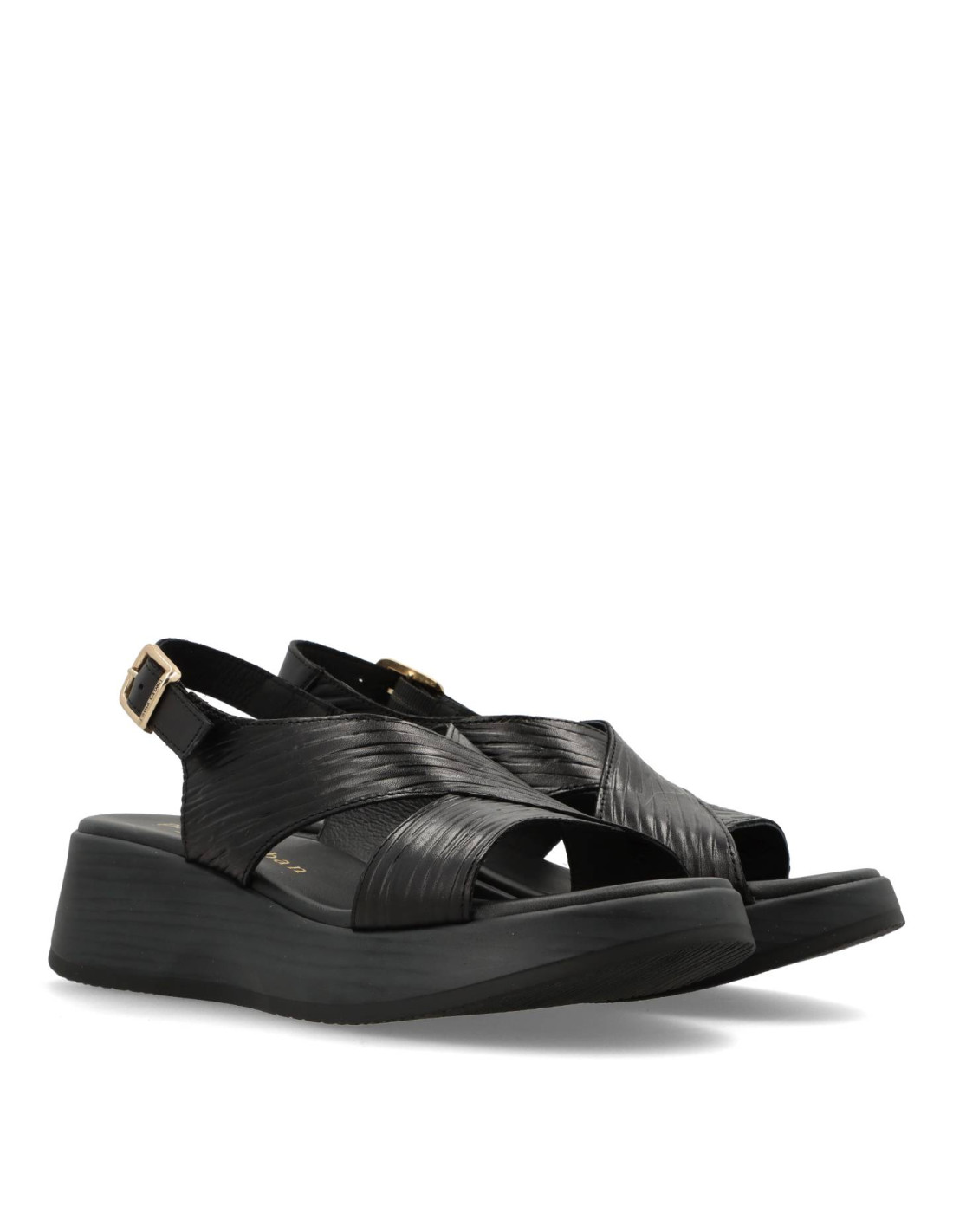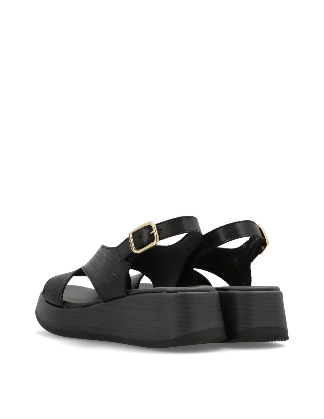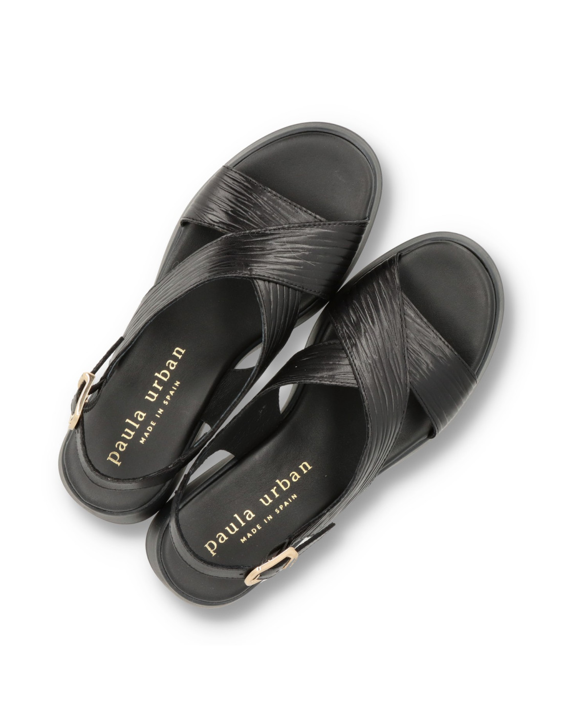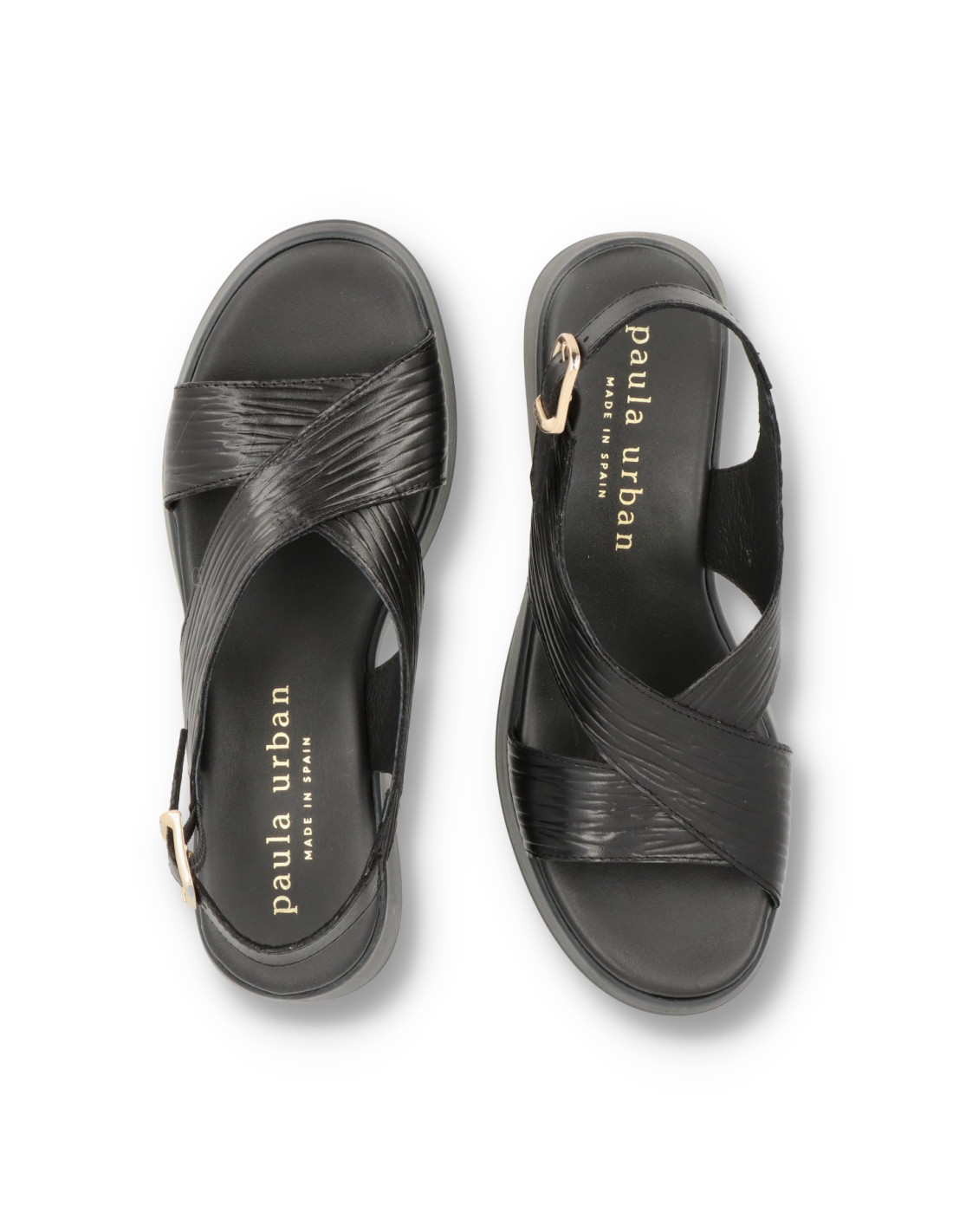 Sandalia de cuña para mujer 33-833 de PAULA URBAN. Sandalia toda de piel 100%vacuno en color NEGRO, con planta interior con tecnología Flot Up System. Piso super ligero de poliuretano con una altura de unos 5,5cm. FABRICADO EN ESPAÑA.