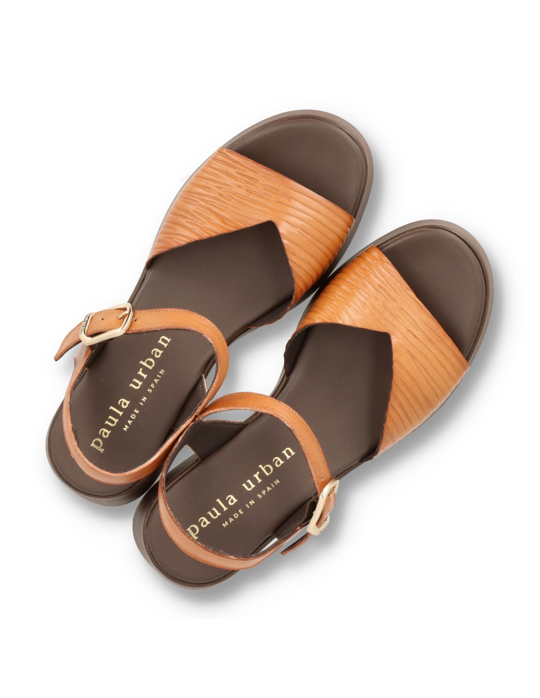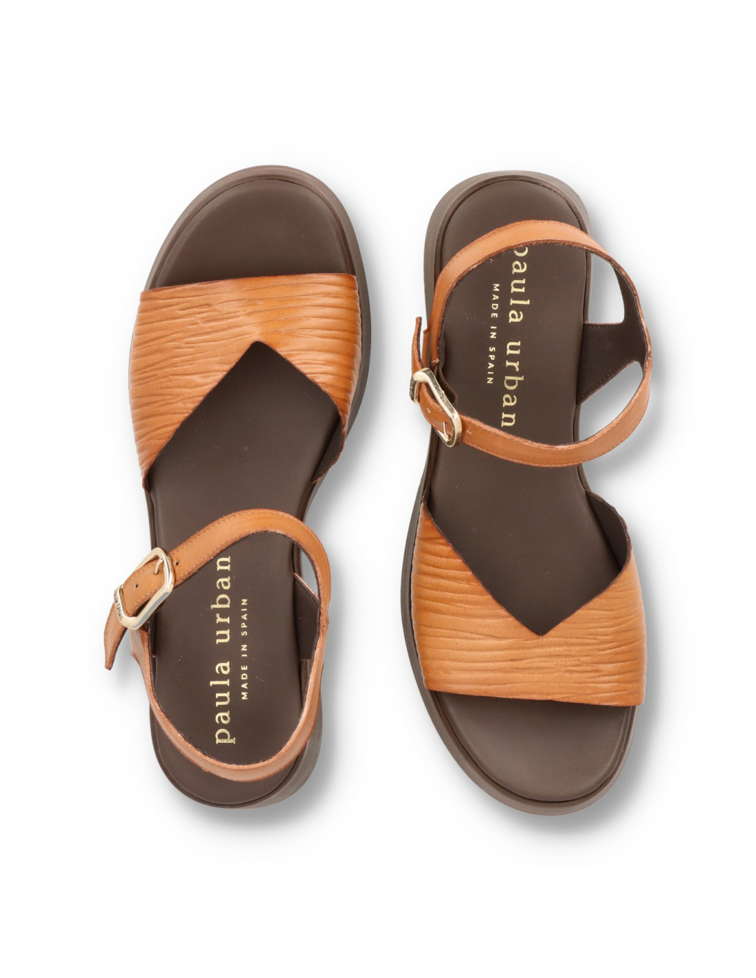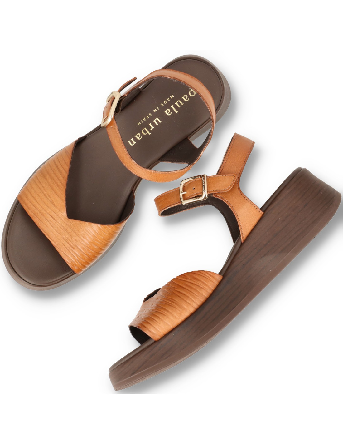 Sandalia de cuña para mujer 33-837 de PAULA URBAN. Sandalia toda de piel 100%vacuno en color AVELLANA, con planta interior con tecnología Flot Up System. Piso super ligero de poliuretano con una altura de unos 5,5cm. FABRICADO EN ESPAÑA.