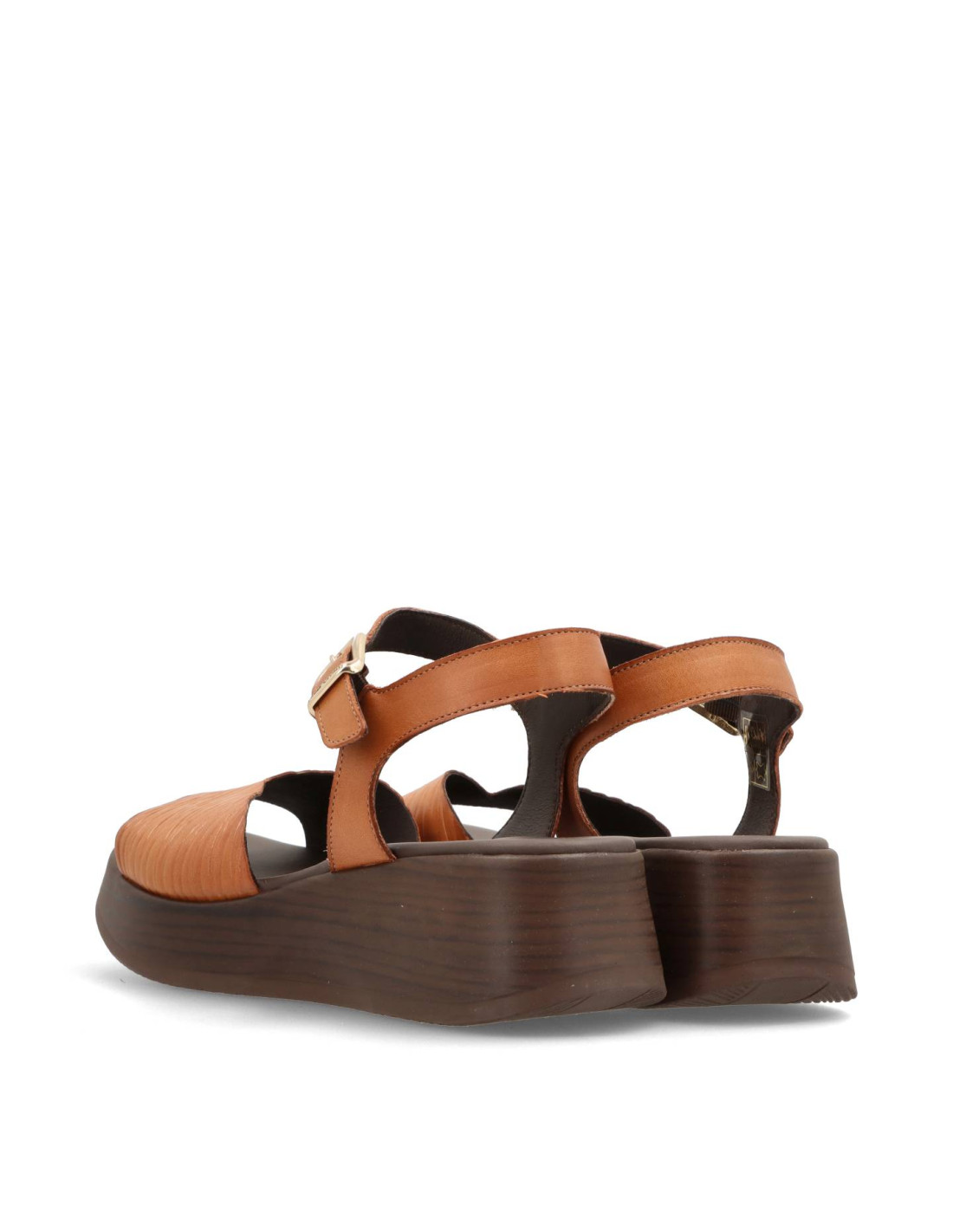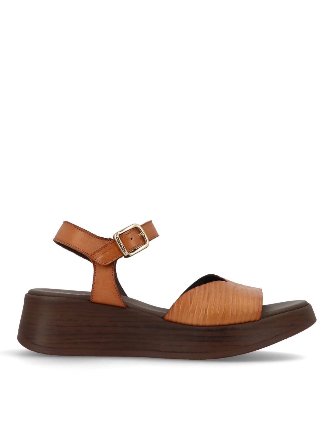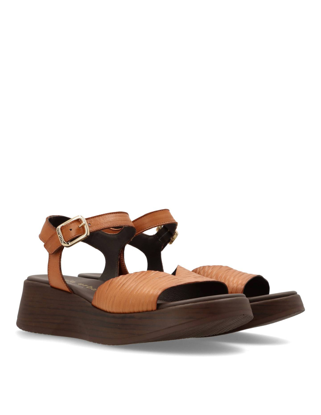 Sandalia de cuña para mujer 33-837 de PAULA URBAN. Sandalia toda de piel 100%vacuno en color AVELLANA, con planta interior con tecnología Flot Up System. Piso super ligero de poliuretano con una altura de unos 5,5cm. FABRICADO EN ESPAÑA.