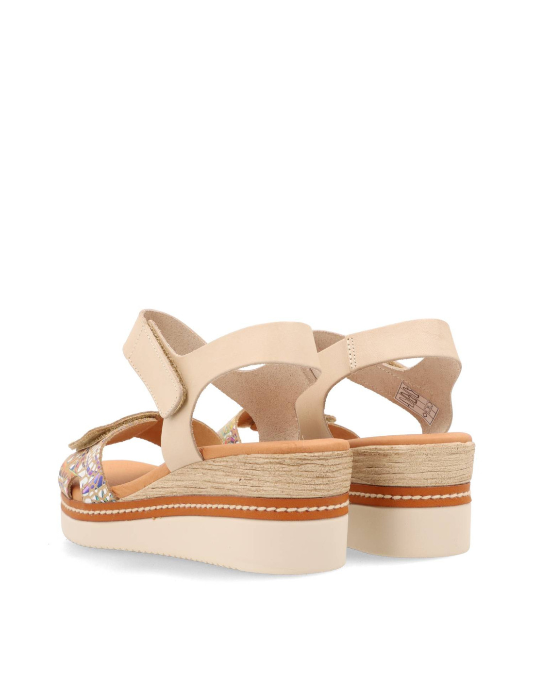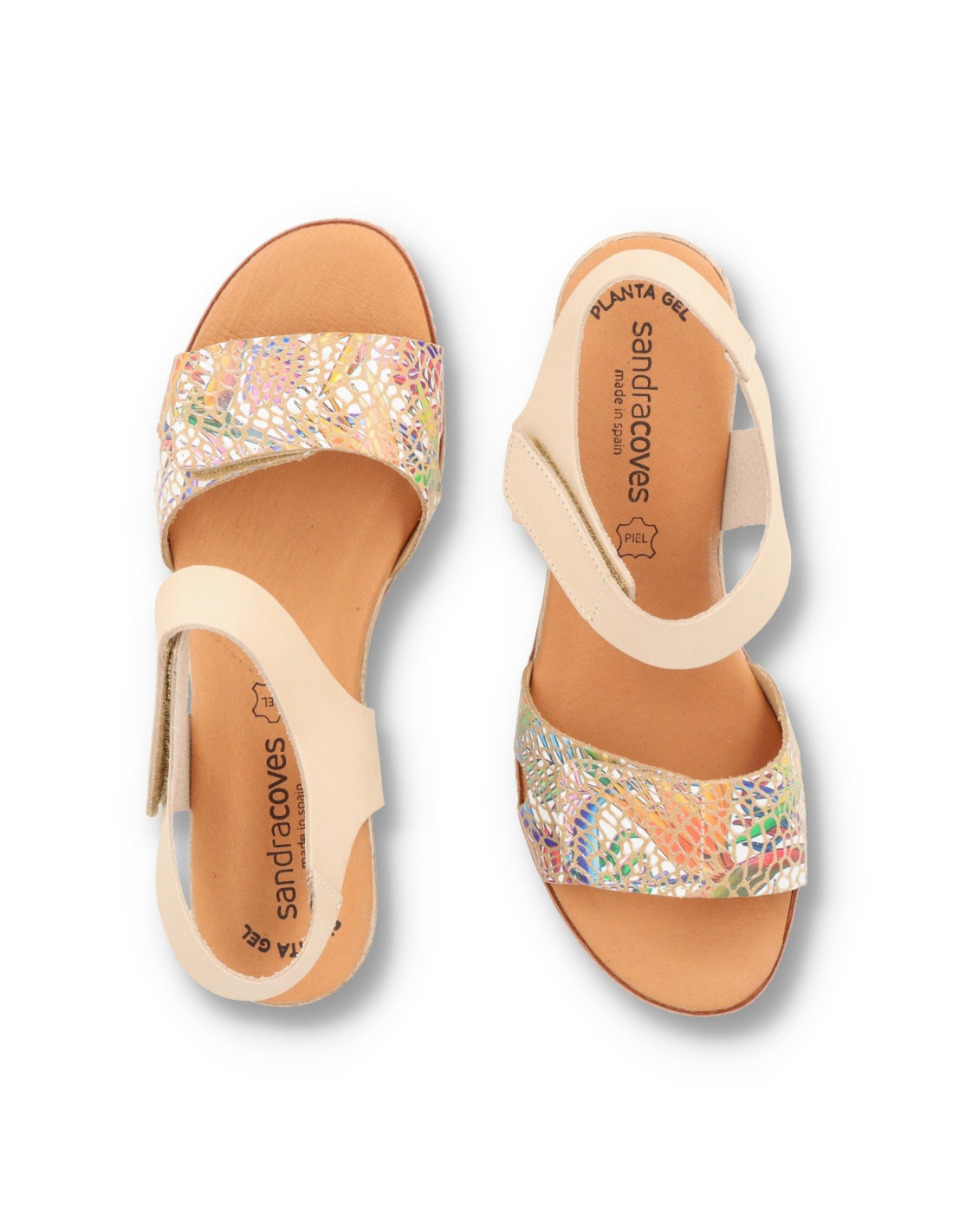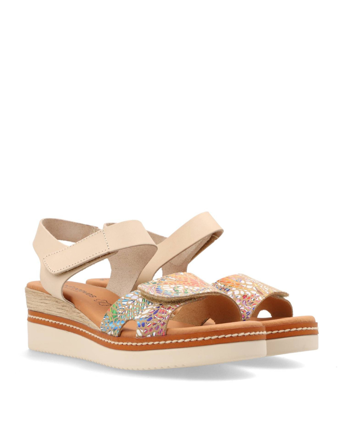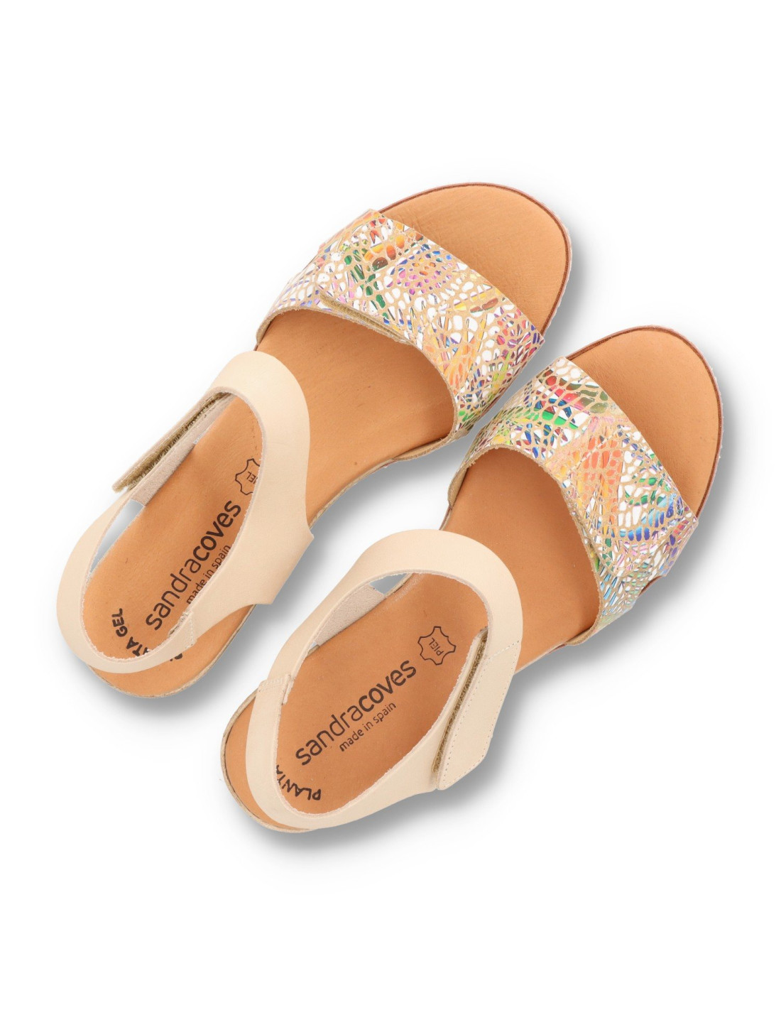 Sandalias de cuña para mujer 565I de RAYO TRENDS. De piel 100%vacuno acabado natural y multicolor, con planta de gel forrada de piel para una piasad más comoda. Talón y pala con velcro ajustable, suela ligera de poliuretano con cuña de unos 8cm de altura.HECHO EN ESPAÑA