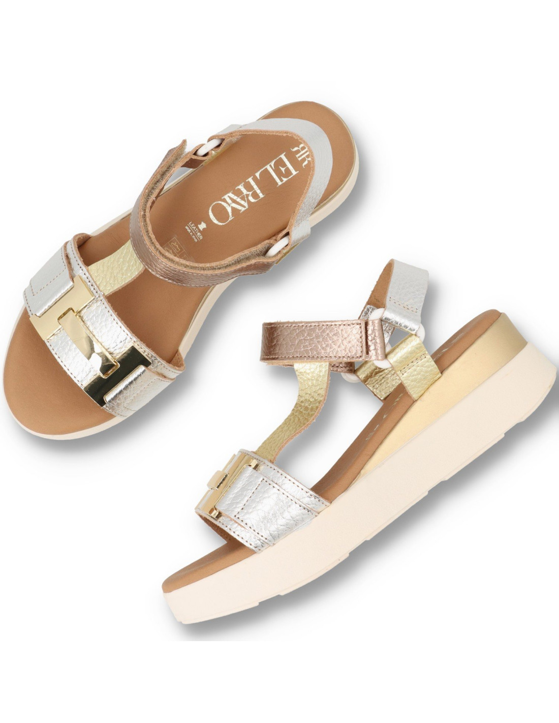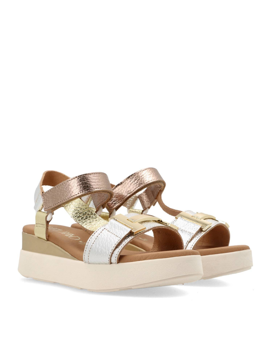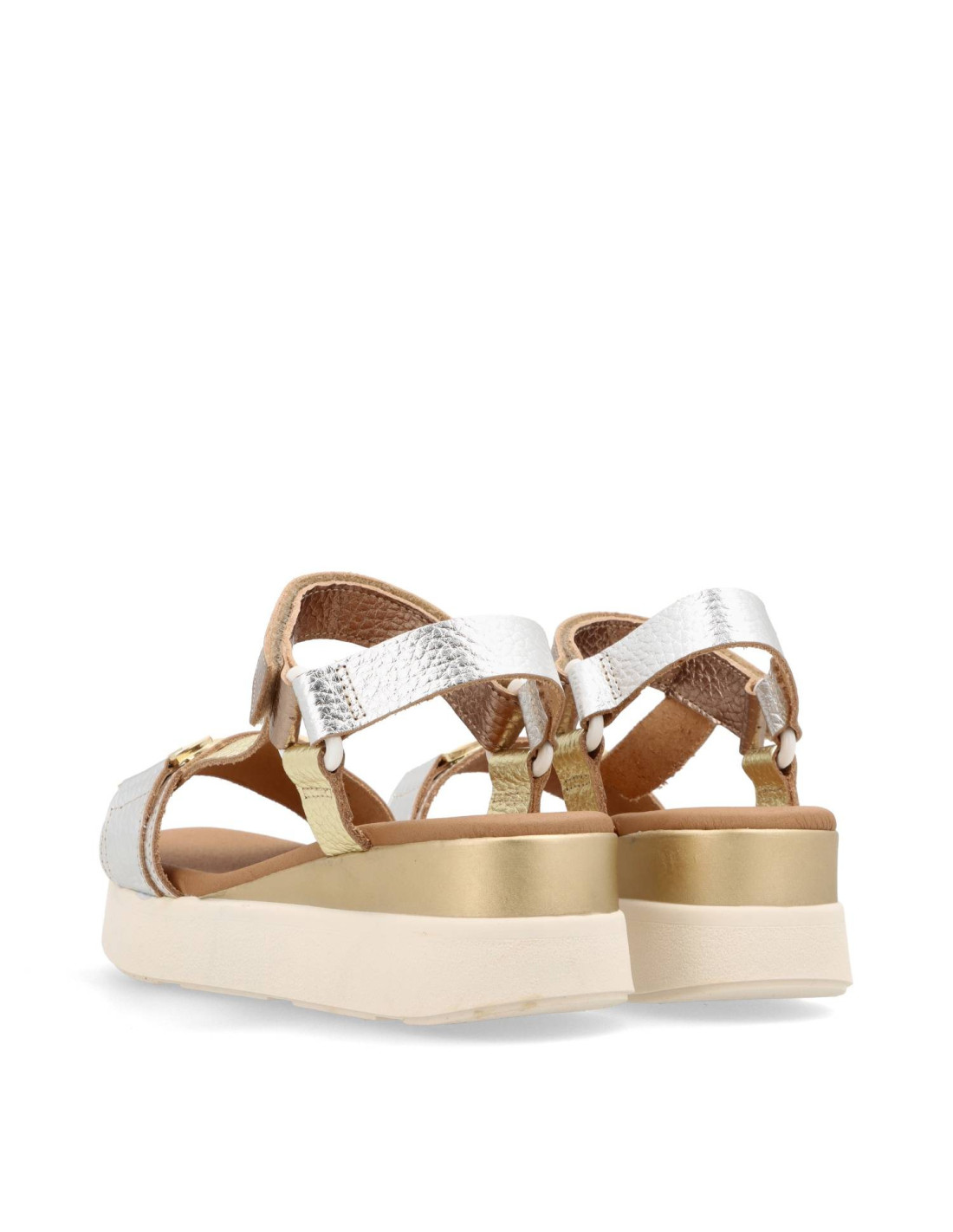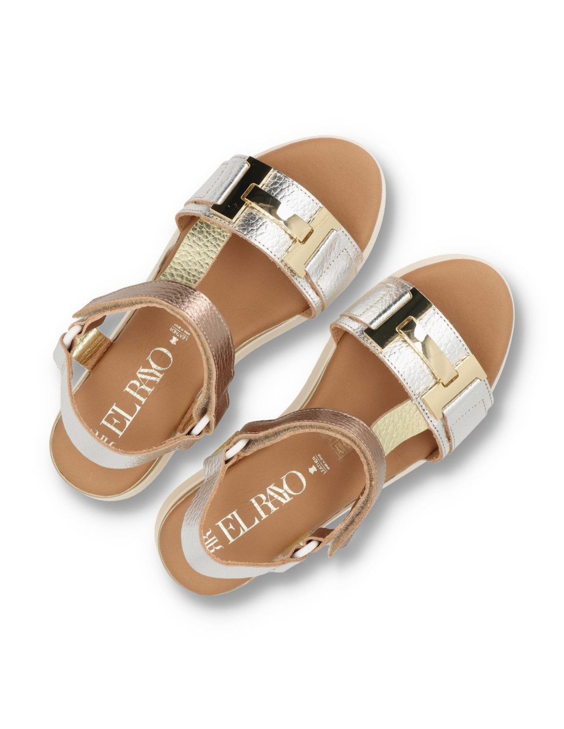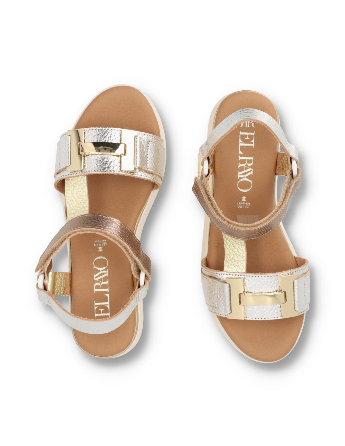 Sandalias de cuña para mujer 5671 de RAYO TRENDS. De piel 100%vacuno acabado metalizado. Talón ajustable con cierre de velcro y detalle metal en la pala con forma de H. Cuña super ligera de poliuretano de unos 5cm de altura. HECHO EN ESPAÑA