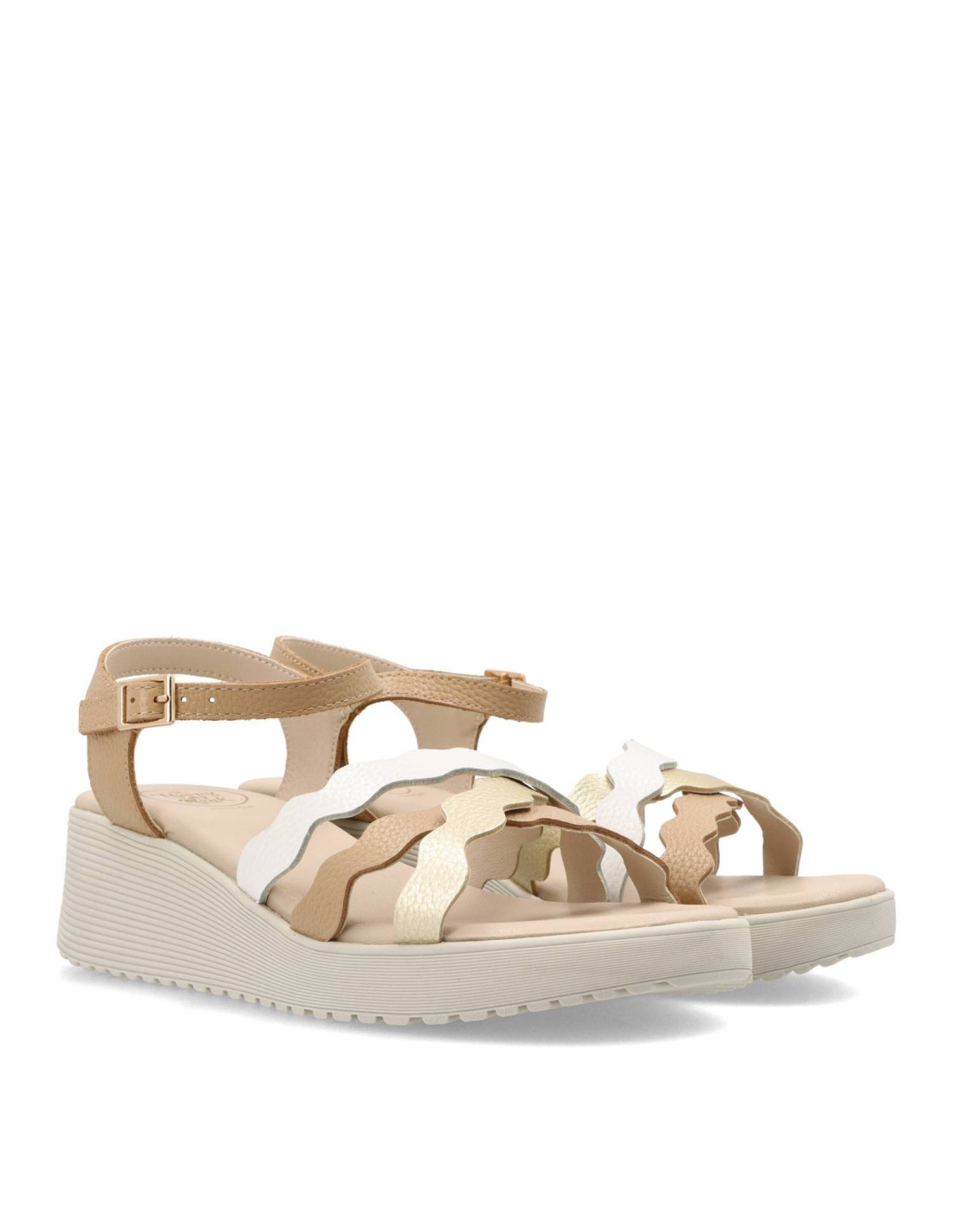 Sandalias con cuña para mujer BANUS-003 de The Happy Monk. Sandalia de tiras cruzadas de piel100%vacuno y planta acolchada. Talón pulsera con hebilla ajustable. Suela de cuña de unos 6cm de altura y super ligera.