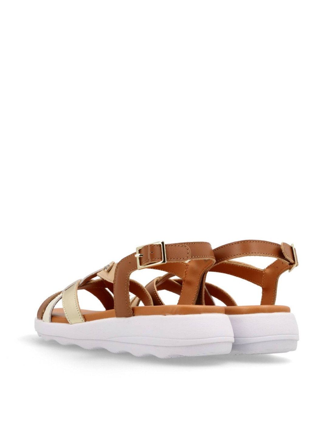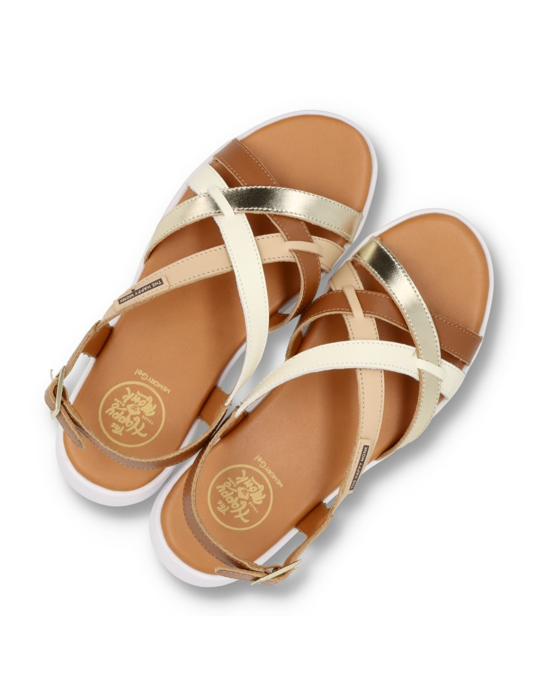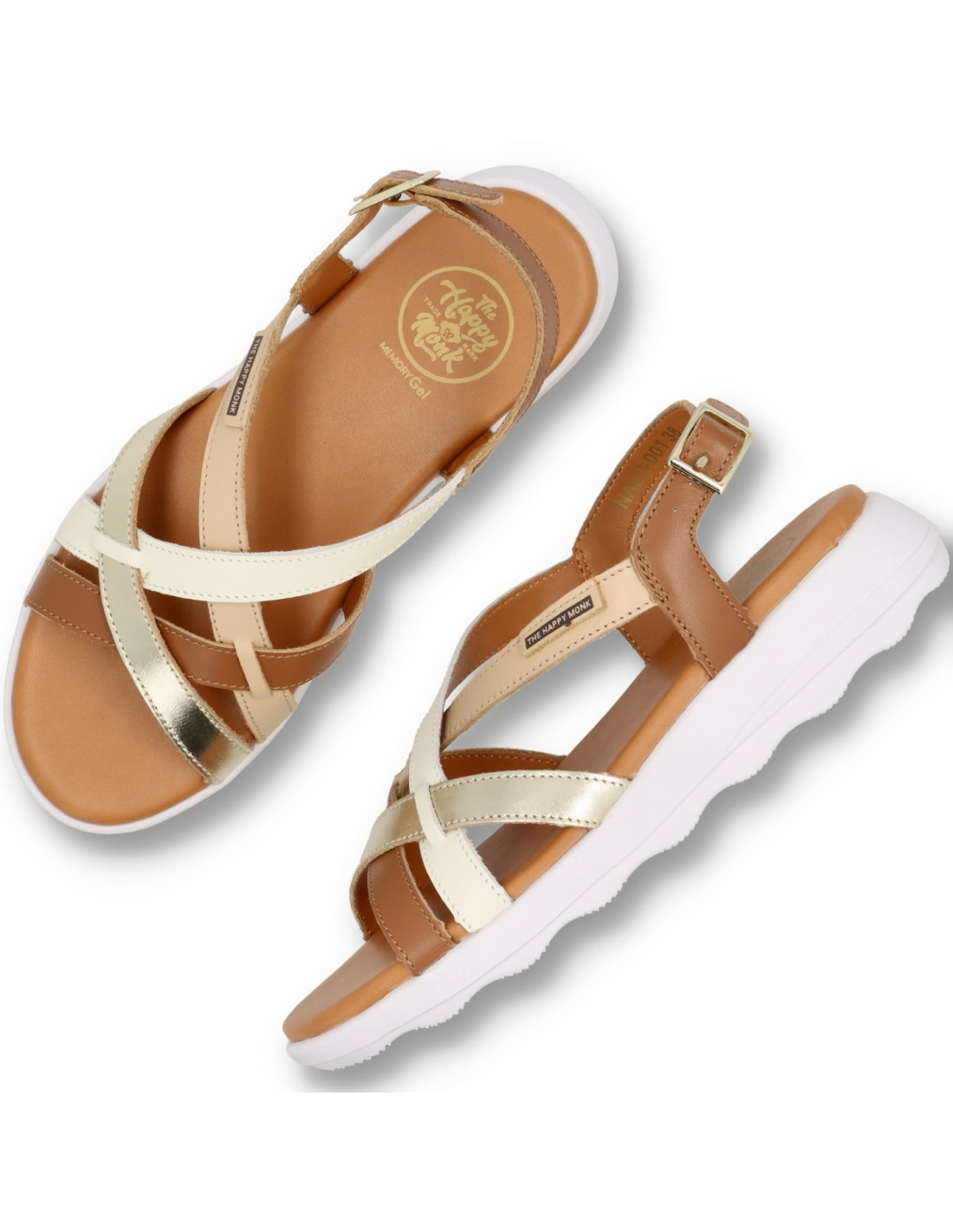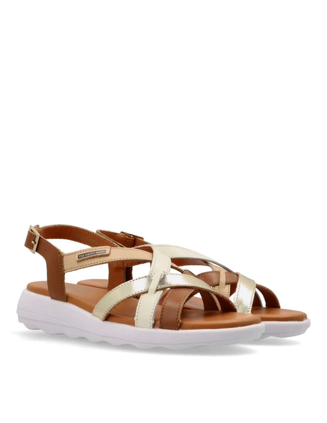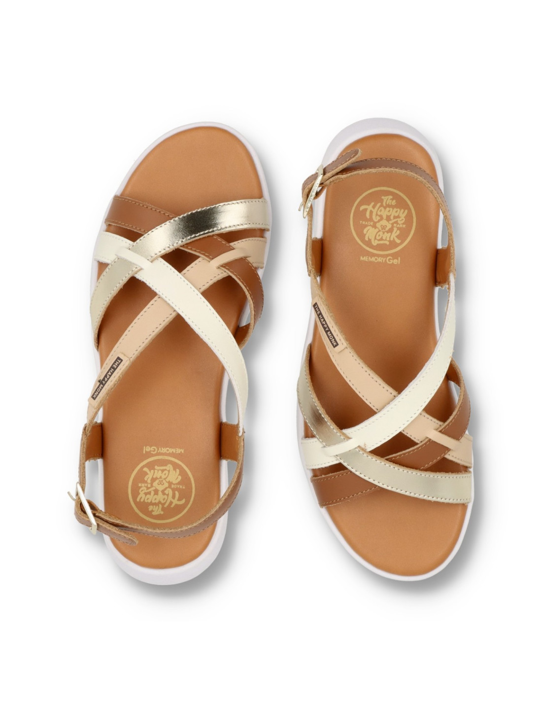 Sandalias planas de mujer NALU-001 de THE HAPPY MONK. De piel 10%vacuno tiras combinadas con talón de hebilla ajustable. Planta memory gel para una pisada más cómoda. Piso super ligero con pequeña cuña de unos 2,5cm de altura.