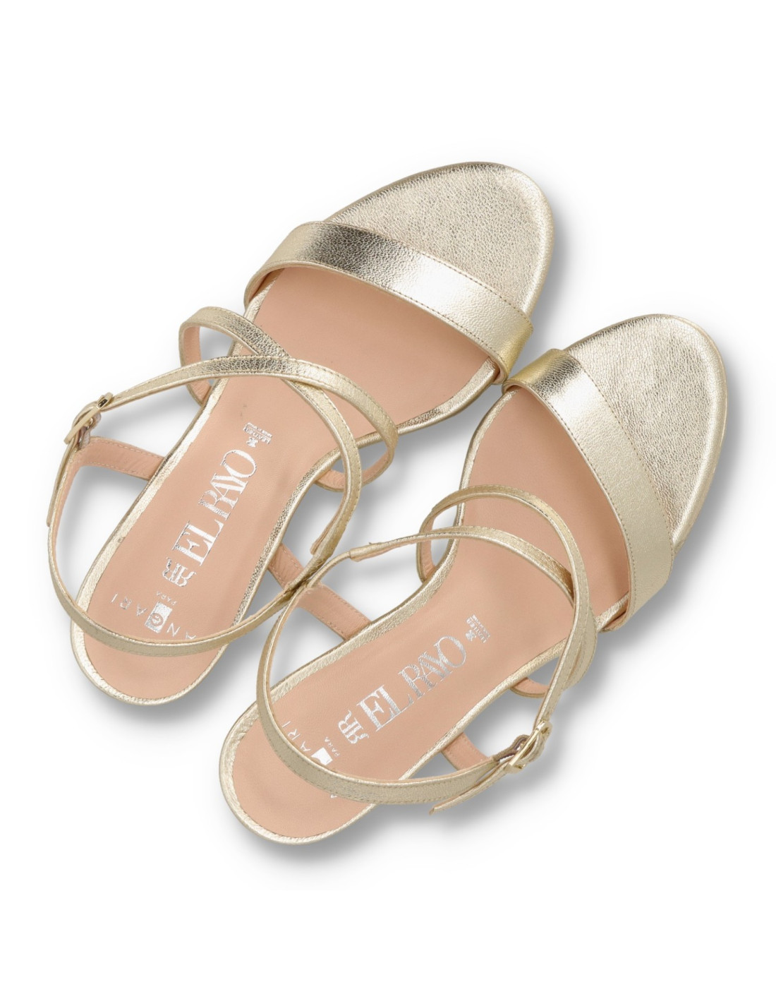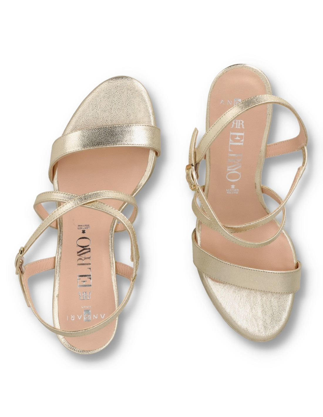 Sandalias de tacón para mujer 52082 de Angari. Sandalia toda de piel 100%vacuno acabado metalizado CHAMPAGNE. Plantilla interior con memory Gel, tiras cruzadas y talón con ajuste mediante hebilla. Tacón de unos 10cm de altura y plataforma delantera de 1cm. HECHO EN ESPAÑA