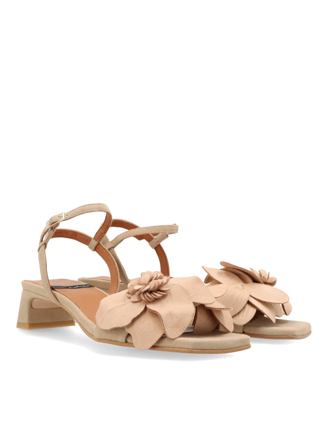 Sandalias de tacón para mujer 25084 de Angel Alarcón. Estas sandalias de horma recta y tacón bajo y comodo. Son de piel de ante de primera calidad. Talón pulsera con hebilla ajustable y planta de gel para una pisada más comoda y confortable. Detalle de flor en la pala. HECHO EN ESPAÑA