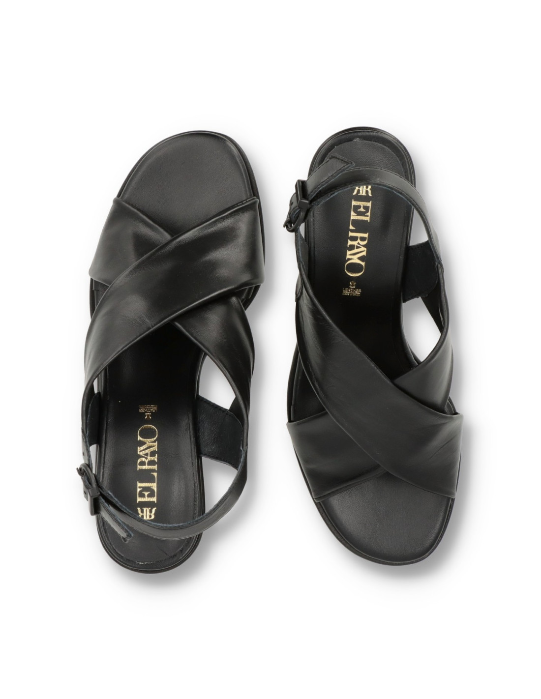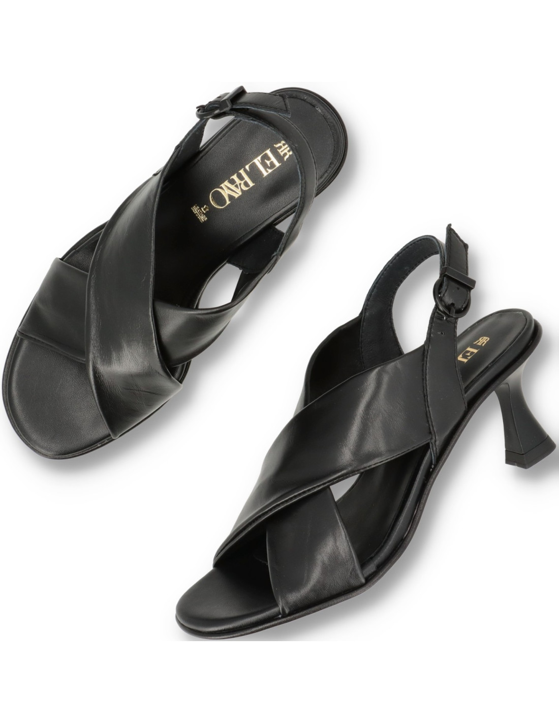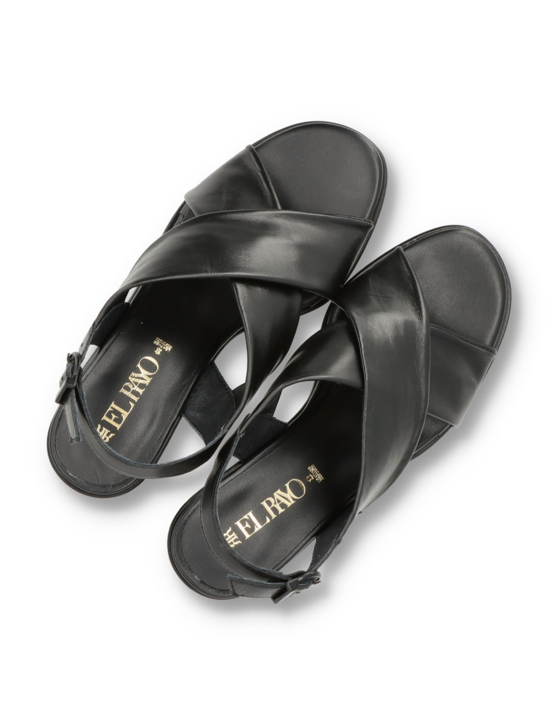 Sandalias de tacón para mujer 45451 de EL RAYO TRENDS. Confeccionada toda en piel 100%vacuno en distintas texturas en color Negro y planta acolchada con espuma de doble densidad para una pisada más comoda. Talón con cierre de hebilla ajustable, el tacón de carrete lacado al tono y de unos 6cm de altura y suela antideslizante flexible. HECHO EN ESPAÑA