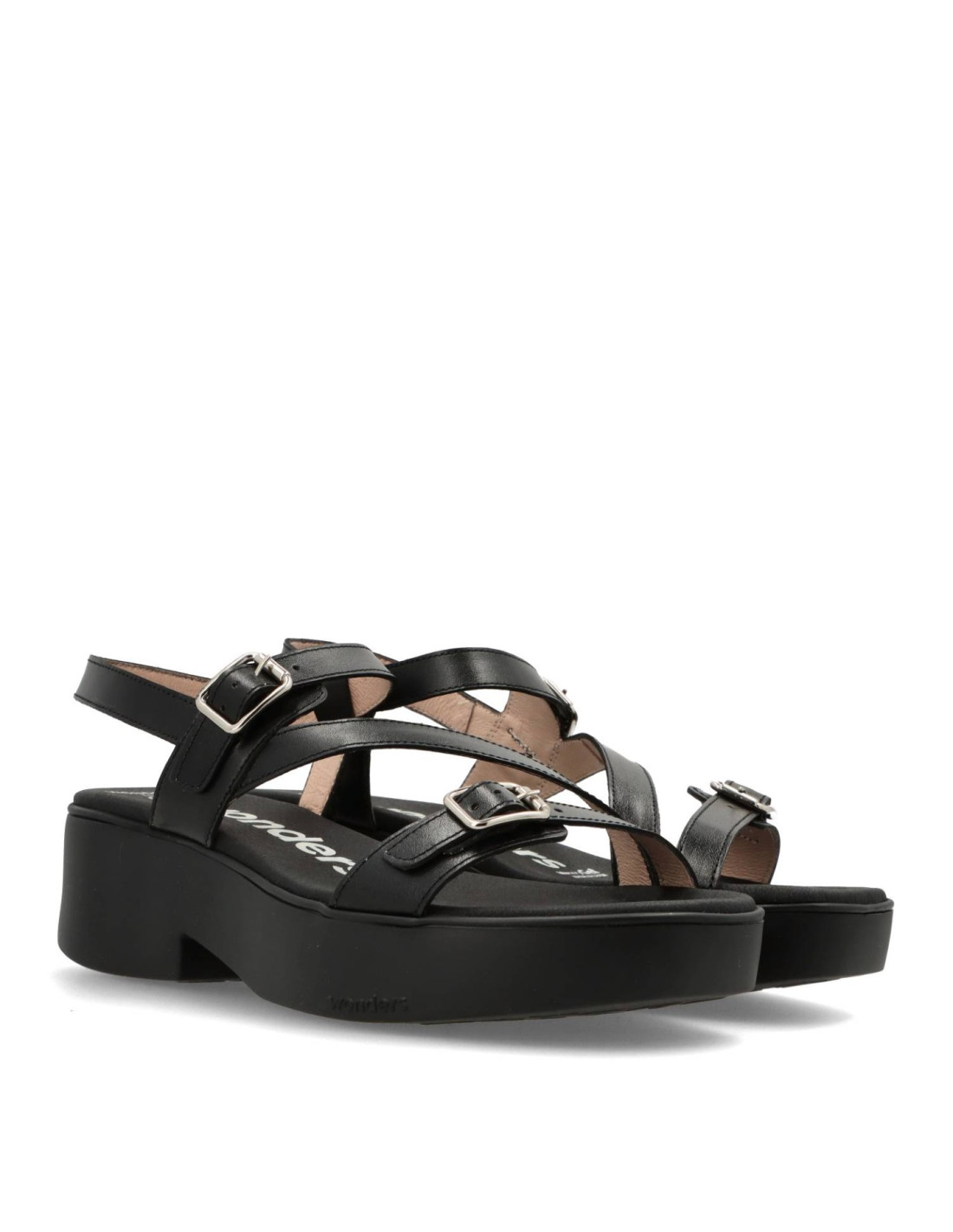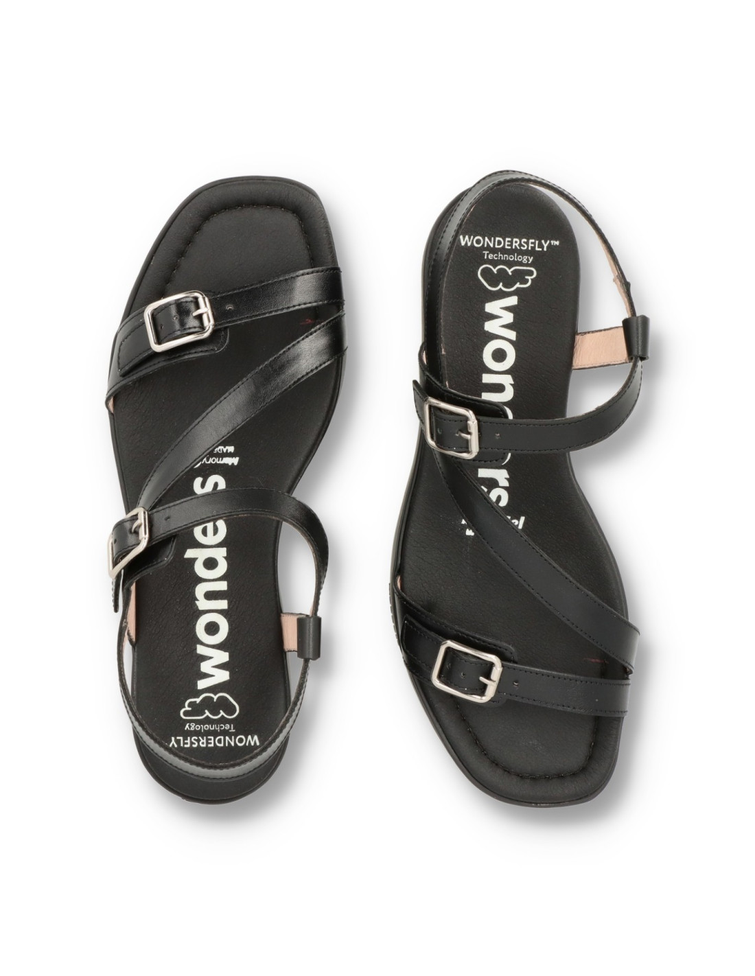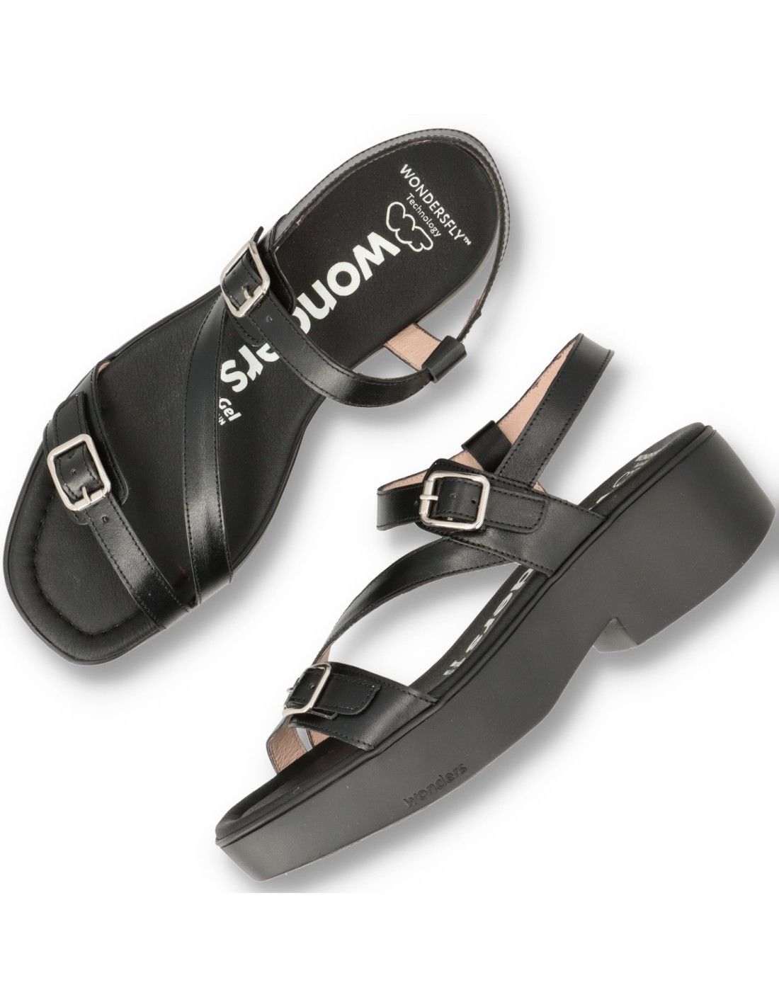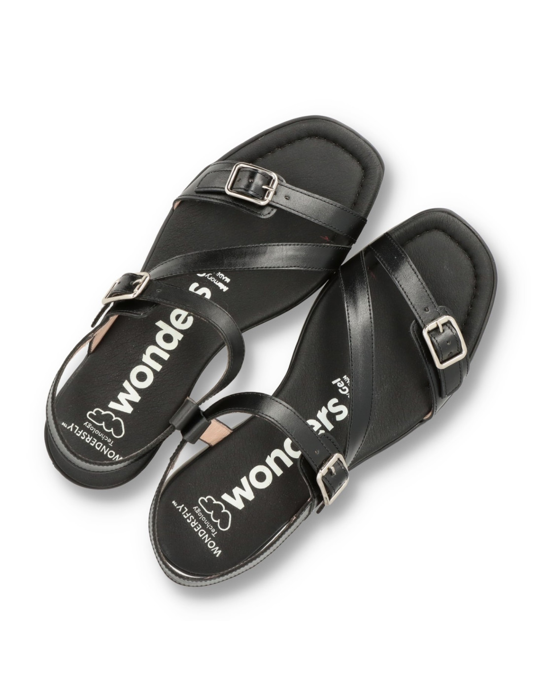 Sandalia de tacón para mujer B-1003 de wonders. Sandalias de tacón VENUS 01 fabricadas en piel acabado charol en color negro. Su diseño de tiras limpias abraza el empeine con una estética minimal y muy femenina, mientras que la pulsera al tobillo con hebilla aporta sujeción y un ajuste perfecto. Su suela, desarrollada con tecnología WondersFly™, proporciona una ligereza incomparable y un confort extraordinario. La plantilla interior de MemoryGel se adapta perfectamente al pie, ofreciendo una comodidad excepcional en cada paso. Prepárate para sentir la sensación #YesWeFly. Wonders promueve la sostenibilidad avalada por LEATHERWORKINGGROUP.