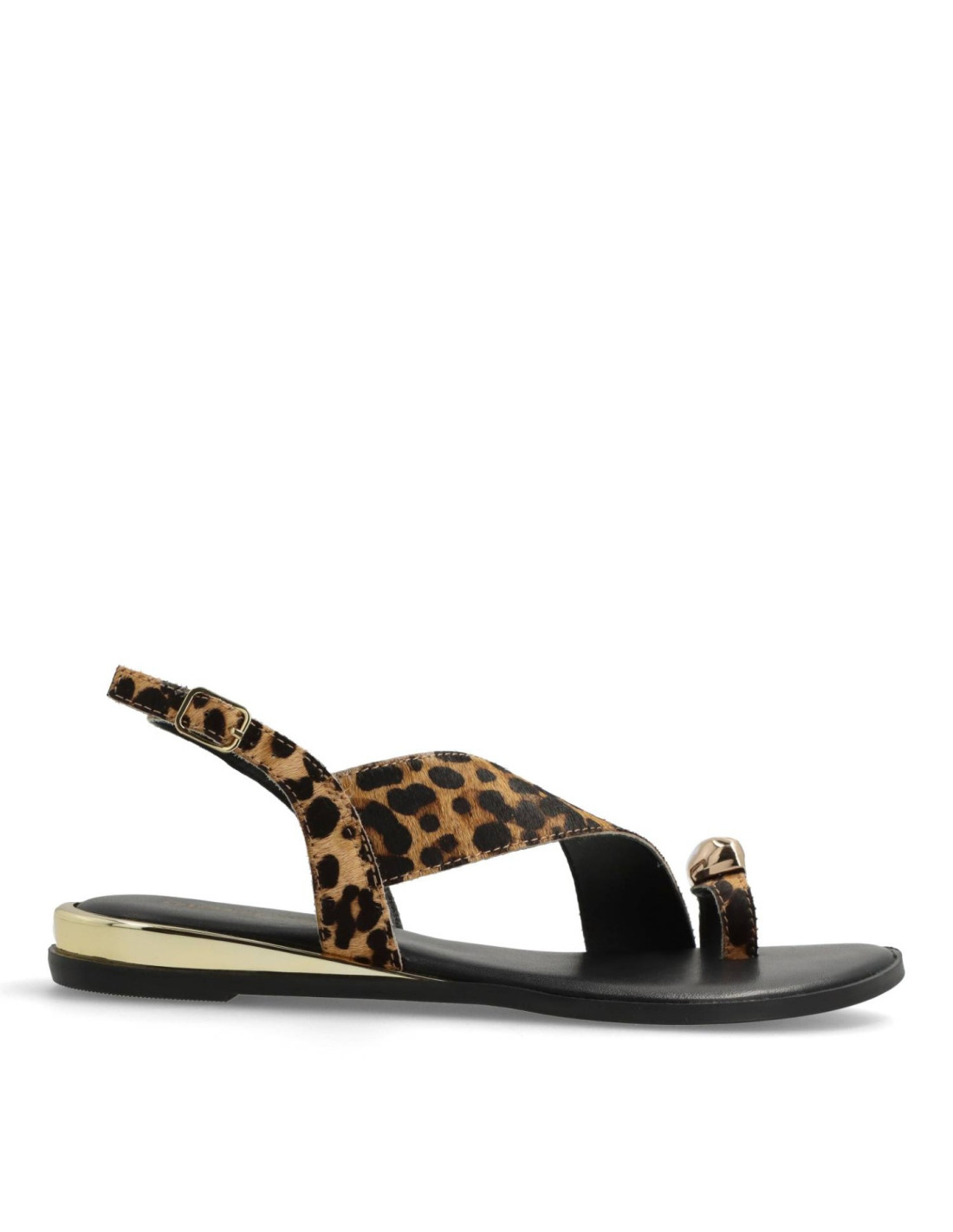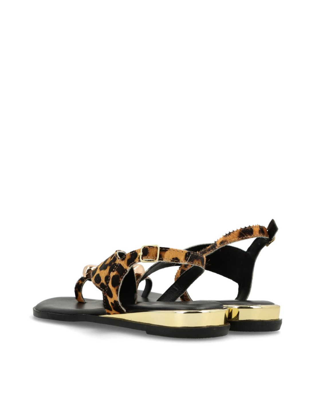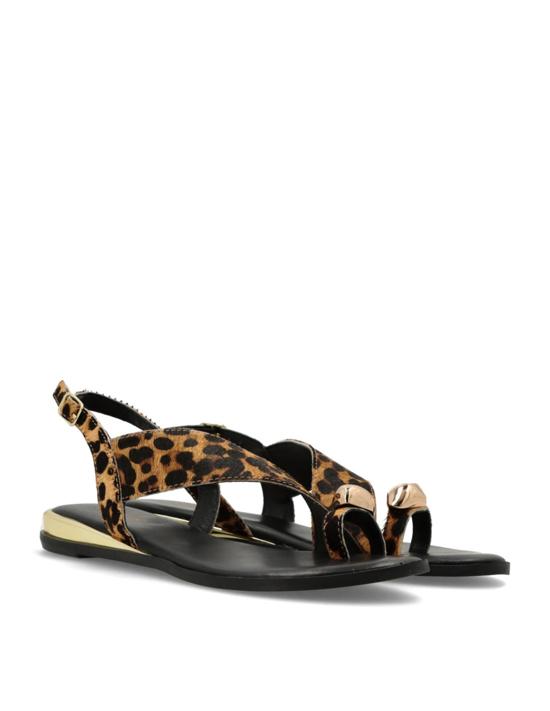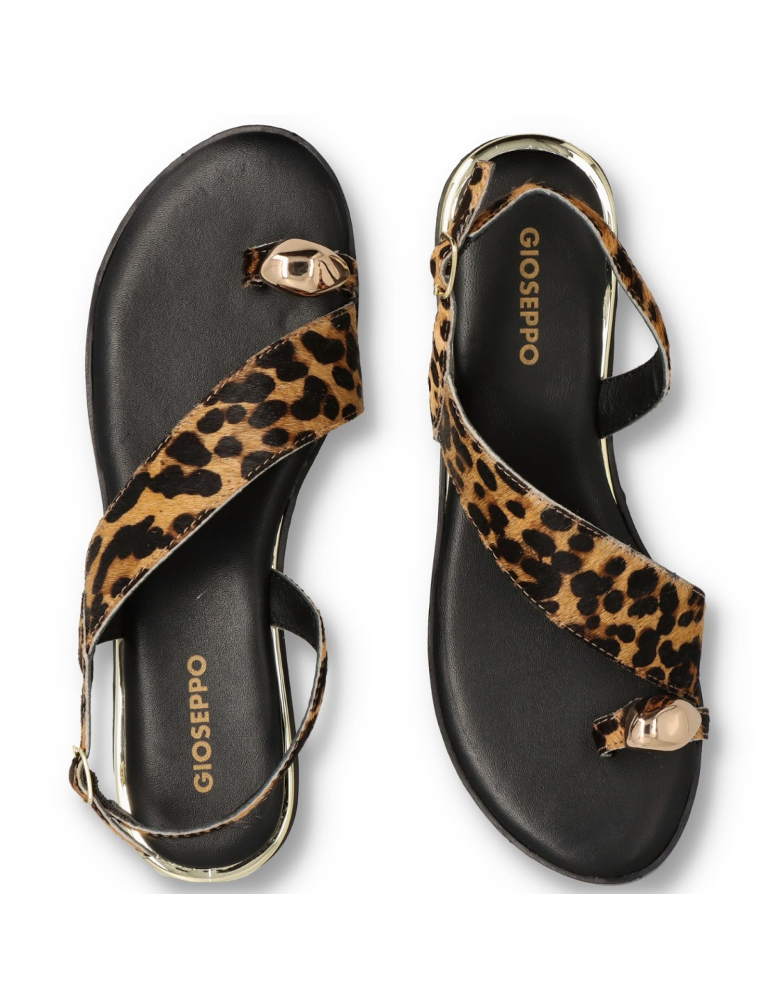 Sandalias planas de mujer 78191-MAIRO de Gioseppo. Sandalias planas de piel con estampado de leopardo tipo pelo. Anillo con joya y cerco metalizado en acabado oro. Cuentan con planta acolchada y cierres ajustables en el tobillo.