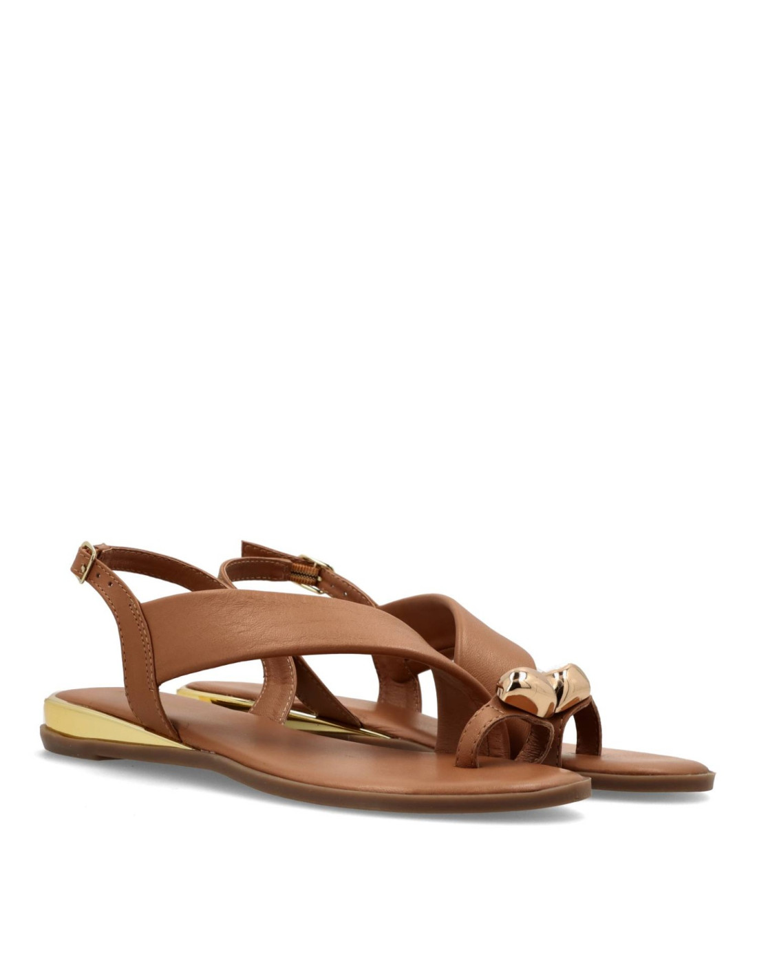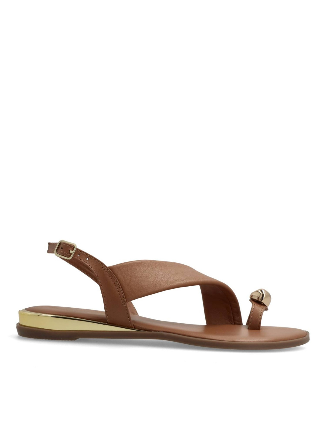 Sandalias planas de mujer 79072-STONY de Gioseppo. Sandalias planas de piel con ribete metálico con acabado dorado. Anilla con joya. Cuentan con plantilla acolchada y correas ajustables en el tobillo.