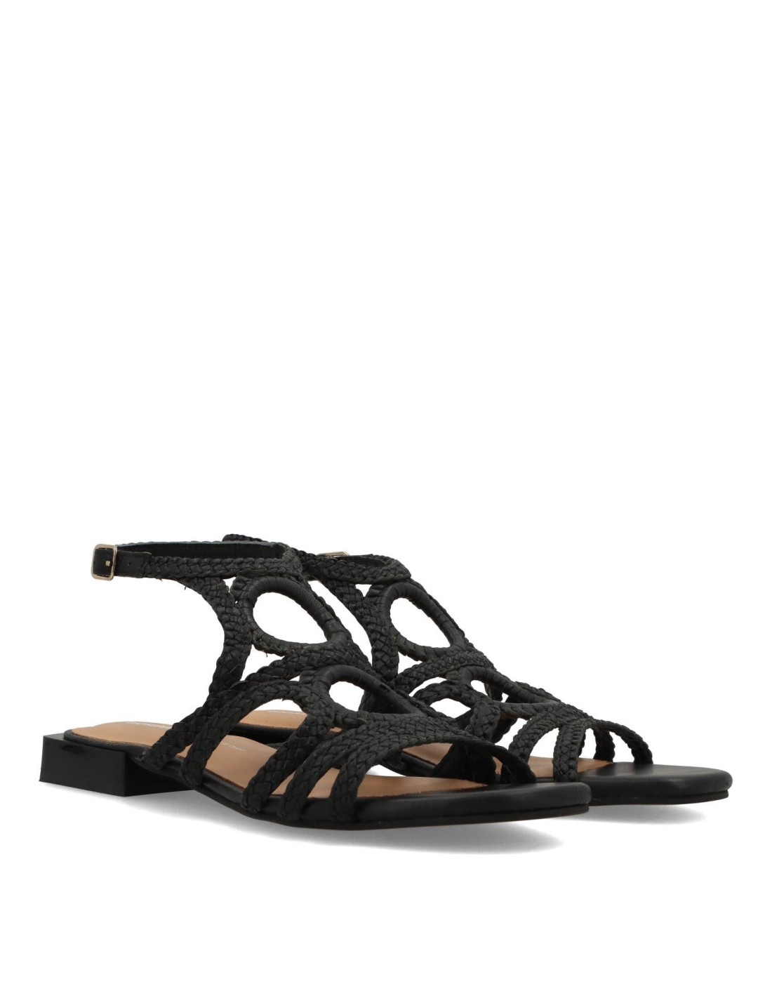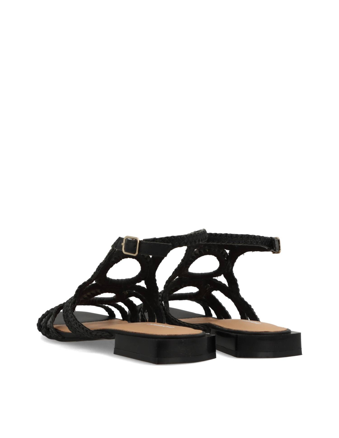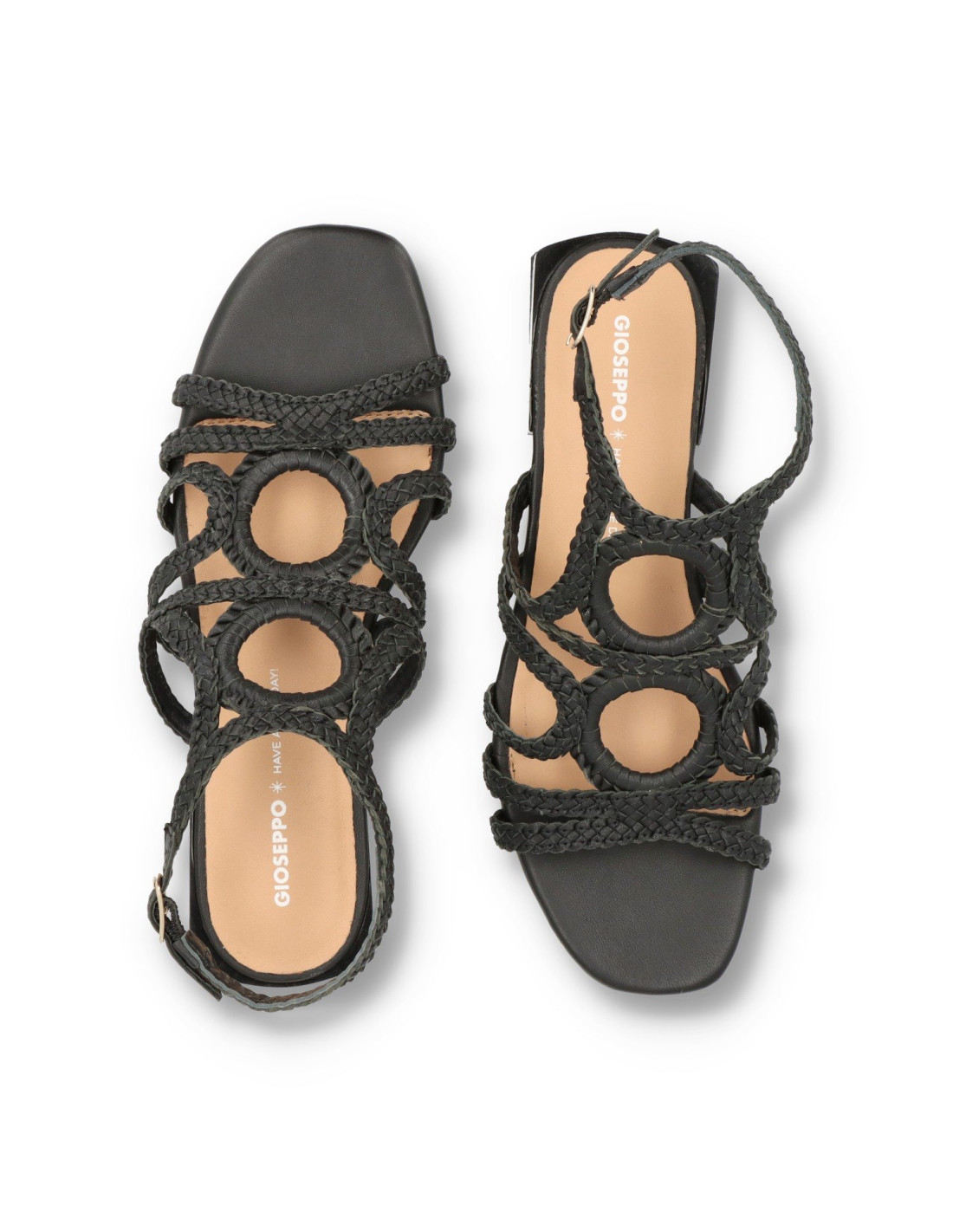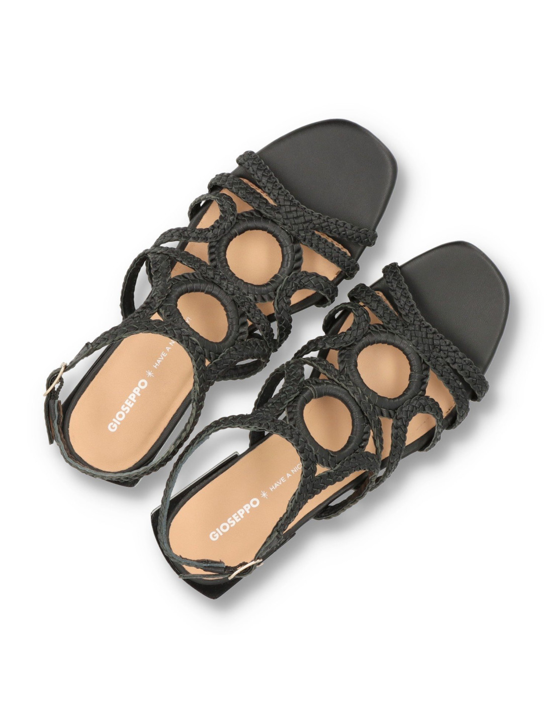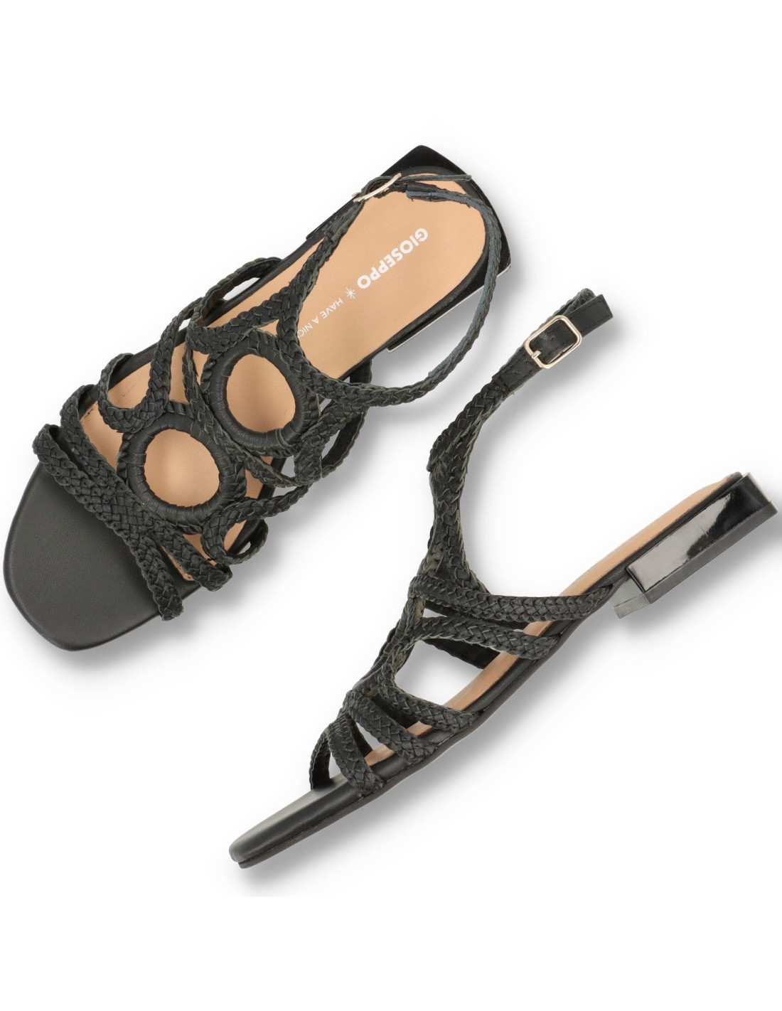 Sandalias planas de mujer 75455-BIRCH de GIOSEPPO. Sandalias trenzadas de piel 100%CAPRINO, con planta acolchada para una pisada más comoda. Talón tobillero con tira de hebilla ajustable.