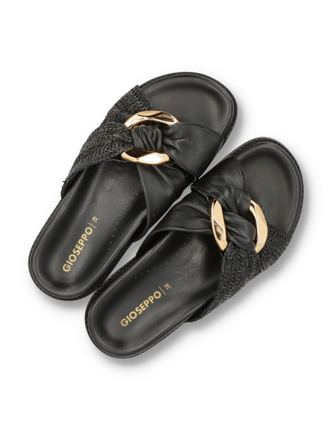 Sandalias planas de mujer 75446-TISBURY de GIOSEPPO. Sandalia estilo bio con planta anatómica acolchada, de piel Ovina y tiras de rafia con broche metálico. Estilo y confort en una sola pieza.
