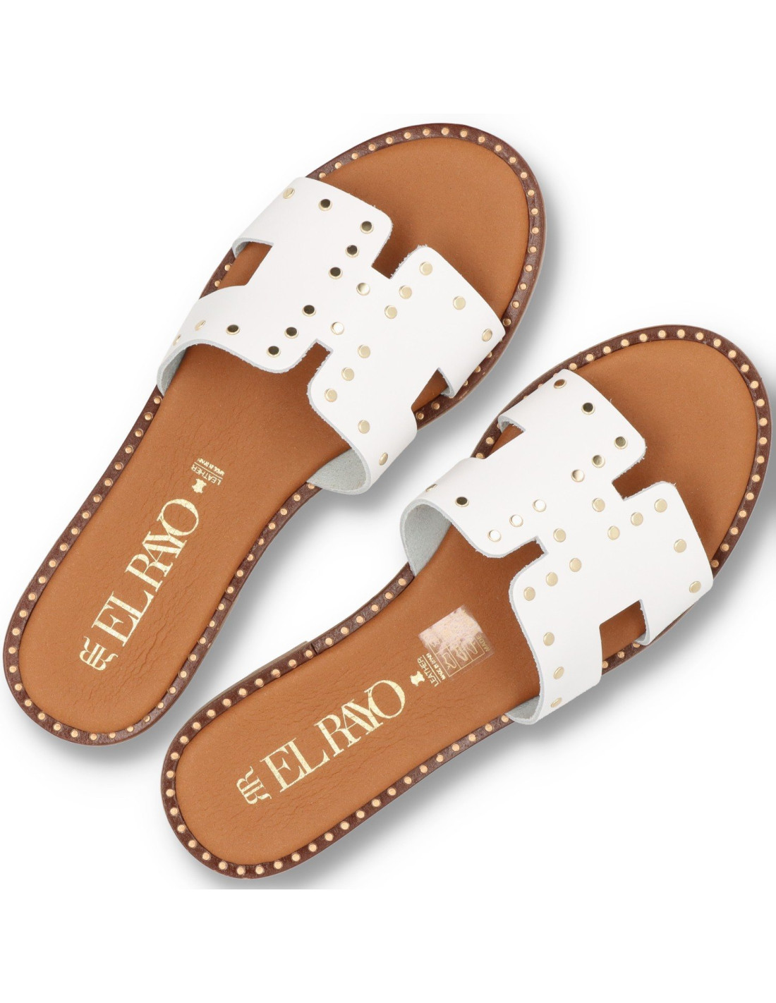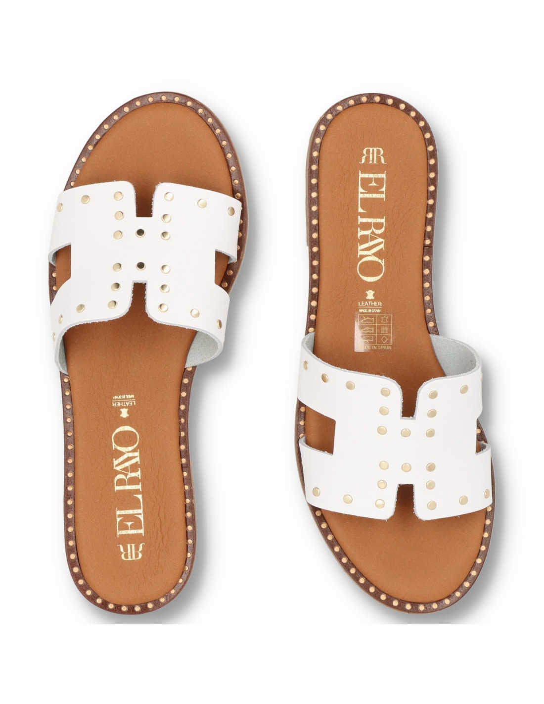 Sandalias planas de mujer 5576 de RAYO TRENDS. Confeccionada tod en piel 100%vacuno y planta de gel. Detalle en pala y cerco con tachas doradas, suela de goma flexible y ligera. HECHO EN ESPAÑA