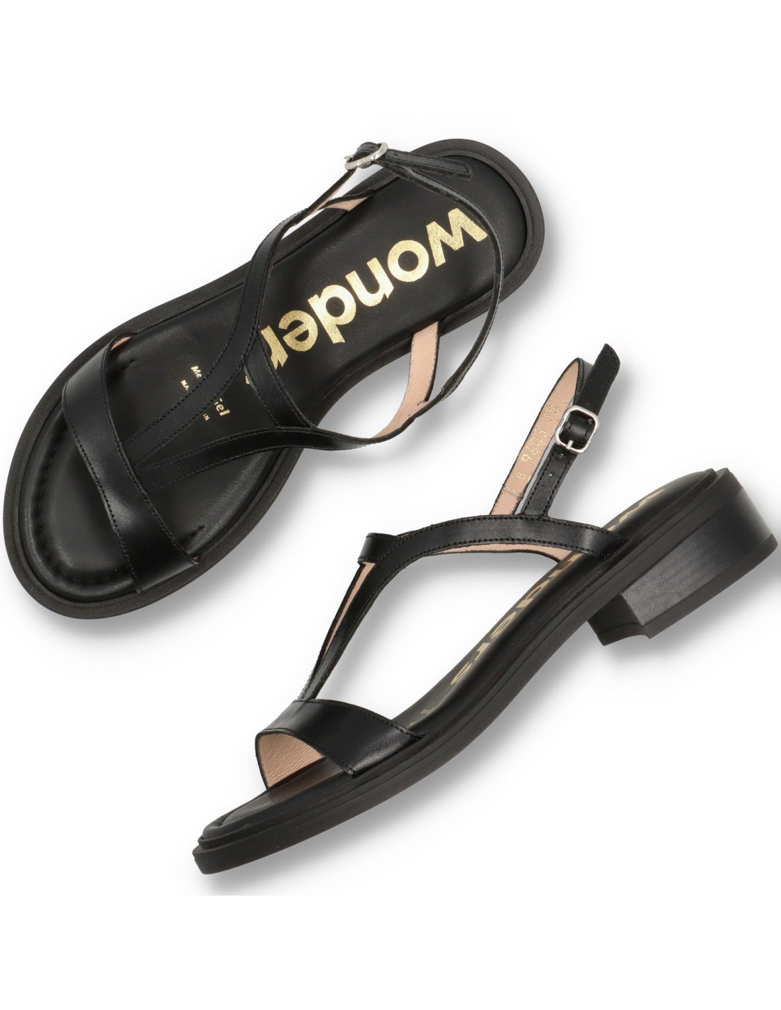 Sandalias planas de mujer B-9605 de Wonders. fabricadas en piel 100% vacuno, con planta acolchada y talón con hebilla ajustable. Piso de goma flexible y ligero con tacón ancho de unos 2cm de altura. HECHO EN ESPAÑA.
